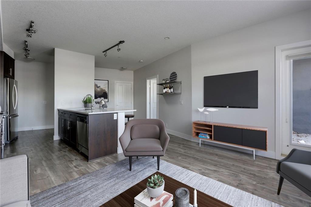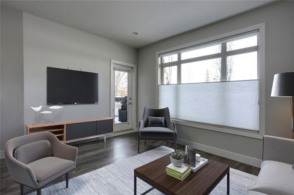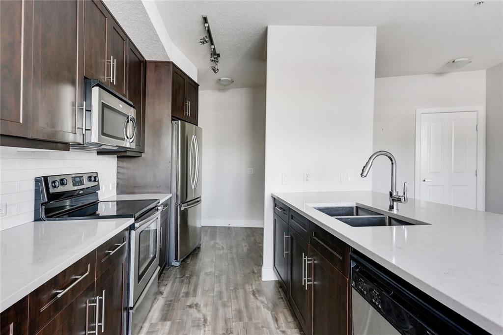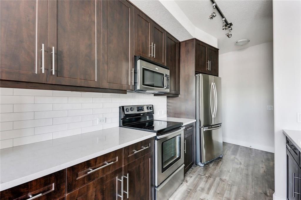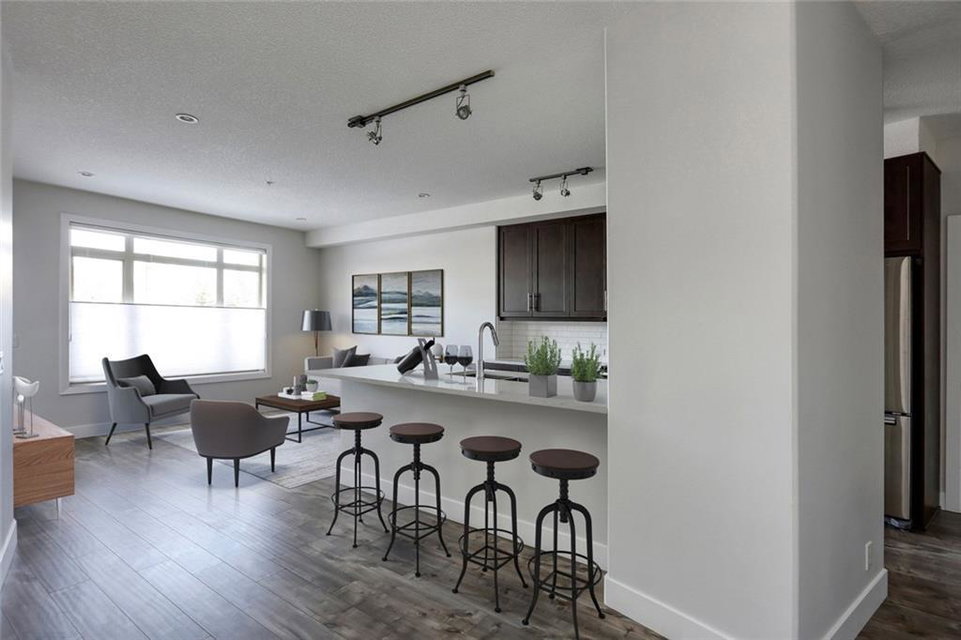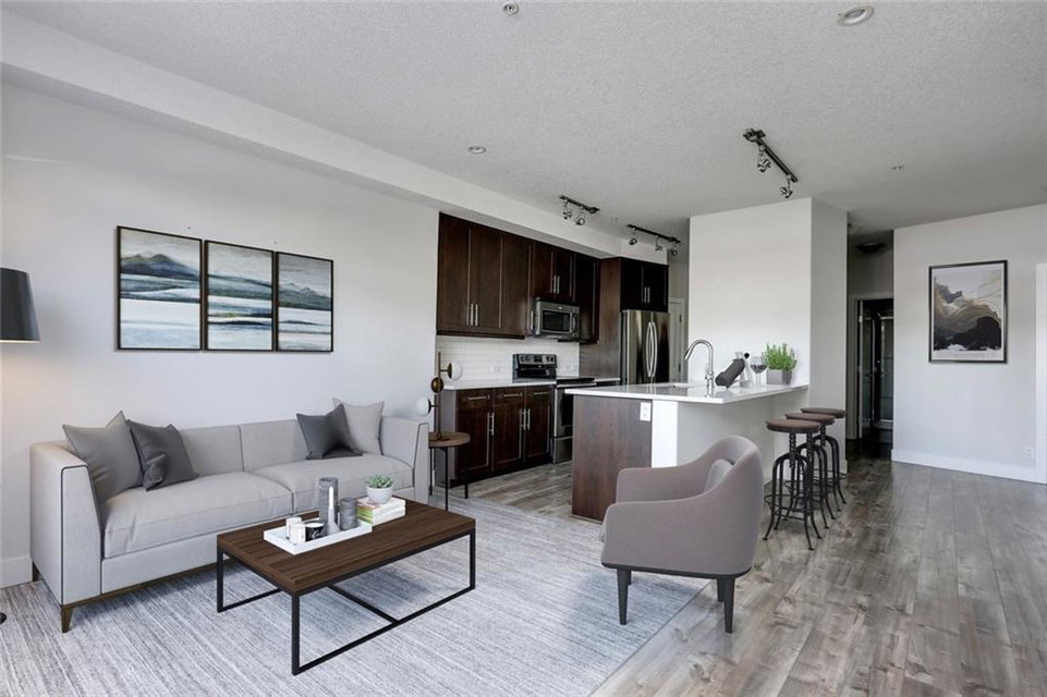 Completely renovated and updated 2 bathroom, 1 bedroom + den condo located in the desirable community of Killarney. The open concept living and dining area provide the perfect space for entertaining. Kitchen is complete with quartz countertops including an expansive 8′ quartz peninsula that offers ample room for dining. New laminate flooring flows throughout the entire condo! The large master bedroom has ample room for a king bed and has a large walk-through closet that leads into the full ensuite. A large den provides the perfect space for a home office, TV room, or second bedroom, which is located next to the second full bathroom with walk-in shower. Titled underground parking stall keeps your vehicle safe and warm all year round. Walk to the LRT in minutes, take advantage of the Killarney Aquatic Centre across the street or relax in the two-city-block park located directly across the street. Newer building with a fully renovated unit in the heart of Killarney – Main Floor PET FRIENDLY – so convenient!