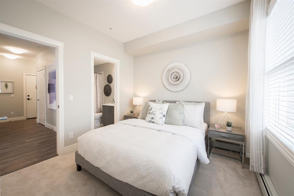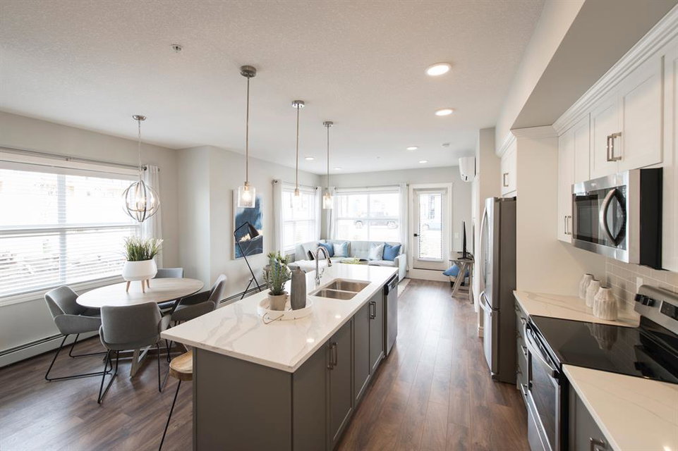 suite features a wonderful layout. This home is finished in the ‘New Nordic’ Designer Interior featuring sleek two-toned cabinetry mixed with warm woods and matte black hardware with laminate flooring, quartz countertops and designer lighting. The dream-like ensuite features a hard-to-find separate soaker tub and tiled shower, along with double sinks and a large walk-in closet. The Argento is thoughtfully planned to be a spacious, easy to live in space with lots of necessary storage components for a clean and tidy appearance. The kitchen and living space are centrally located, separating the bedrooms for privacy. The second bedroom has access to the second bathroom for ultimate privacy and convenience. The home is finished with 2 titled underground parking stalls and a storage locker. The unit is finished with a south-facing patio and A/C unit, perfect for the summer. *Please note: Photos are from a show suite. Actual homes finish will vary.