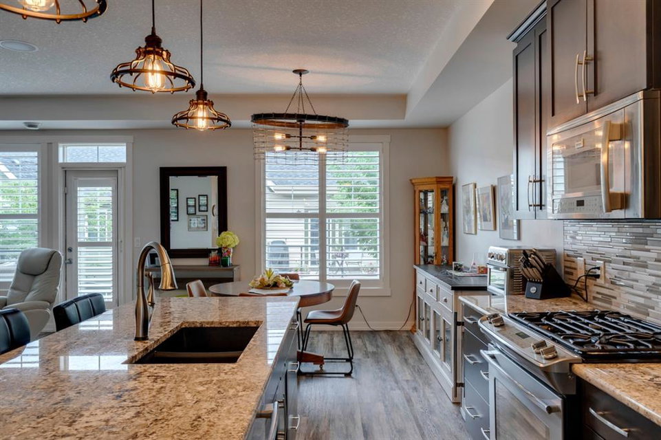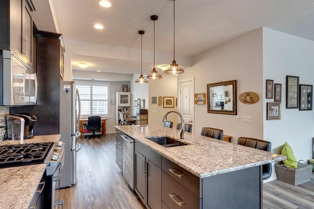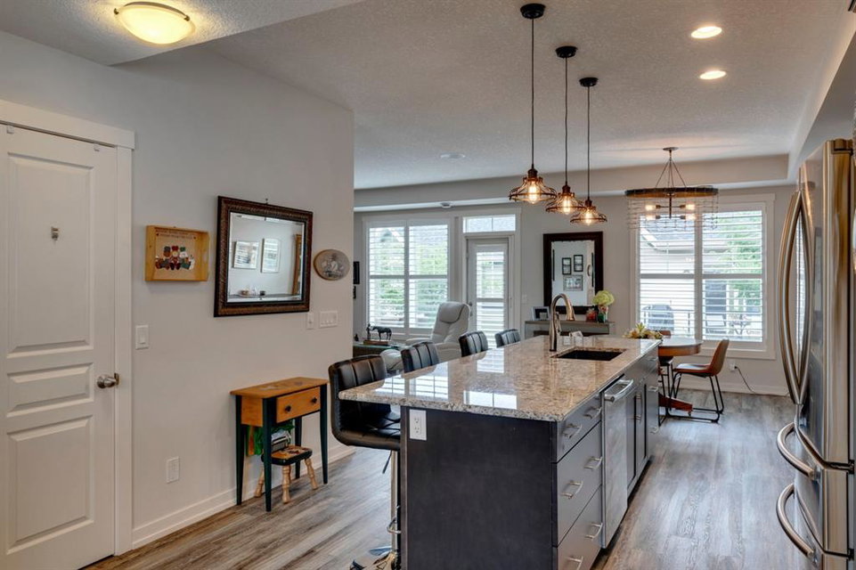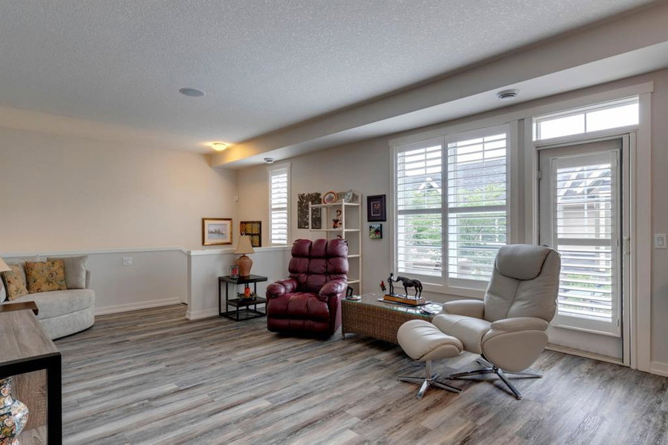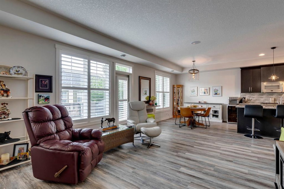 The most stunning unit at Mosaic Mirage is available and has new vinyl plank flooring, new carpet and fresh paint! This beautiful home features over 1,340 sq.ft. of living space on one level with a private double attached garage. Located in the walkable community of McKenzie Towne, this home is minutes away from all the amenities of High Street. Complete with 2 bedrooms + den (which could easily be converted to a third bedroom), this spacious bungalow style home is fully upgraded throughout. Enjoy custom lighting, cabinetry & countertops and media upgrades that include ceiling speakers. Enjoy your private WEST facing 25’x8′ balcony all summer long. If it gets too warm, step inside and enjoy the central air-conditioning (an absolute MUST in these units). This home is perfectly set up for entertaining and is located just a few blocks from all the amenities of High Street. With so many custom options, including Hunter Douglas Palm Beach window coverings, a gas range, central vac rough-in, and a partially finished garage and basement. Enjoy the West exposure you deserve for such a beautiful balcony! This home is perfect for a small family, professionals or those looking to downsize. The property is like-new and fully move-in ready with new toilets and a new hot water tank (2021).