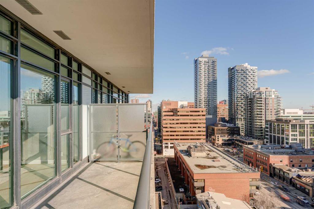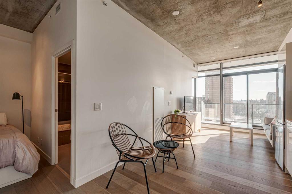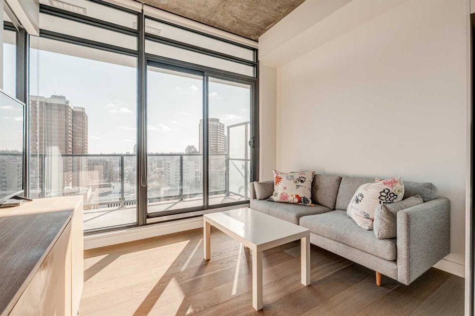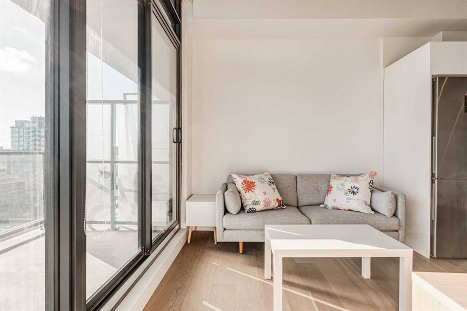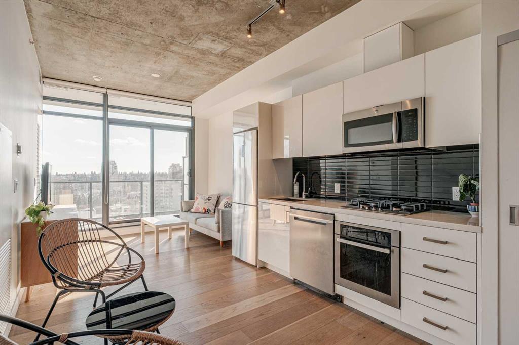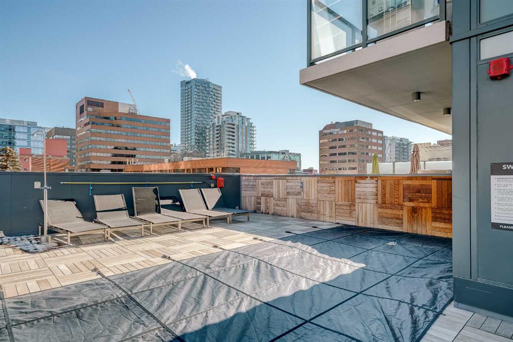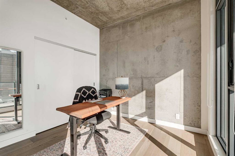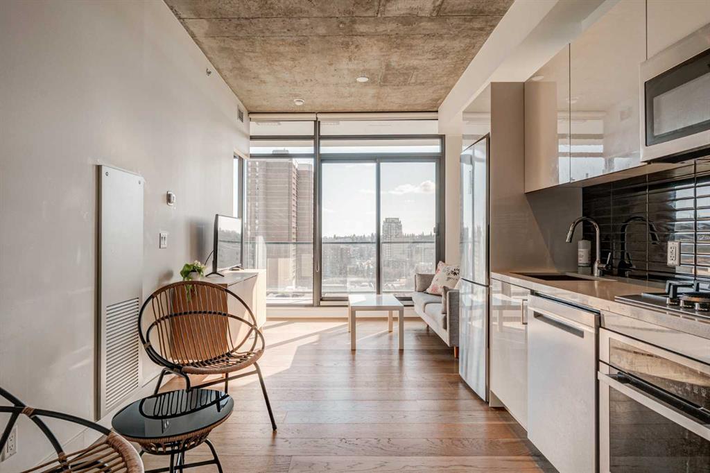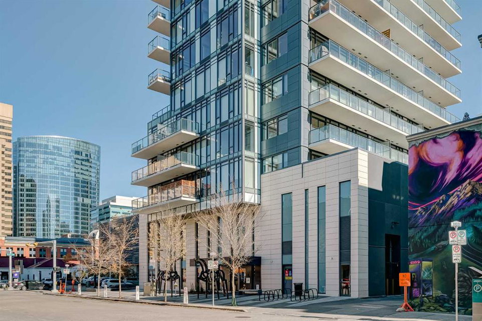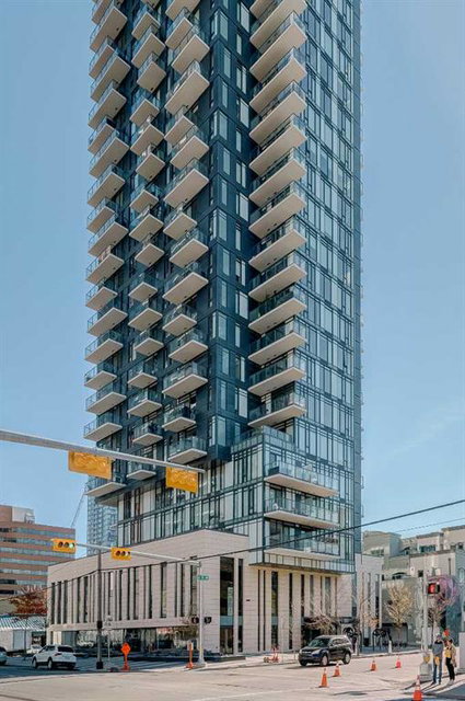 Welcome to this over 500 square foot condo located in the desirable and AirBnB friendly 6th and Tenth building in the heart of the Beltline that offers downtown living at its finest. This well-kept 1 bedroom + den, 1 bathroom unit is located on the 11th floor of this quiet concrete building and offers the perfect opportunity for first-time buyers or investors. The dedicated entryway greets you as you enter the home and newer engineered hardwood flooring flows throughout the unit. The main living area features an open-concept layout with 9-foot exposed concrete ceilings and South-facing floor to ceiling windows that flood the property with natural light throughout the day. The kitchen features quartz countertops, amble cabinetry and storage, and stainless steel appliances, including a gas cooktop and a built-in oven. The kitchen is open to the dining and living areas – making this the perfect space for entertaining friends and family. The spacious bedroom features a large double closet with built-ins and also offers floor to ceiling windows with unobstructed stunning views of downtown. The additional den space offers a great flex area that can be used as an additional bedroom if desired. The expansive South-facing balcony offers a great space to enjoy the warmer summer months and features a gas line for your barbeque and plenty of space for patio furniture. Completing this property is in-unit laundry for your convenience and central air conditioning. Situated within one of the most sought-after buildings in Calgary, this unit offers access to a plethora of amenities including a sky garden lounge with an outdoor pool, a landscaped terrace, a large fitness center, secure bike storage, and concierge. This pet-friendly building has no weight restrictions for dogs and only requires board approval. Centrally located in the heart of the Beltline, this property features the perfect walkable location and is only a short walk to nearby restaurants, cafes, shopping, and entertainment. Within only a 2 minute walk you have top restaurants like Orchard Restaurant, Bridgette Bar, and Pampa Brazilian Steakhouse. 6th and Tenth is one of very few buildings in downtown Calgary that allows for short-term rentals, making this property a great opportunity for investors or buyers looking for their first home. Don’t miss out on this incredible opportunity in the Beltline!