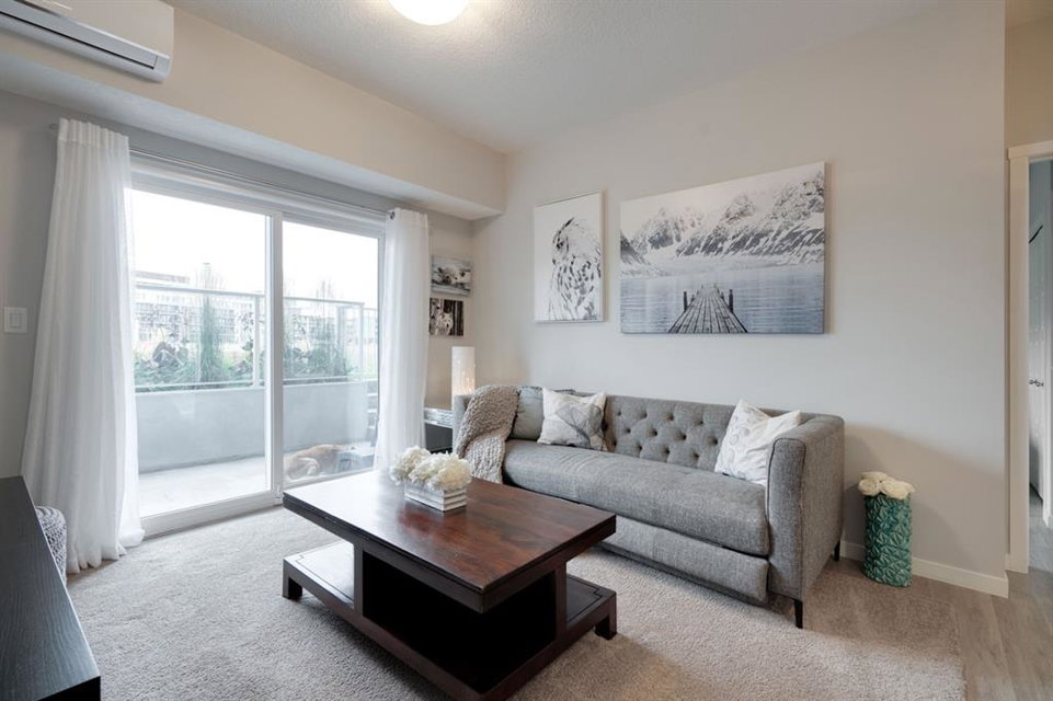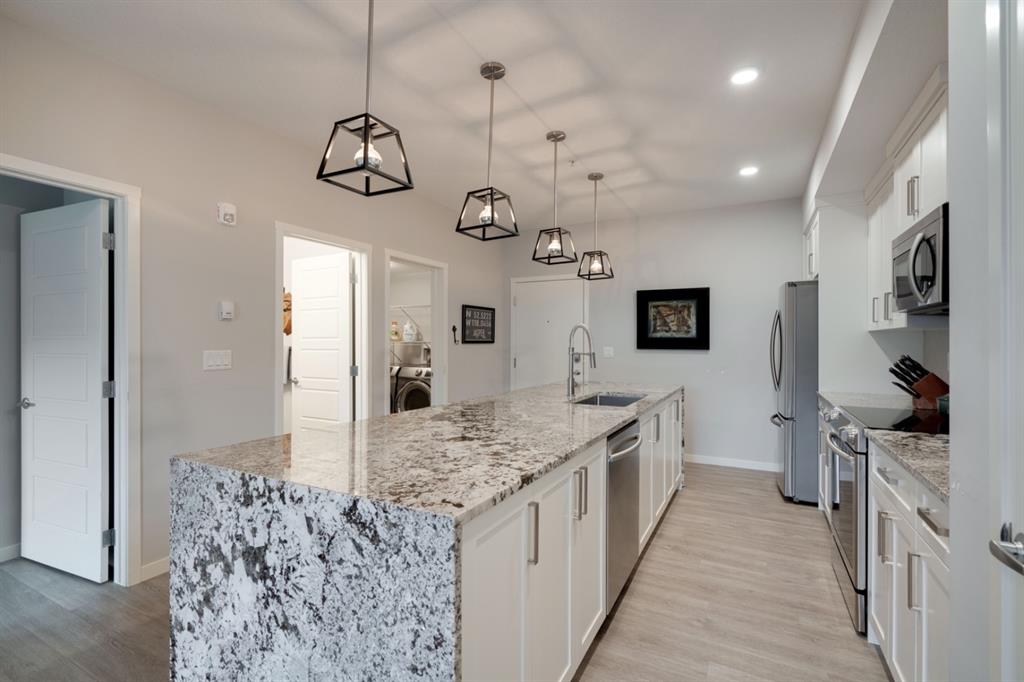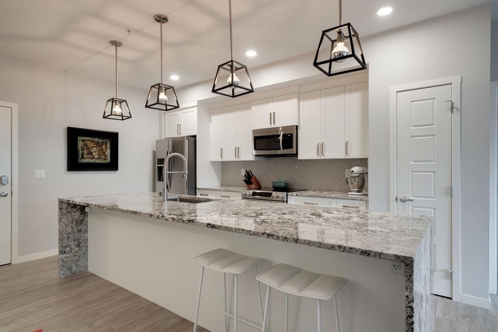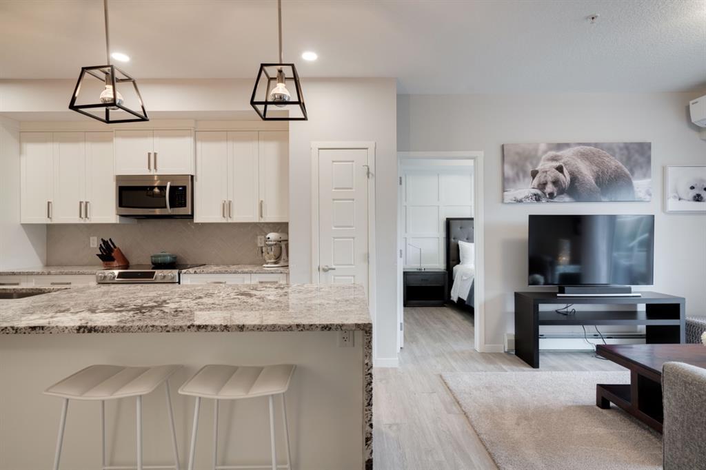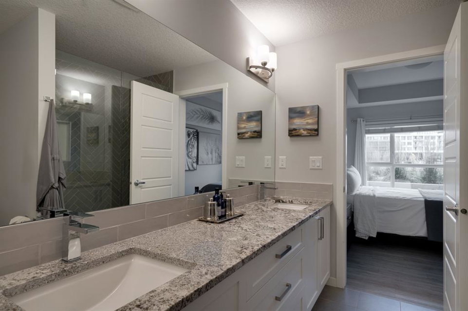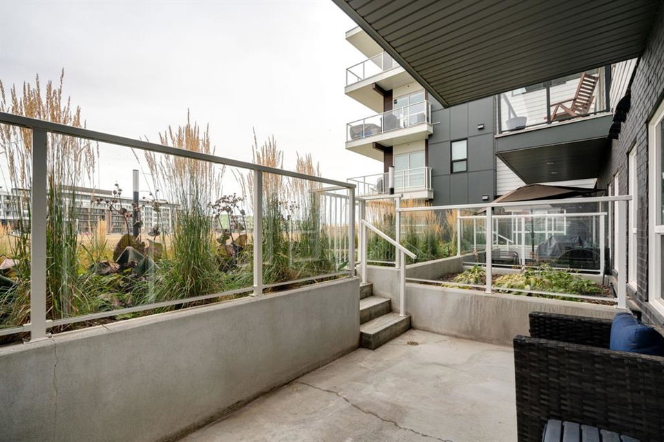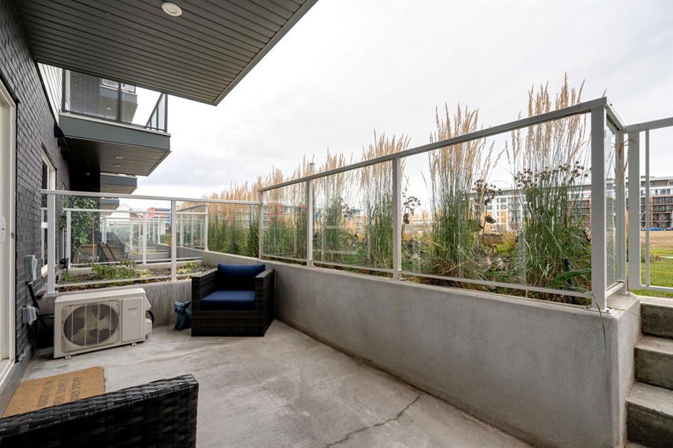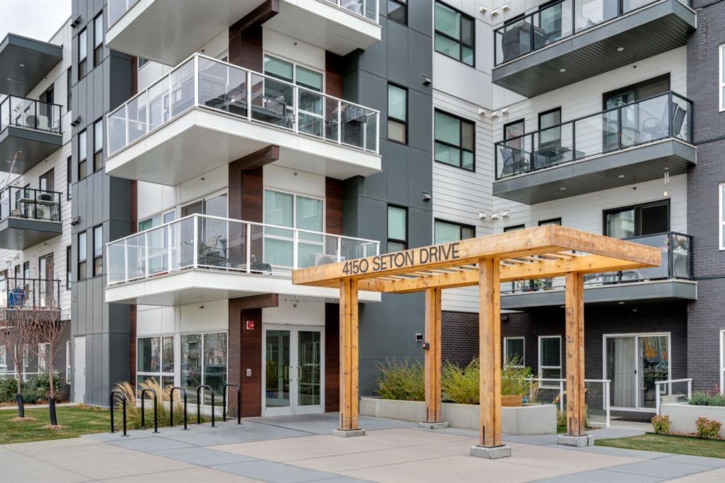 This well-maintained 2 bedroom, 2 bathroom main-level condo offers incredible value and is perfect for a young couple, investor or those looking to downsize. This well located unit overlooks a 16 acres park providing a natural surrounding not found in many condos while also being steps away from the South Health Campus, YMCA and the Seton Retail shopping district. The bright and open layout allows natural light into the entire home all day long. The open concept living area includes a large kitchen that overlooks the living area and has an oversized granite island for dining. The large living area provides the perfect space for entertaining and overlooks the 16 acre park. The home is finished with timeless full height white cabinetry, luxury vinyl plank flooring, granite countertops, extended island and a suite of stainless-steel appliances. The primary bedroom is complete with a walk-through 4-piece en suite with dual sinks, full height tile walk-in shower and spacious walk-in closet. Additionally, the home has a second bedroom, 4-piece bathroom, in-suite laundry and a large storage area which offers added convenience to everyday living. The balcony offers a perfect place to enjoy the outdoors with unobstructed views of the adjacent park with ample space for lounging. Finishing the unit is a titled underground parking stall and assigned storage locker to keep your valuables and vehicle safe and secure year-round. Maintenance-free living in this great condo offering incredible value for those wanting a spacious two-bedroom home. Stop renting and start building equity today!