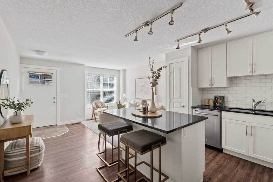A beautifully kept original-owner townhouse in the heart of McKenzie Towne. This 2 bedroom, 1 bathroom townhouse has been freshly painted throughout and includes a double tandem garage! Resilient vinyl plank flooring flows throughout the unit, making it perfect for those with children and pets. The open concept living area features a central kitchen complete with timeless white cabinetry, black pearl granite countertops, subway tile backsplash and suite of stainless steel appliances. The living area has large SW-facing windows that allow natural light to pour through the space all day long – keeping it bright all year round. The primary suite is complete with a walk-in closet and the second bedroom is perfect for a home office, guest room or children’s bedroom. The full bathroom is complete with matching cabinetry and stacked washer/dryer. The lower level has a storage area and access to the private double attached garage (tandem) which has ample space for two vehicles + storage, or one vehicle and hobby space, gym area or other flex space. The private front patio is SW-facing, making it the optimal exposure for capturing sunshine all summer long. This meticulously cared for townhouse is just steps from High Street’s countless amenities and minutes from both Seton and the many shops on 130th Avenue. Low condo fees in this well maintained complex ensure a maintenance-free lifestyle at a comfortable cost. These townhomes are the perfect fit for first time buyers, down-sizers or investors. *Virtual tour available upon request.