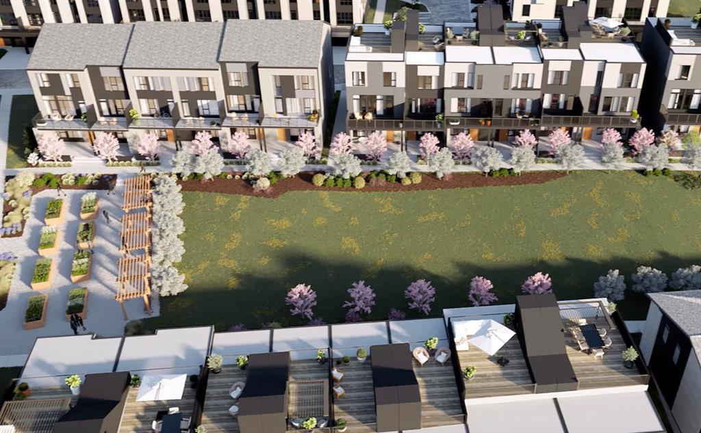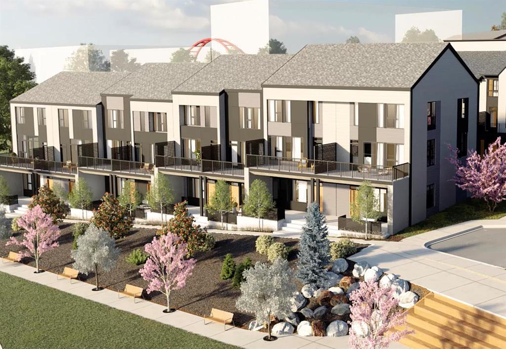 A beautiful and brand new bungalow-style townhouse located in Calgary’s newest inner-city development, Crown Park. Built by award-winning Brookfield Residential, this property features 3 bedrooms, 2 bathrooms, an open concept main living space, a large patio and a private double attached garage. With nearly 1,300 sq.ft of living space on one level, this property is perfect for a small family, young professionals or those looking to downsize. The open concept main living area has a central kitchen overlooking both the living and dining room, making the perfect space for entertaining. The 9′ ceilings allow for natural light to pour through the triple pane windows all day long. The kitchen is complete with gas cooktop, quartz countertops and a counter-depth fridge keeping a clean and consistent look throughout. Additional features include a central fireplace in the main living area, BBQ gas line on the oversized patio, A/C rough-in, full laundry room with countertops and cabinets (located on the main level), and more. The primary bedroom is complete with a full en suite with dual sinks and a walk-in closet. Two more bedrooms and a full bathroom complete this single-level unit. There is additional storage on the lower level off the double attached garage. This unit walks out onto a full green space, making it not feel like a traditional townhome. Located in the heart of the city, Crown Park offers unobstructed views of downtown, easy access to the core and countless nearby amenities all with the luxury of being in an established area in a brand new home. This property is just a 5 minute walk to Shaganappi golf course, two LRT stations, dog-friendly parks and walking paths leading to the Bow River. If you’re looking for an inner-city property with easy access to virtually everything – Crown Park is it. Built by one of Calgary’s most reputable builders, Brookfield Residential, owners will feel confident in their purchase with an extended builder warranty, complimentary legal services, deposit protection and a free move-in concierge. **Please note the property is under construction at this time with an estimated completion of October/November 2023.