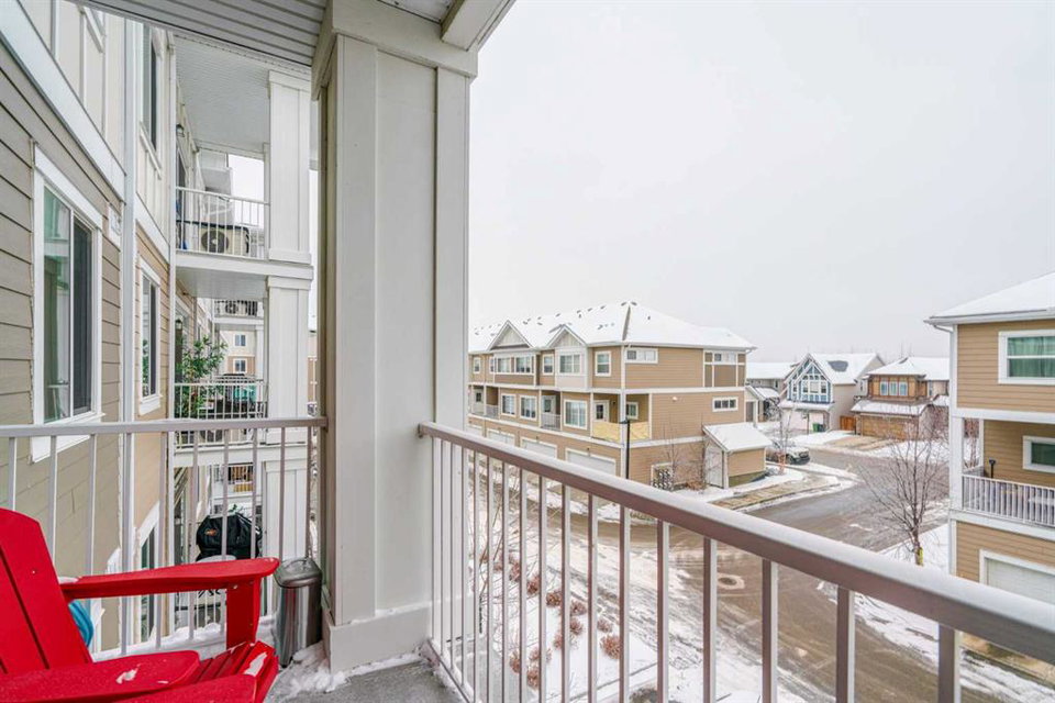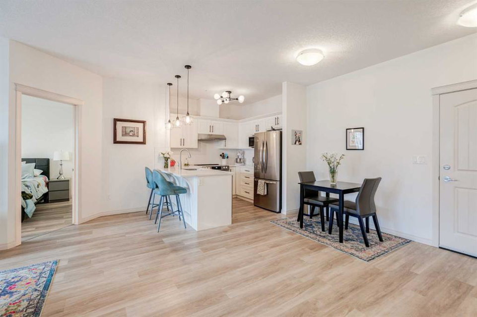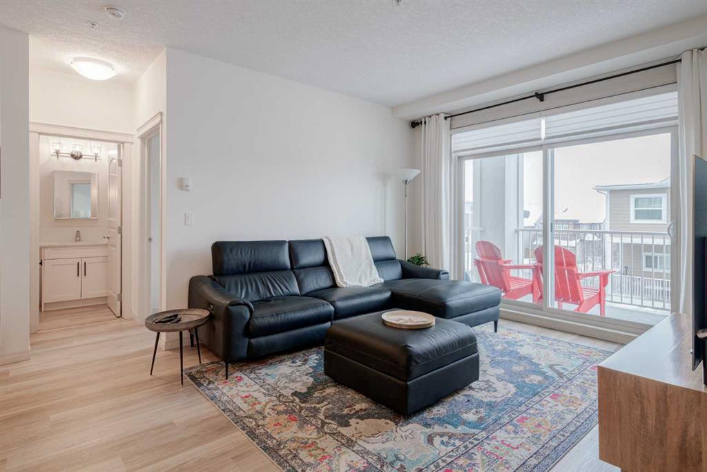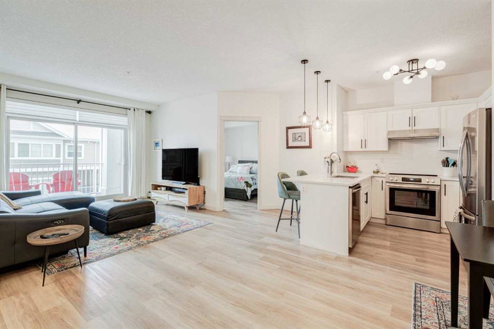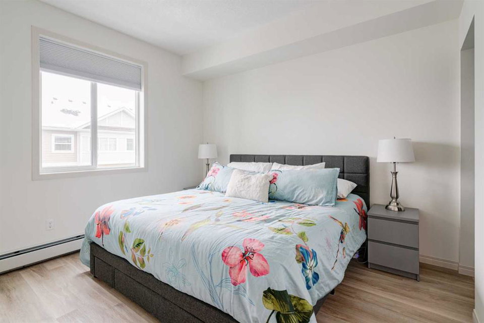 Welcome to this beautiful condo located in the sought-after community of Cranston that is perfect for investors, first-time buyers, or those looking to downsize. This 2 bedroom, 2 bathroom property features an open-concept layout with nearly 850 square feet of living space. New vinyl flooring flows throughout the entire unit (no carpet) and large windows allow natural light to pour throughout the space. The kitchen offers new quartz countertops, new stainless steel appliances, plenty of storage, and a breakfast bar for additional seating. The kitchen overlooks the living and dining area – making this the perfect space for entertaining friends and family. The primary bedroom features ample space, a walk-in closet, and a 3-piece ensuite bathroom, and the secondary bedroom has its own 4-piece bathroom. Completing this condo is a spacious and covered balcony, in-unit laundry, and a large storage room. Additional updates include fresh paint throughout (including baseboards and trim), new light fixtures, new window coverings, new faucets, newer bathroom vanities, and new bathroom mirrors. This unit offers titled parking in the building’s secure underground parkade along with an assigned storage locker that is conveniently located behind the parking stall. Located within the desirable Cranston Ridge development, this condo is perfect for pet owners with no size or weight restrictions. Ideally situated within Cranston, this property is a short walk from nearby parks, shopping, restaurants, schools, and trails along the ridge and river that offer breathtaking views of the mountains. Access around the city and daily commuting is easy with quick access to both Deerfoot and Stoney Trail. Don’t miss out on this incredible opportunity in Cranston!