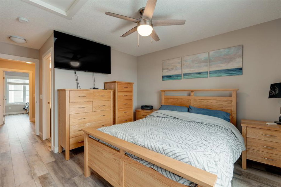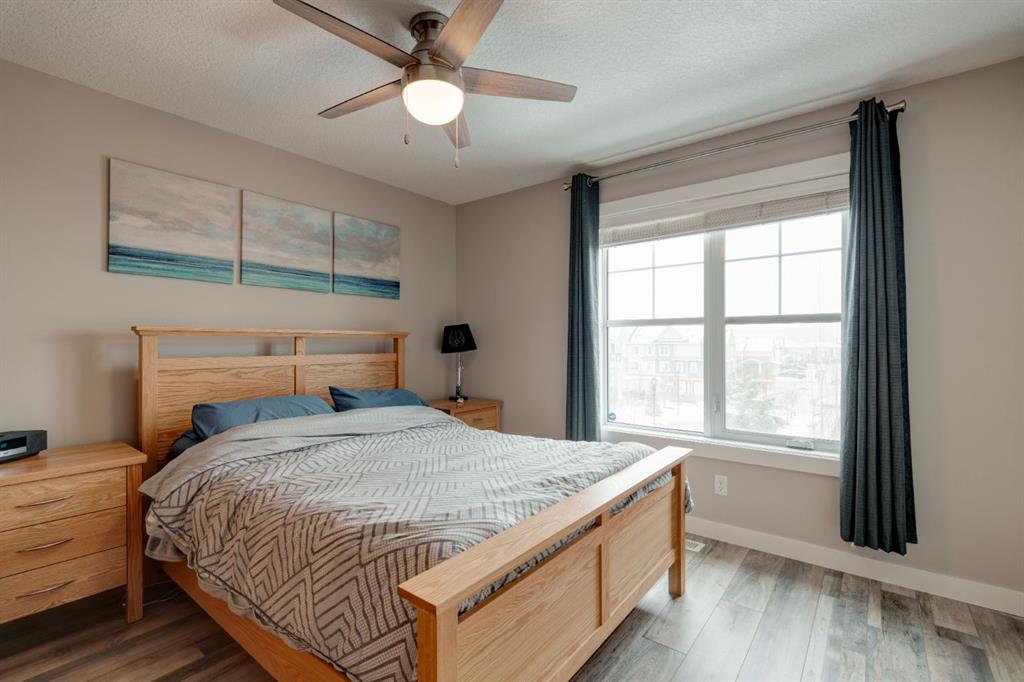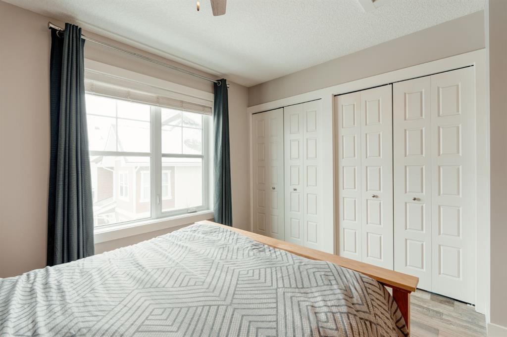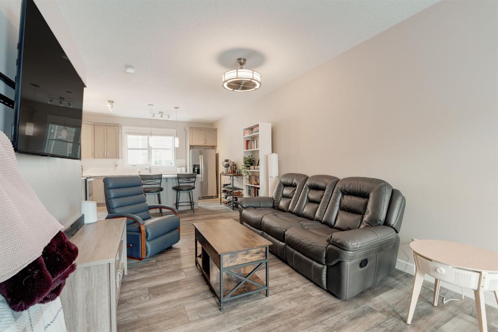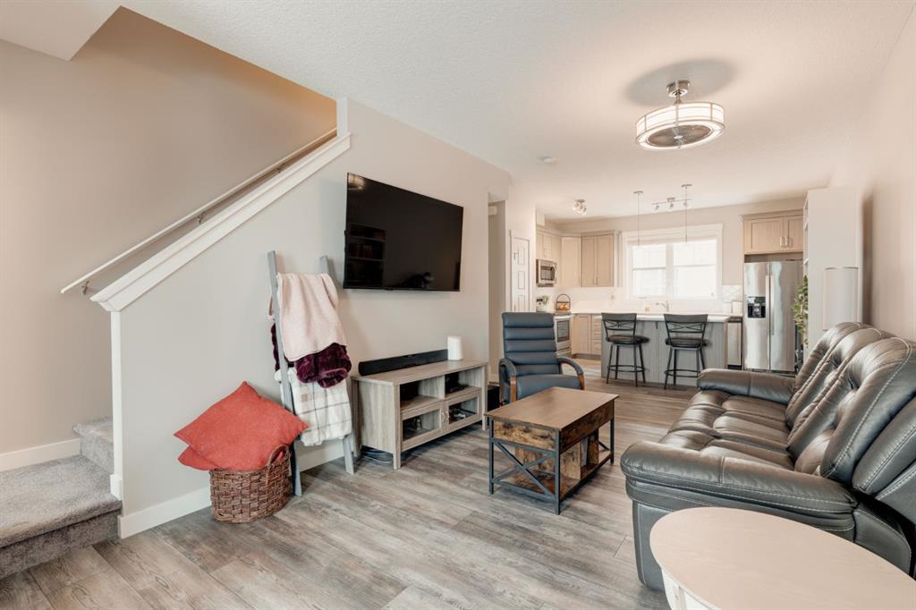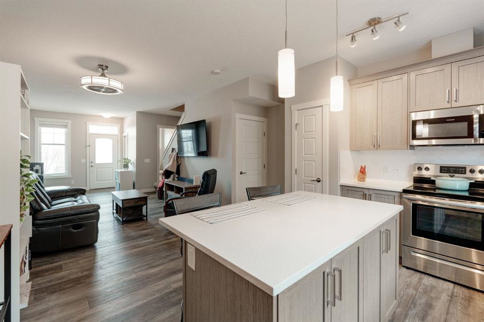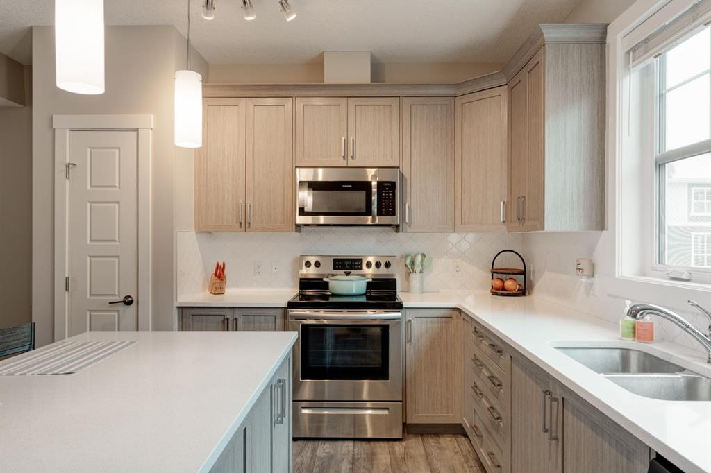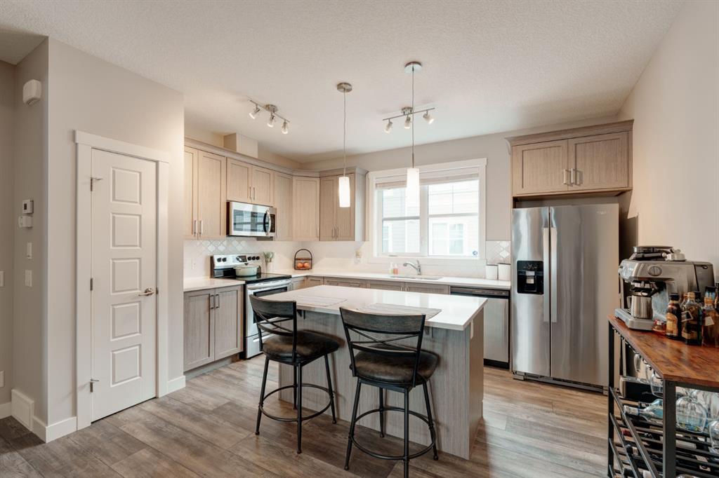 This well-cared for and like-new townhomes features 2 bedrooms, 2.5 bathrooms and a private double attached (tandem) garage located in the heart of Riverstone overlooking green space. The bright and spacious main level has an open concept layout with a large kitchen that overlooks both the living and dining spaces. The kitchen is complete with warm mid-tone cabinetry, quartz countertops, a full pantry, a suite of stainless steel appliances and an island with additional seating. A large window over the kitchen sinks allows natural light to pour through the space all day long. Resilient vinyl flooring flows throughout the main level and the open layout makes the perfect space for entertaining. The main level is complete with a 2 pc powder room. On the upper level there are two primary bedrooms, each with their own private ensuites. Vinyl flooring flows throughout the upper level as well – perfect for those with pets, children or allergies to carpet. The largest primary bedroom overlooks the park / green space on the development and captures natural light all evening long. The room is complete with double closets and a 3 pc ensuite with walk-in shower. The second primary bedroom includes double closets and a 4 pc ensuite with tub and shower. The central hallway between the bedrooms includes a linen closet, conveniently located upper-floor laundry and a flex space with ample room for a desk if desired. The private double tandem garage has space for two vehicles or could be a great spot for a home gym + additional storage for those with one vehicle. This home is equipped with central A/C to keep you cool all summer long and the attached garage will keep your vehicle and valuables safe as well. Located in one of the best spots – this townhouse overlooks the development’s green space and is within walking distance to the countless pathways and Bow River – all within Riverstone! With easy access to Seton’s amenities and major roads, this property is perfectly located and ideal for first time buyers, downsizers or investors! **Virtual tour available upon request.
