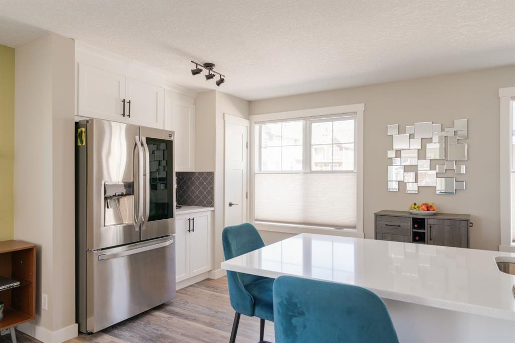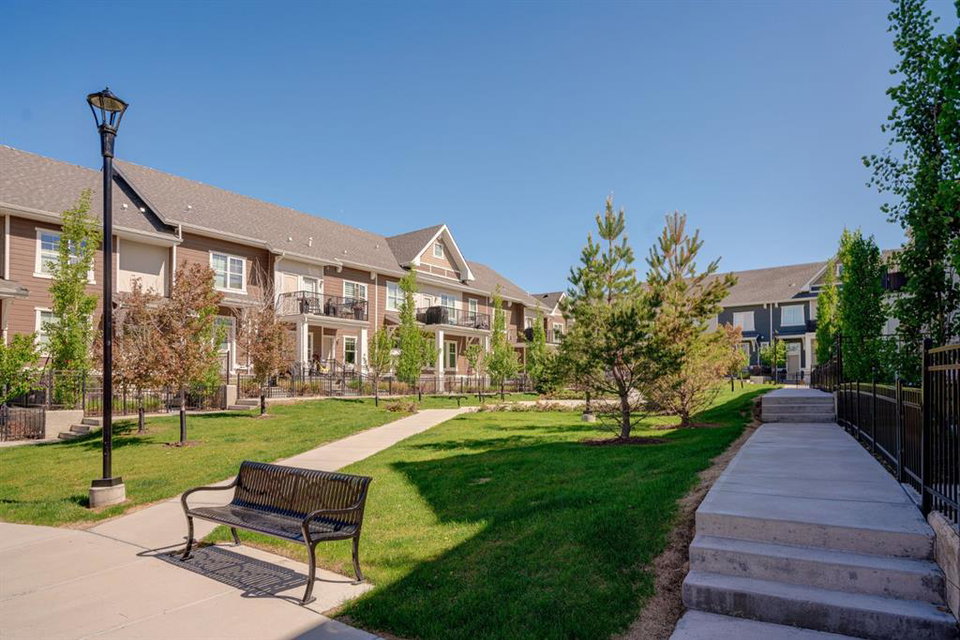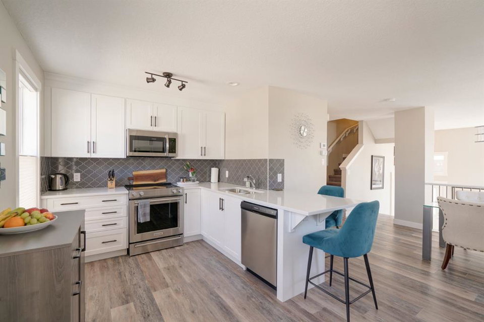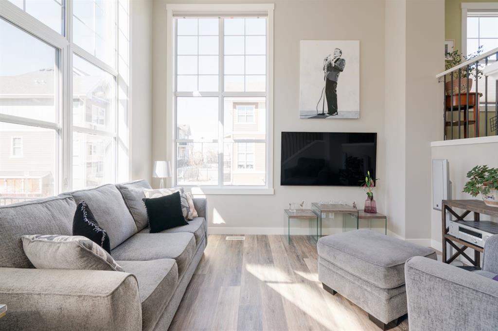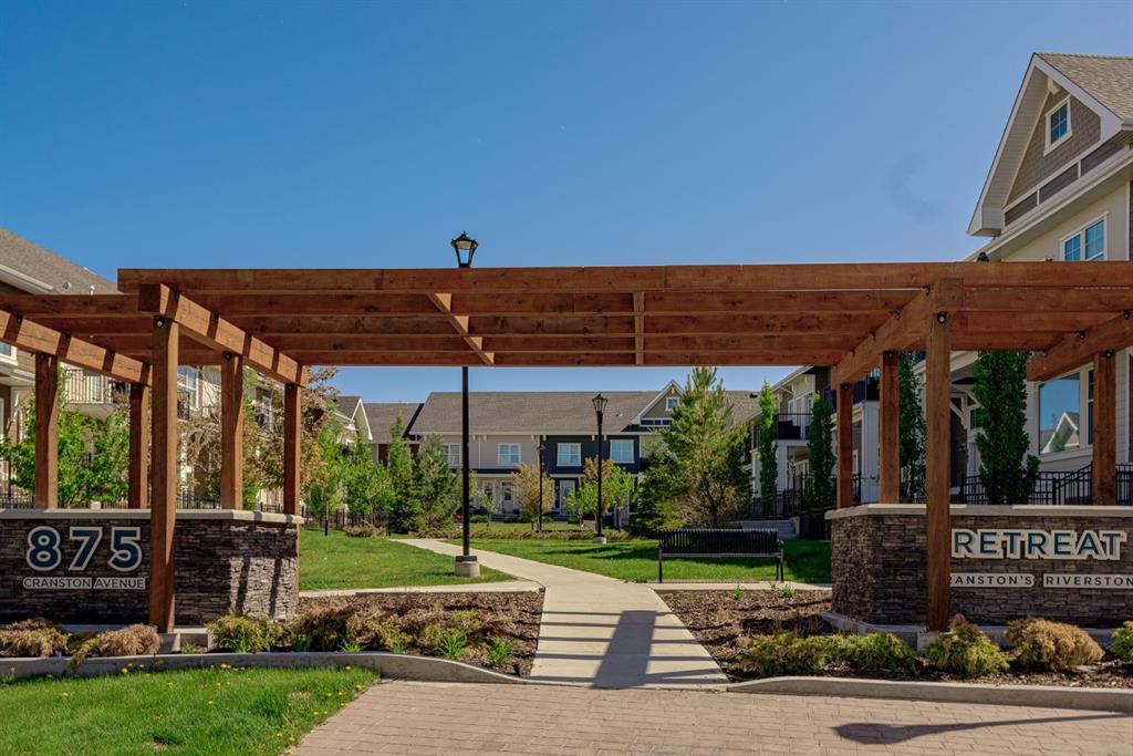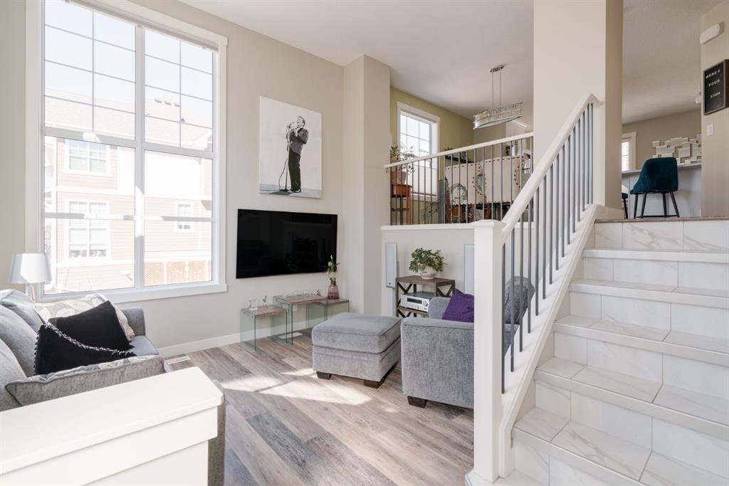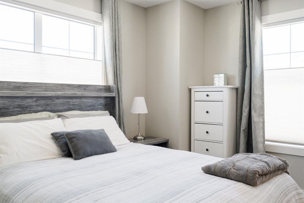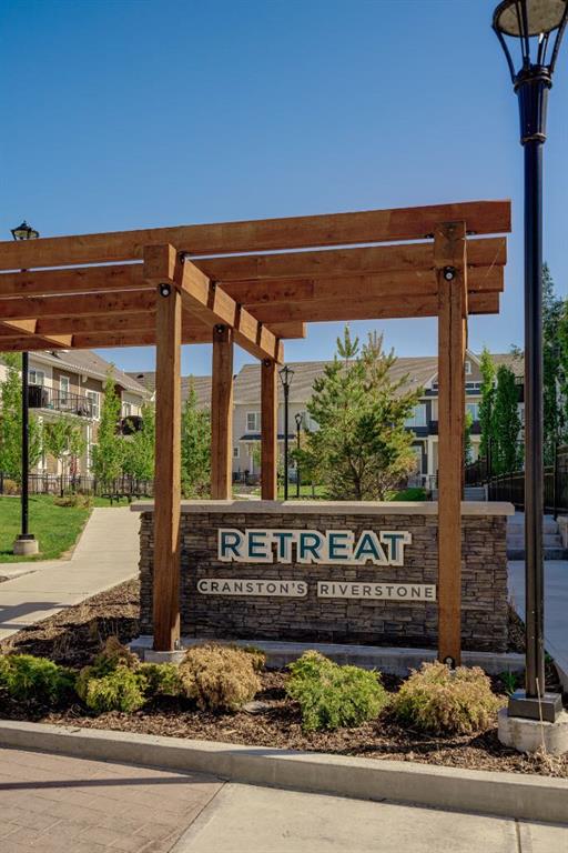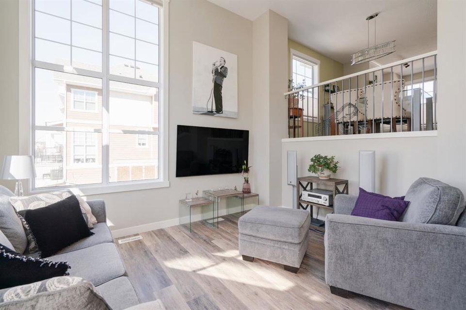 A stunning and immaculate end-unit townhouse located in the heart of Riverstone at The Retreat. This beautiful like-new home features 2 bedrooms, 2.5 bathrooms and over 1,300 square feet of living space over two levels. The incredibly popular ‘Crimson’ model features a dropped living room with 10′ windows and 14′ ceilings (including an extra window due to the end-unit), making for a stunning entrance and beautiful living space. Up a half set of stairs is the kitchen and dining space that is completely open and creates the perfect space for entertaining. The timeless white kitchen includes ceiling-height cabinetry, upgraded appliances, quartz countertops and a wraparound eating bar for additional seating space. The expansive dining space has an extra window because the property is an end unit, allowing for more natural light to flow through the main level all day long. Resilient vinyl plank flooring flows throughout the main floor in this bright and beautiful space. The second level has dual primary suites – both complete with their own en suites. The first primary is the largest bedroom offered at the development and includes a cantilever. Measuring at 14’2″ x 14′, this bedroom has ample space for a full bedroom suite in addition to its walk-in closet and private 3 pc en suite with walk-in shower. The second primary bedroom is also large enough for a king bed and includes its own walk-in closet and private 4 pc en suite. A laundry closet is conveniently located on the top level – meaning you never have to do the stairs for laundry! The partially finished basement includes space for a workout area and storage. The private and heated double attached garage has been finished to include epoxy flooring, additional storage space and the perfect man cave area. The private and fenced front patio space is perfect for capturing SW sunshine all day long and the central A/C will keep you cool inside during the warmer days! Located in desirable Riverstone with endless walking and biking paths along the Bow River while just minutes from countless amenities in Seton, this meticulously cared-for townhouse provides maintenance-free living and is perfect for those looking to downsize, those looking for their first home or investors.