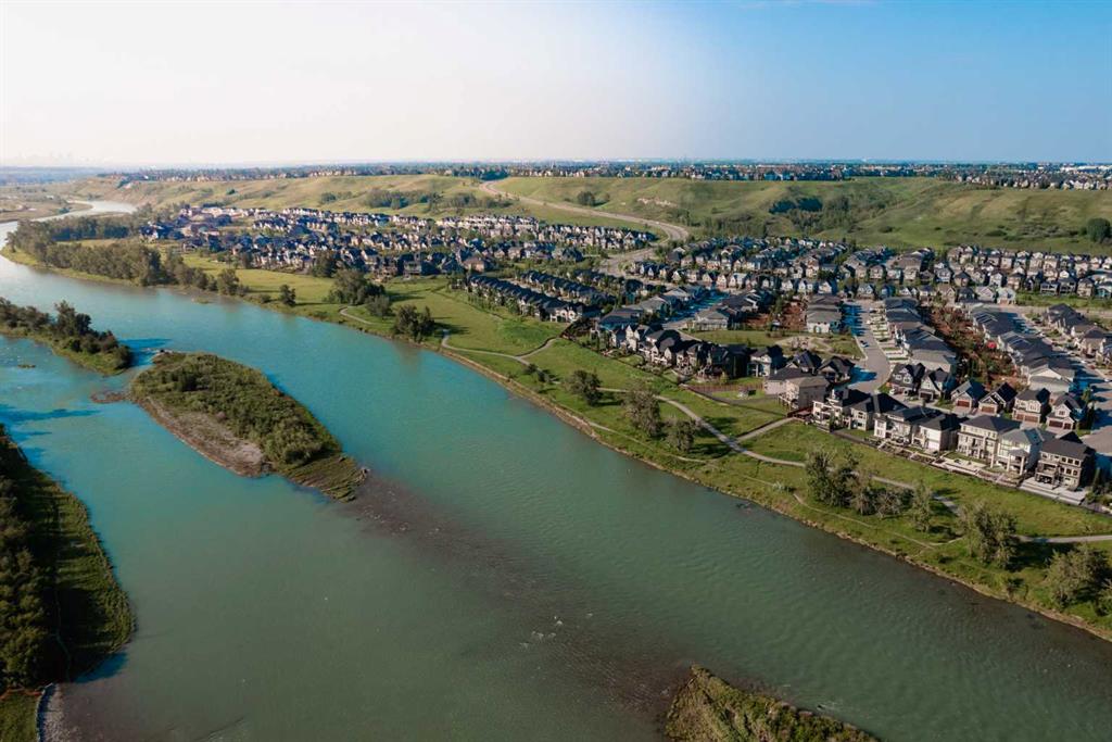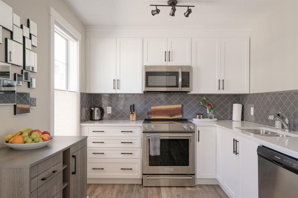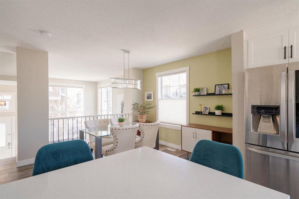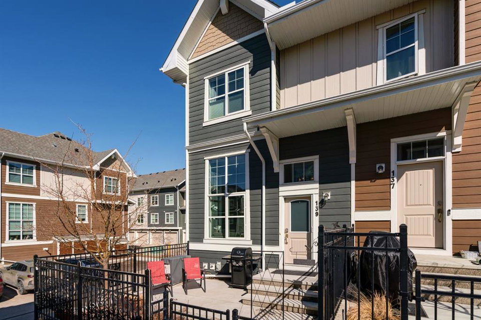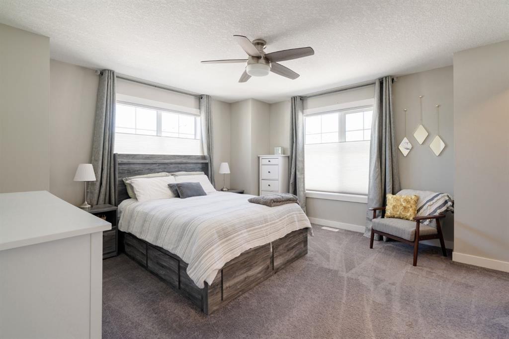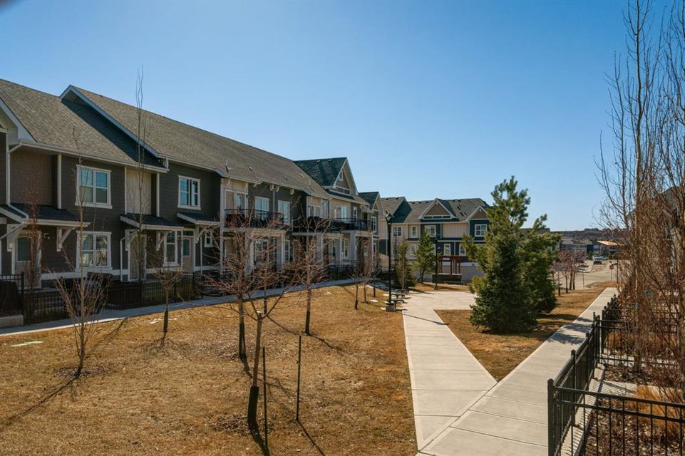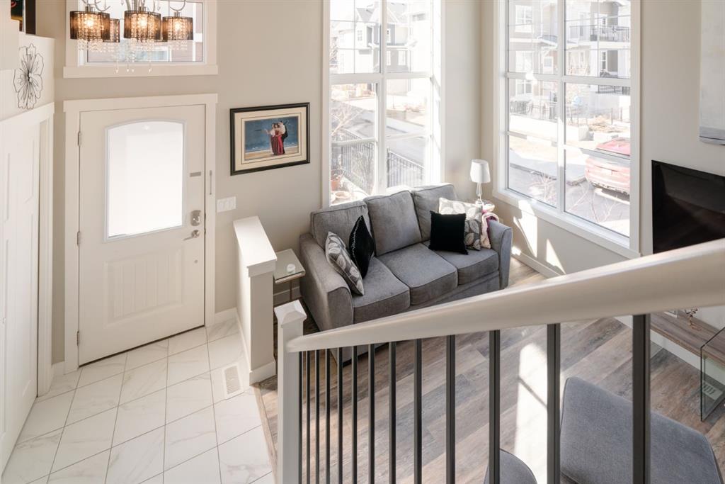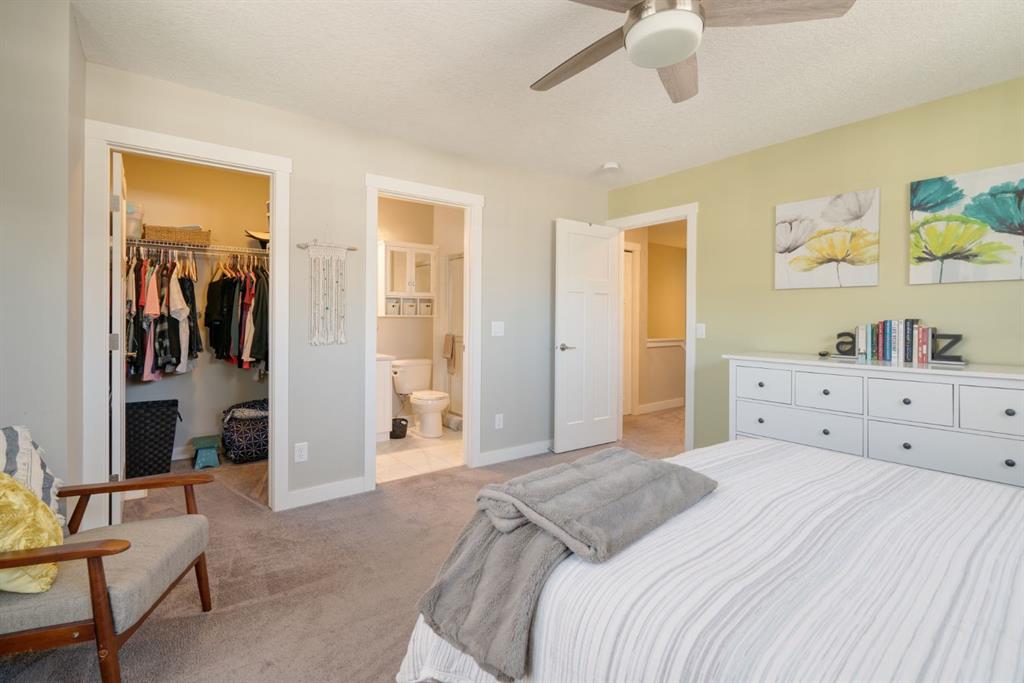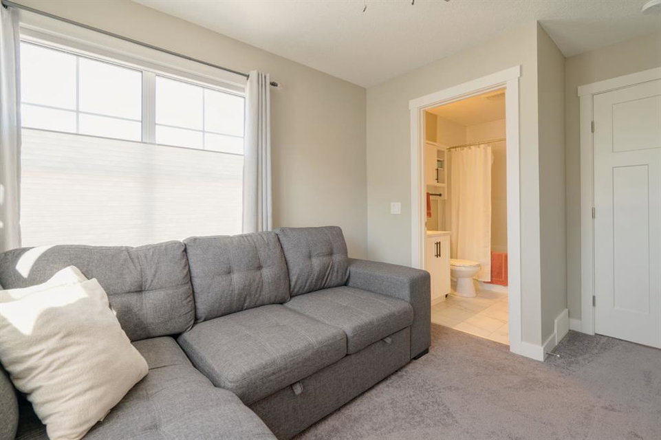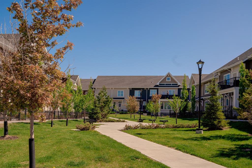 A stunning and immaculate end-unit townhouse located in the heart of Riverstone at The Retreat. This beautiful like-new home features 2 bedrooms, 2.5 bathrooms and over 1,300 square feet of living space over two levels. The incredibly popular ‘Crimson’ model features a dropped living room with 10′ windows and 14′ ceilings (including an extra window due to the end-unit), making for a stunning entrance and beautiful living space. Up a half set of stairs is the kitchen and dining space that is completely open and creates the perfect space for entertaining. The timeless white kitchen includes ceiling-height cabinetry, upgraded appliances, quartz countertops and a wraparound eating bar for additional seating space. The expansive dining space has an extra window because the property is an end unit, allowing for more natural light to flow through the main level all day long. Resilient vinyl plank flooring flows throughout the main floor in this bright and beautiful space. The second level has dual primary suites – both complete with their own en suites. The first primary is the largest bedroom offered at the development and includes a cantilever. Measuring at 14’2″ x 14′, this bedroom has ample space for a full bedroom suite in addition to its walk-in closet and private 3 pc en suite with walk-in shower. The second primary bedroom is also large enough for a king bed and includes its own walk-in closet and private 4 pc en suite. A laundry closet is conveniently located on the top level – meaning you never have to do the stairs for laundry! The partially finished basement includes space for a workout area and storage. The private and heated double attached garage has been finished to include epoxy flooring, additional storage space and the perfect man cave area. The private and fenced front patio space is perfect for capturing SW sunshine all day long and the central A/C will keep you cool inside during the warmer days! Located in desirable Riverstone with endless walking and biking paths along the Bow River while just minutes from countless amenities in Seton, this meticulously cared-for townhouse provides maintenance-free living and is perfect for those looking to downsize, those looking for their first home or investors.