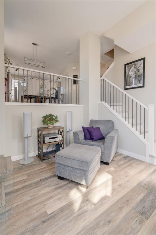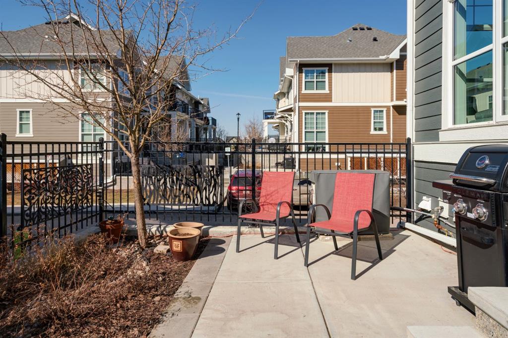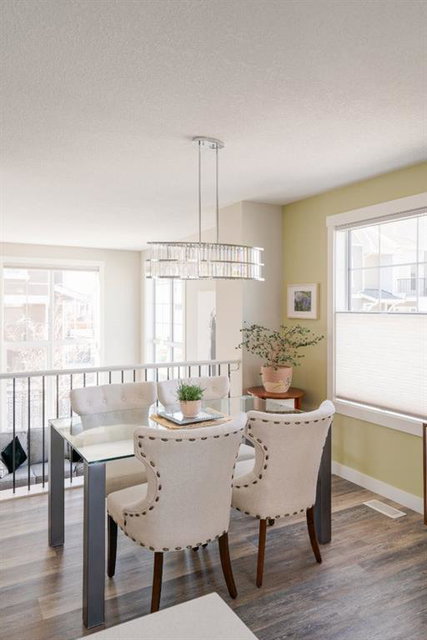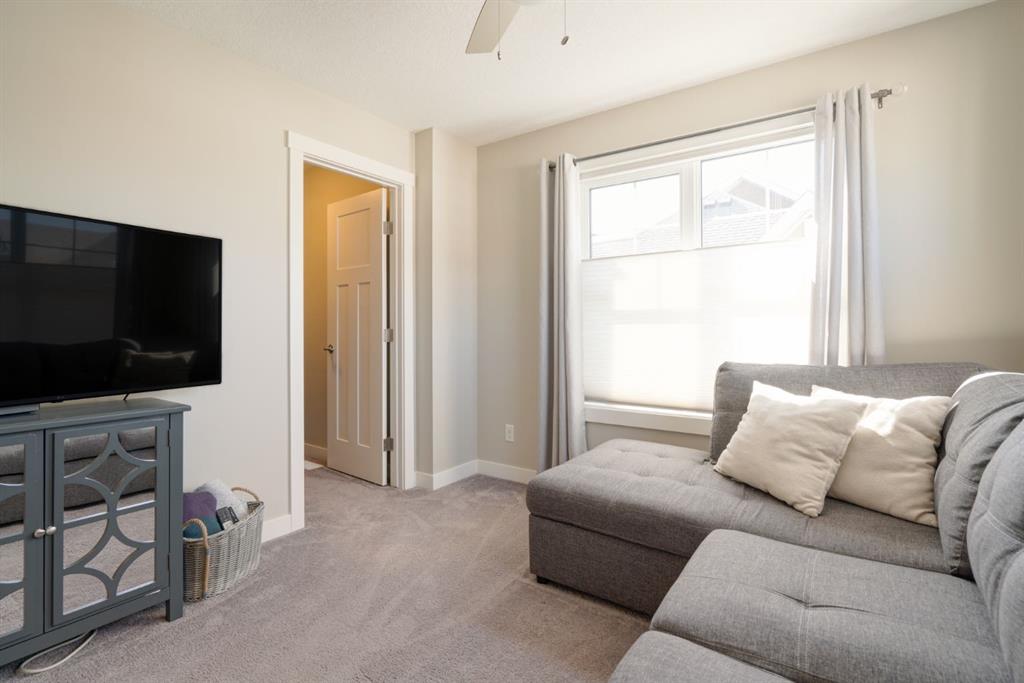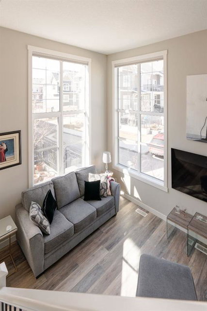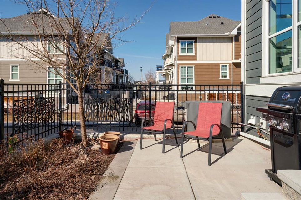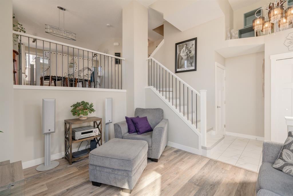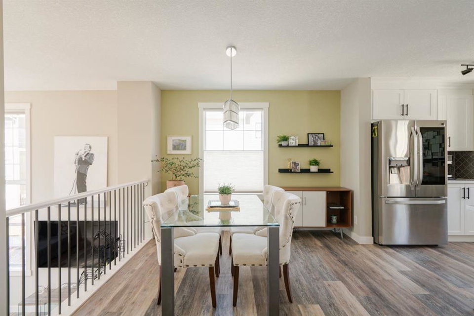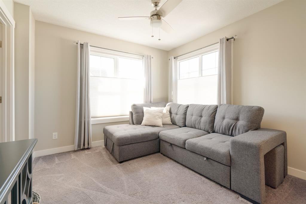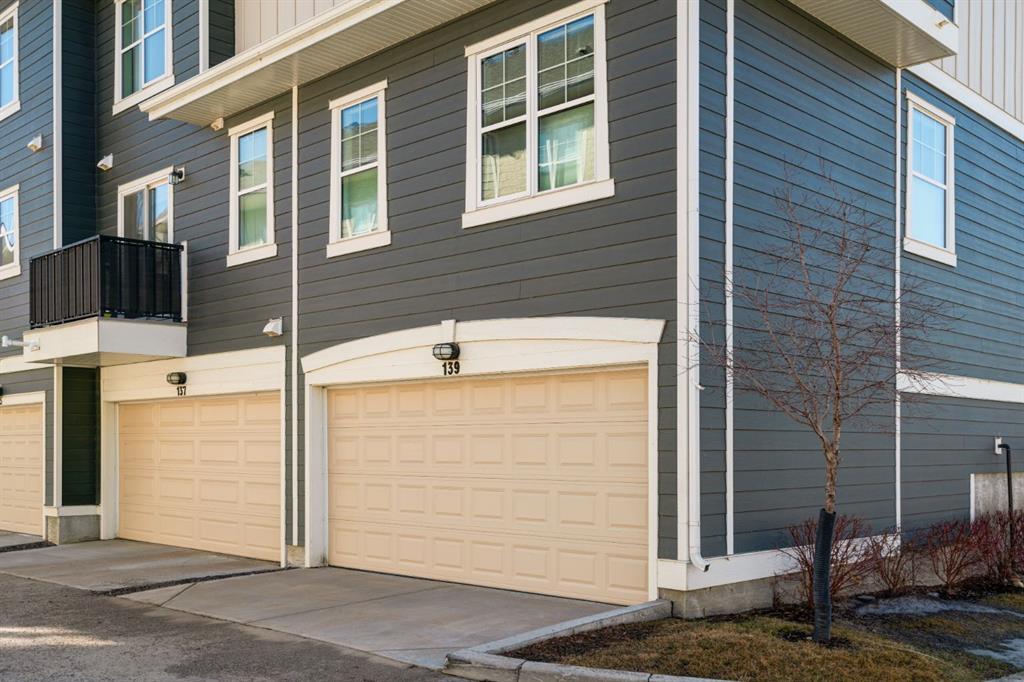 A stunning and immaculate end-unit townhouse located in the heart of Riverstone at The Retreat. This beautiful like-new home features 2 bedrooms, 2.5 bathrooms and over 1,300 square feet of living space over two levels. The incredibly popular ‘Crimson’ model features a dropped living room with 10′ windows and 14′ ceilings (including an extra window due to the end-unit), making for a stunning entrance and beautiful living space. Up a half set of stairs is the kitchen and dining space that is completely open and creates the perfect space for entertaining. The timeless white kitchen includes ceiling-height cabinetry, upgraded appliances, quartz countertops and a wraparound eating bar for additional seating space. The expansive dining space has an extra window because the property is an end unit, allowing for more natural light to flow through the main level all day long. Resilient vinyl plank flooring flows throughout the main floor in this bright and beautiful space. The second level has dual primary suites – both complete with their own en suites. The first primary is the largest bedroom offered at the development and includes a cantilever. Measuring at 14’2″ x 14′, this bedroom has ample space for a full bedroom suite in addition to its walk-in closet and private 3 pc en suite with walk-in shower. The second primary bedroom is also large enough for a king bed and includes its own walk-in closet and private 4 pc en suite. A laundry closet is conveniently located on the top level – meaning you never have to do the stairs for laundry! The partially finished basement includes space for a workout area and storage. The private and heated double attached garage has been finished to include epoxy flooring, additional storage space and the perfect man cave area. The private and fenced front patio space is perfect for capturing SW sunshine all day long and the central A/C will keep you cool inside during the warmer days! Located in desirable Riverstone with endless walking and biking paths along the Bow River while just minutes from countless amenities in Seton, this meticulously cared-for townhouse provides maintenance-free living and is perfect for those looking to downsize, those looking for their first home or investors.
