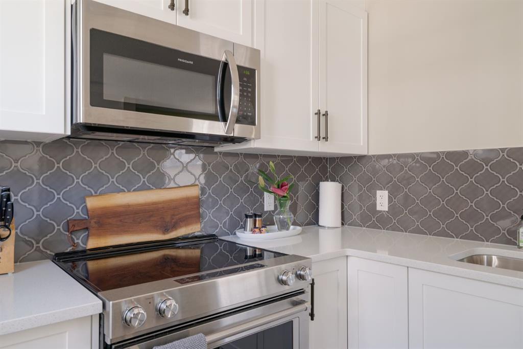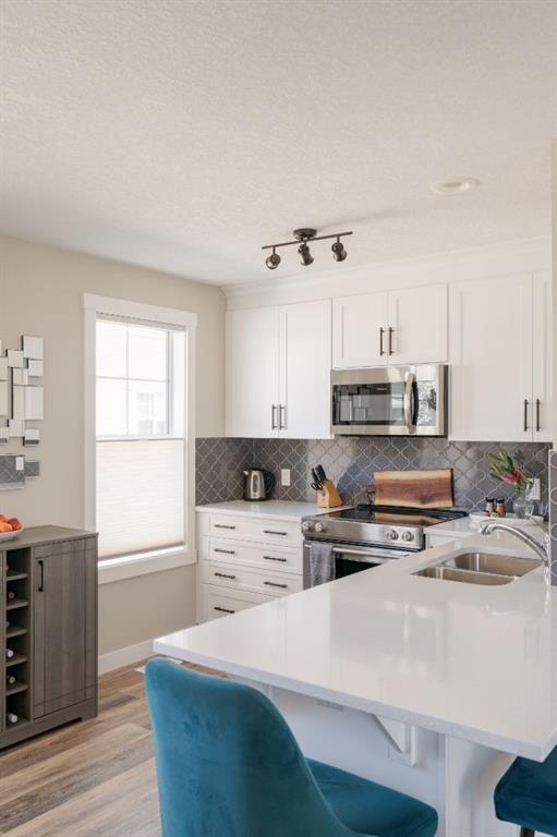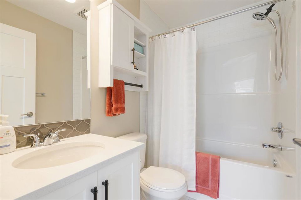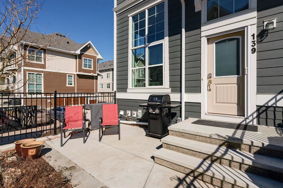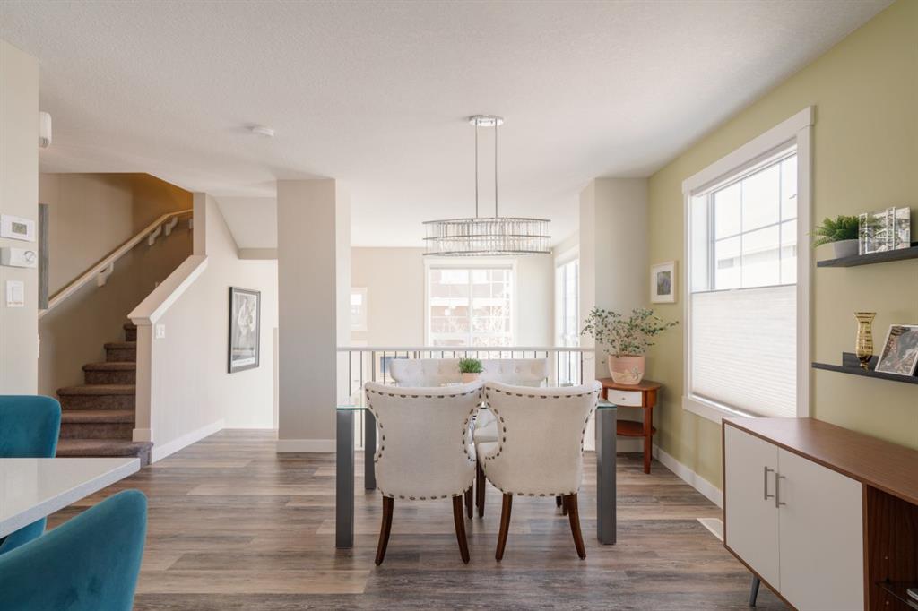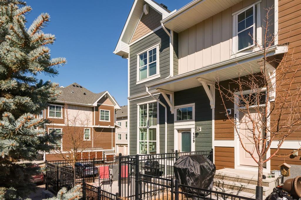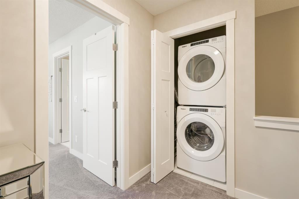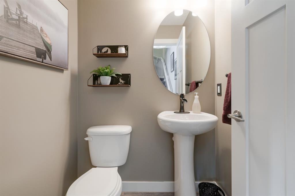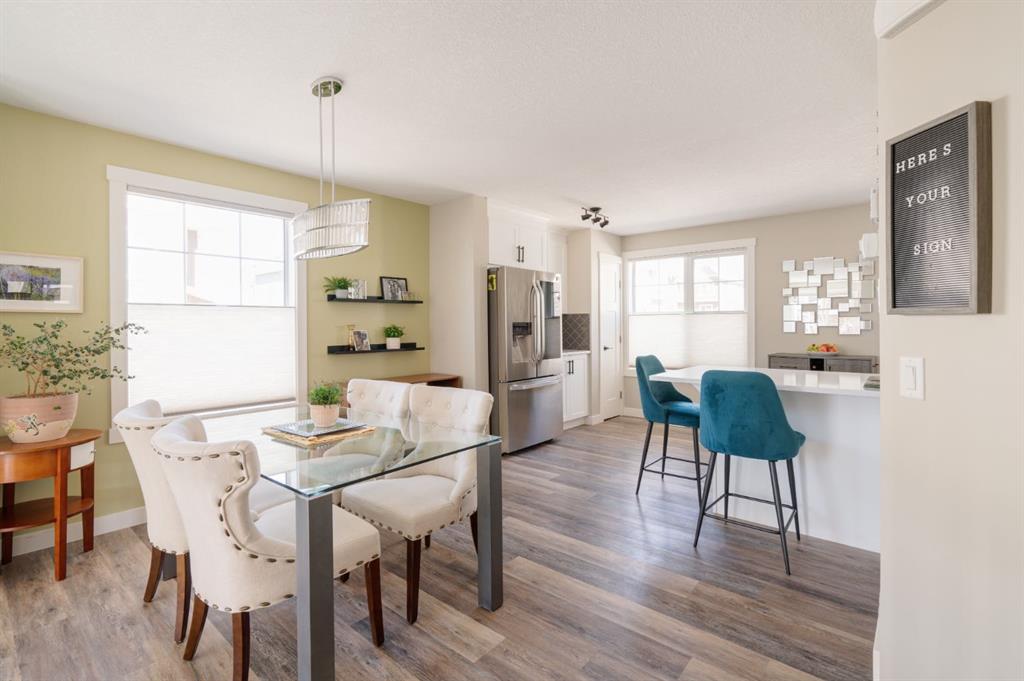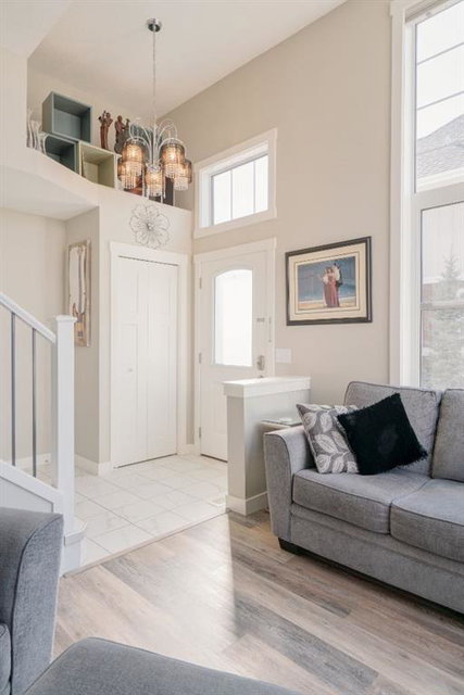 A stunning and immaculate end-unit townhouse located in the heart of Riverstone at The Retreat. This beautiful like-new home features 2 bedrooms, 2.5 bathrooms and over 1,300 square feet of living space over two levels. The incredibly popular ‘Crimson’ model features a dropped living room with 10′ windows and 14′ ceilings (including an extra window due to the end-unit), making for a stunning entrance and beautiful living space. Up a half set of stairs is the kitchen and dining space that is completely open and creates the perfect space for entertaining. The timeless white kitchen includes ceiling-height cabinetry, upgraded appliances, quartz countertops and a wraparound eating bar for additional seating space. The expansive dining space has an extra window because the property is an end unit, allowing for more natural light to flow through the main level all day long. Resilient vinyl plank flooring flows throughout the main floor in this bright and beautiful space. The second level has dual primary suites – both complete with their own en suites. The first primary is the largest bedroom offered at the development and includes a cantilever. Measuring at 14’2″ x 14′, this bedroom has ample space for a full bedroom suite in addition to its walk-in closet and private 3 pc en suite with walk-in shower. The second primary bedroom is also large enough for a king bed and includes its own walk-in closet and private 4 pc en suite. A laundry closet is conveniently located on the top level – meaning you never have to do the stairs for laundry! The partially finished basement includes space for a workout area and storage. The private and heated double attached garage has been finished to include epoxy flooring, additional storage space and the perfect man cave area. The private and fenced front patio space is perfect for capturing SW sunshine all day long and the central A/C will keep you cool inside during the warmer days! Located in desirable Riverstone with endless walking and biking paths along the Bow River while just minutes from countless amenities in Seton, this meticulously cared-for townhouse provides maintenance-free living and is perfect for those looking to downsize, those looking for their first home or investors.