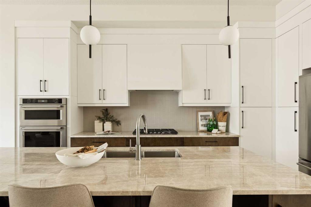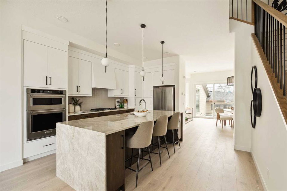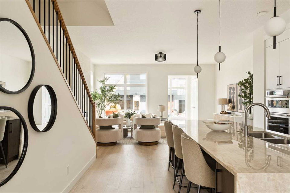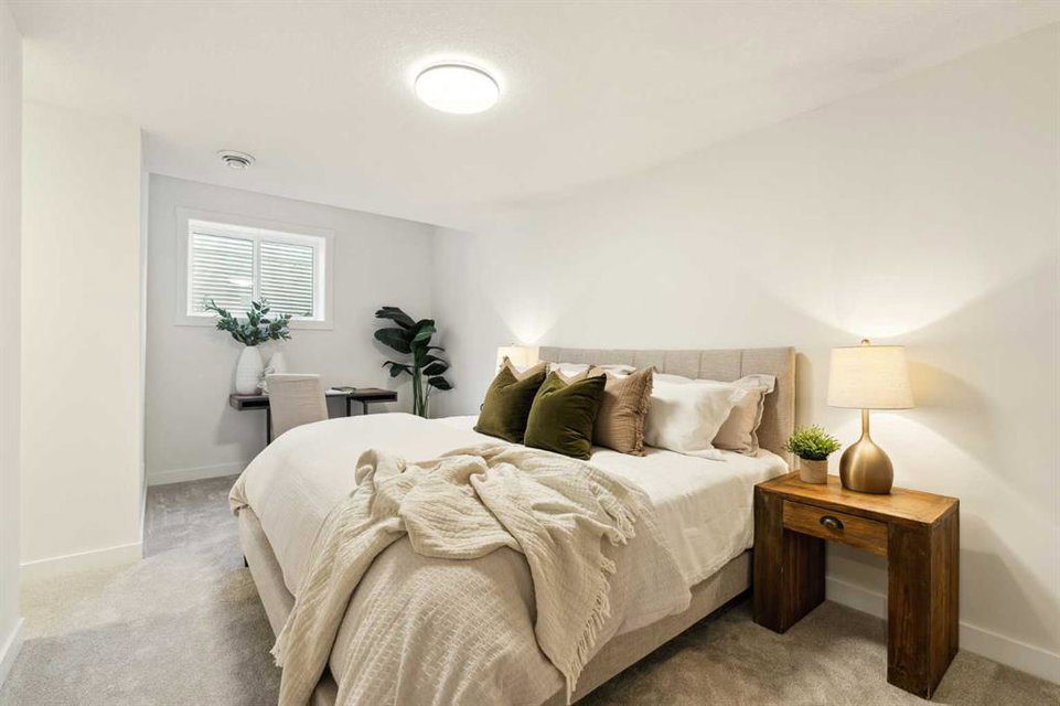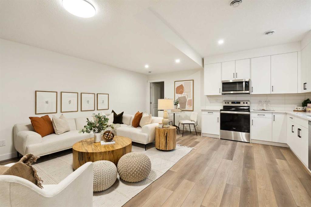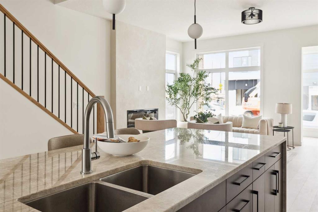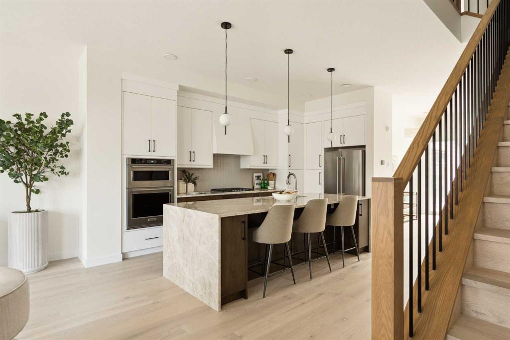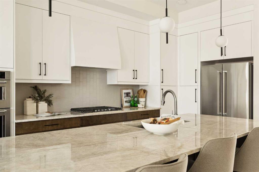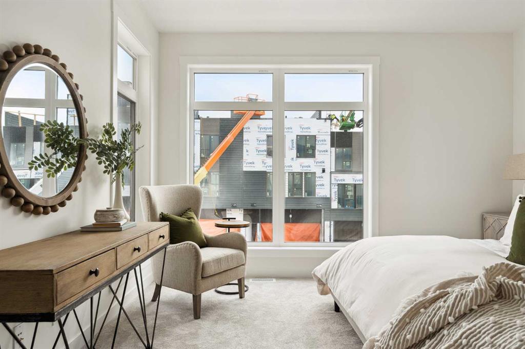 The stunning Executive Infills by Brookfield Residential offer unparalleled functionality and design and are situated on one of Calgary’s most coveted pieces of land – Crown Park. With nearly 2,500 square feet of living space + a developed legal basement suite with its own private entrance, this property is ideal for professionals, families and investors. The beautifully designed main level features wide-plank hardwood flooring, 10 ft ceilings, and a bright and spacious open concept design that isn’t reminiscent of your typical infill. The central kitchen is complete with warm natural wood-tone base cabinets, timeless white upper cabinets and stunning quartzite countertops including a waterfall island. The kitchen overlooks both the front living area and rear dining room, but intentional design separates the spaces, ideal for more formal evenings. The main level has direct access to the oversized double attached garage via a sprawling mud room and a wall of west-facing patio doors provide direct access from the dining room to the low-maintenance concrete patio / outdoor space. Hardwood flooring and iron spindle railings lead to the second level where there is a built-in desk in the hallway and 9′ ceilings throughout. The expansive primary suite is at the front of the home and complete with a walk-in closet and 5pc ensuite with pedestal soaker tub, tiled shower with 10mm glass surround and bench, dual sinks, and a private water closet. The secondary bedrooms are at the opposite end of the home, separated by the main bathroom and laundry room that is complete with additional storage and a laundry sink. The top level of the property is an entertainer’s dream with 9′ ceilings and a flex space that is complete with a wet bar and 2 pc bathroom – offering endless options but ideal for entertaining with its direct access to your sprawling rooftop patio with views to the south, west and north. The addition of a private legal suite makes this home appealing to those who have a nanny/caregiver, or would like additional space for guests. The legal one bedroom suite would also make the optimal rental if desired. Purchasing with a builder that has been in business for over half a century provides more than just peace of mind – it provides you with an incredible warranty and an intentionally designed space that will hold its value for years to come. This is the opportunity to get the beautiful new home you desire while allowing you to have something unique and purchase with confidence.