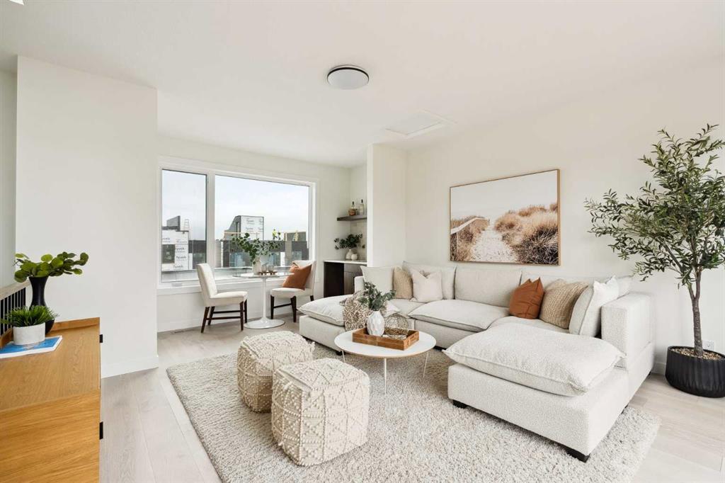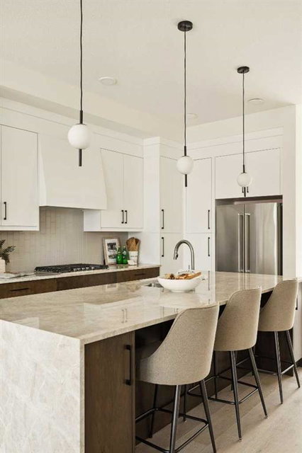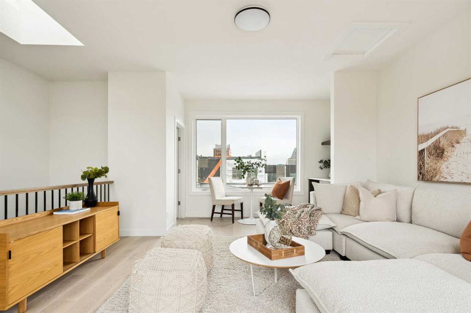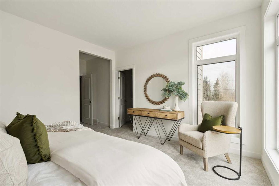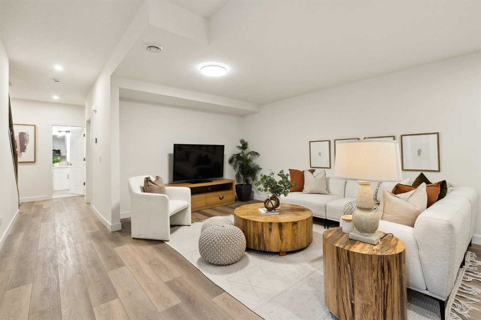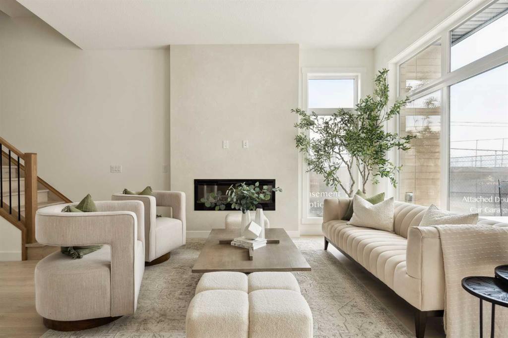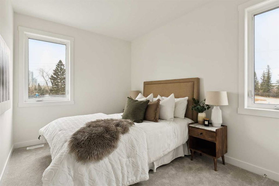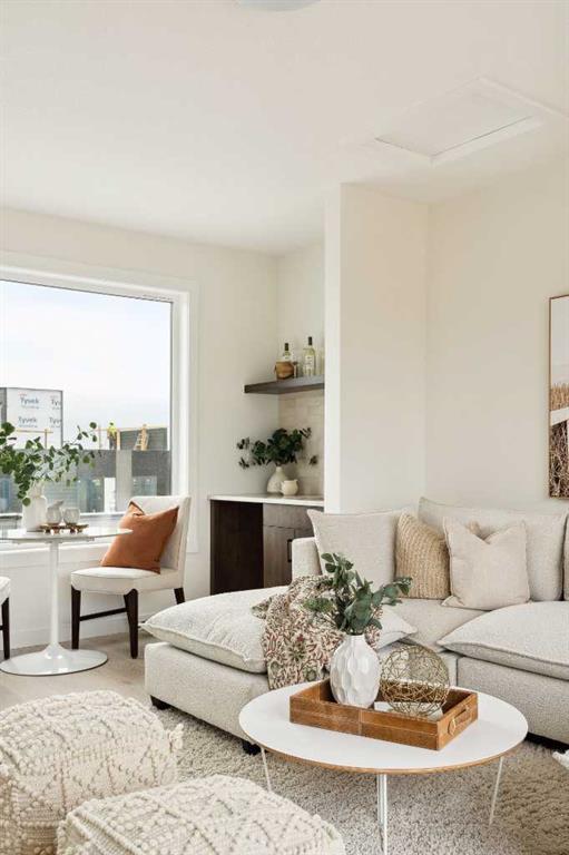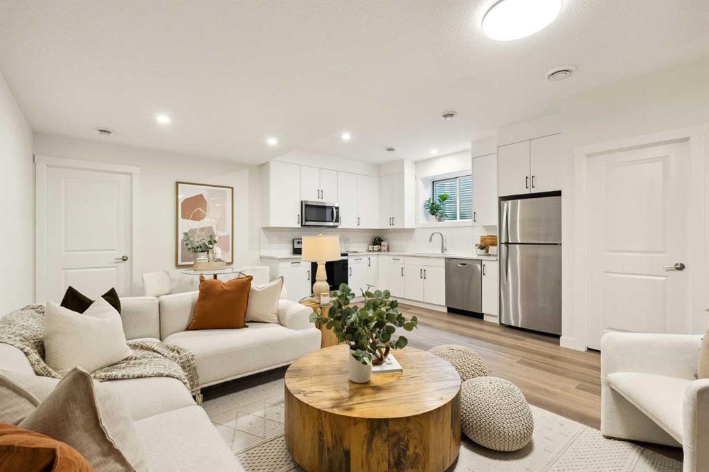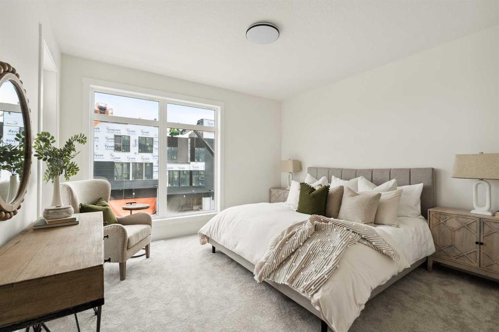 The stunning Executive Infills by Brookfield Residential offer unparalleled functionality and design and are situated on one of Calgary’s most coveted pieces of land – Crown Park. With nearly 2,500 square feet of living space + a developed legal basement suite with its own private entrance, this property is ideal for professionals, families and investors. The beautifully designed main level features wide-plank hardwood flooring, 10 ft ceilings, and a bright and spacious open concept design that isn’t reminiscent of your typical infill. The central kitchen is complete with warm natural wood-tone base cabinets, timeless white upper cabinets and stunning quartzite countertops including a waterfall island. The kitchen overlooks both the front living area and rear dining room, but intentional design separates the spaces, ideal for more formal evenings. The main level has direct access to the oversized double attached garage via a sprawling mud room and a wall of west-facing patio doors provide direct access from the dining room to the low-maintenance concrete patio / outdoor space. Hardwood flooring and iron spindle railings lead to the second level where there is a built-in desk in the hallway and 9′ ceilings throughout. The expansive primary suite is at the front of the home and complete with a walk-in closet and 5pc ensuite with pedestal soaker tub, tiled shower with 10mm glass surround and bench, dual sinks, and a private water closet. The secondary bedrooms are at the opposite end of the home, separated by the main bathroom and laundry room that is complete with additional storage and a laundry sink. The top level of the property is an entertainer’s dream with 9′ ceilings and a flex space that is complete with a wet bar and 2 pc bathroom – offering endless options but ideal for entertaining with its direct access to your sprawling rooftop patio with views to the south, west and north. The addition of a private legal suite makes this home appealing to those who have a nanny/caregiver, or would like additional space for guests. The legal one bedroom suite would also make the optimal rental if desired. Purchasing with a builder that has been in business for over half a century provides more than just peace of mind – it provides you with an incredible warranty and an intentionally designed space that will hold its value for years to come. This is the opportunity to get the beautiful new home you desire while allowing you to have something unique and purchase with confidence.