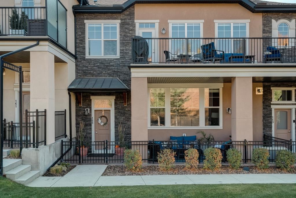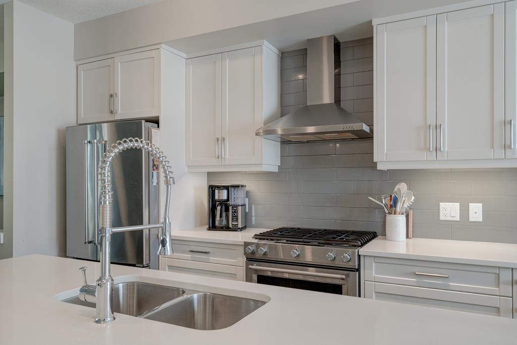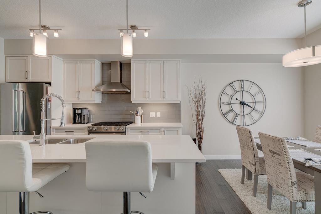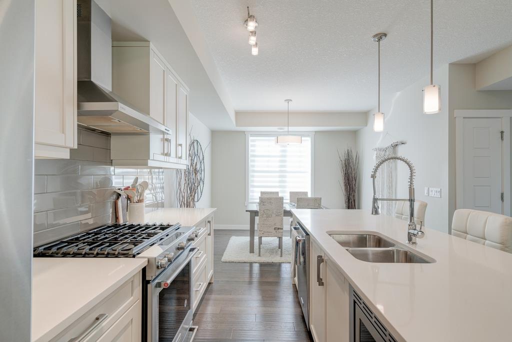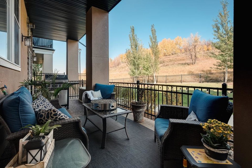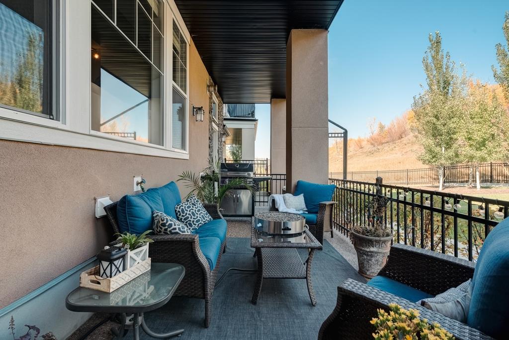 An incredible opportunity to own a main level townhome in desirable Mosaic Riverstone. Situated just steps away from the Bow River and surrounded by the beauty of Fish Creek Park, this property strikes the perfect balance of seclusion and convenience. This like-new townhouse features single-level living offering 2 bedrooms, 2 bathrooms, ample storage and an open concept design. Natural light flows through a wall of windows overlooking the picturesque escarpment, flooding the home with light. The timeless white kitchen is complete with subway tile backsplash, quartz countertops and a suite of premium stainless-steel appliances including a gas range and chimney hood fan. The kitchen overlooks the large dining area with ample seating for family dinners and living room with gas fireplace making it the perfect space for entertaining. The primary bedroom is complete with a walk-in closet, 4 piece bathroom with a full height tile shower and dual sinks. An additional bedroom allows ample space for a guest room and home office while the full laundry room provides added convenience for daily living. The lower level of the property provides endless possibilities for additional storage, a home gym or studio space. A double garage provides additional storage for bikes and provides secured parking for your vehicle all year. The homes include all the upgrades that everyone wants like upgraded lighting, flooring, custom window treatments (Hunter Douglas) and more. Enjoy the sunshine and the tranquil views of the escarpment on your private patio all summer long. With quick access to amenities and only minutes from Fish Creek Park, this home is the perfect fit for those looking to live in beautiful Riverstone surrounded by nature.