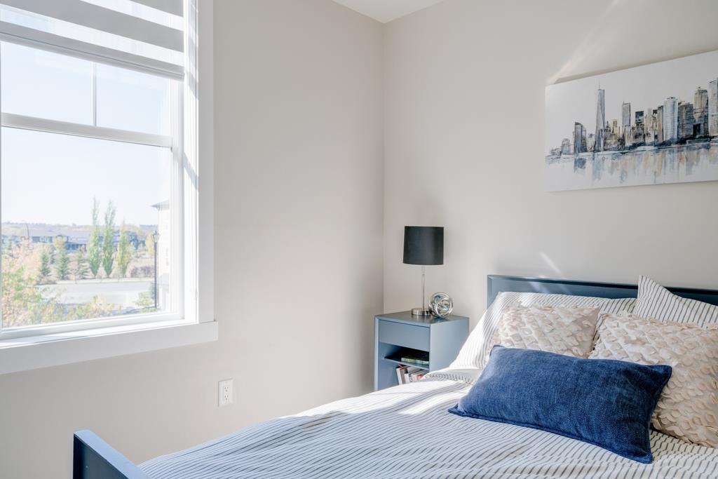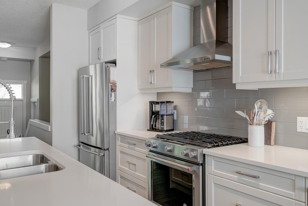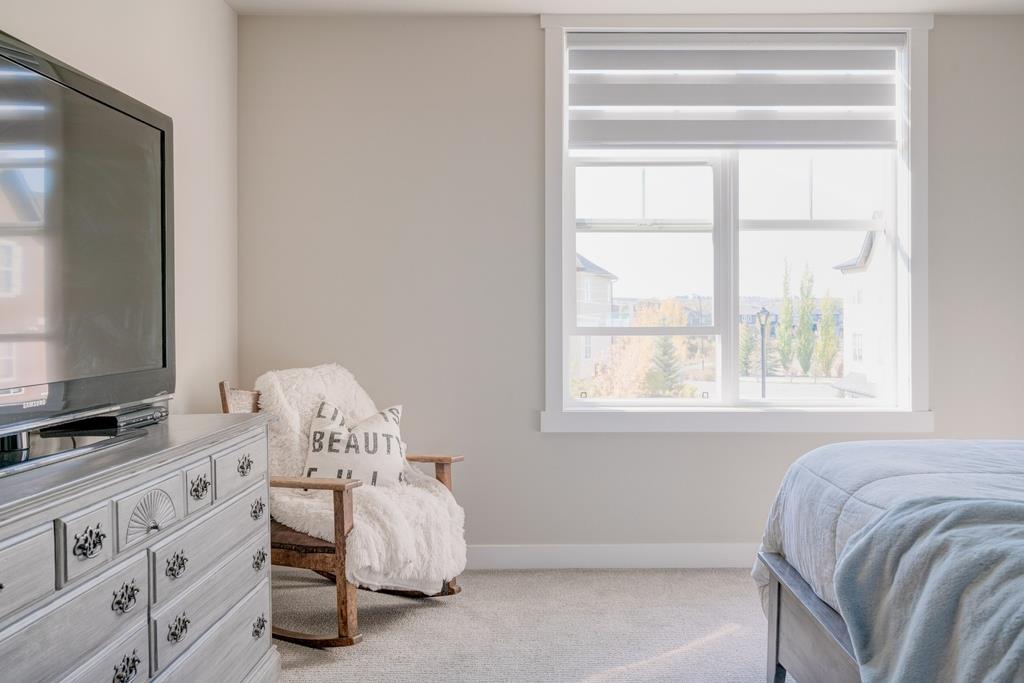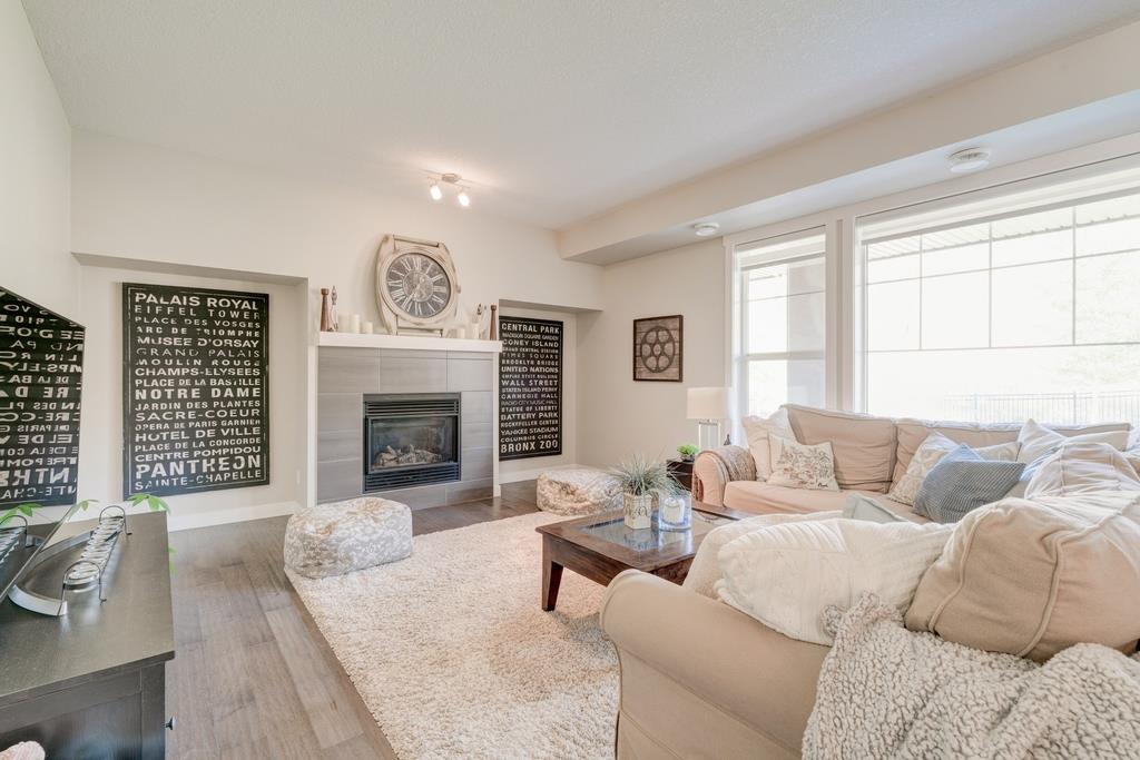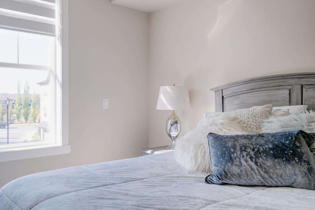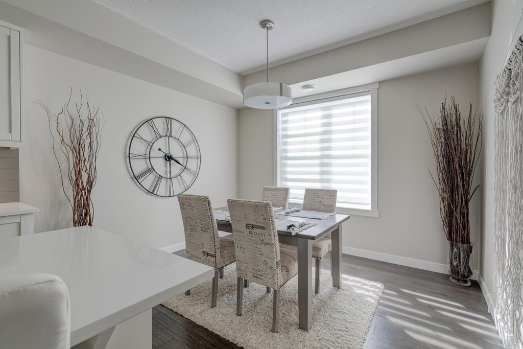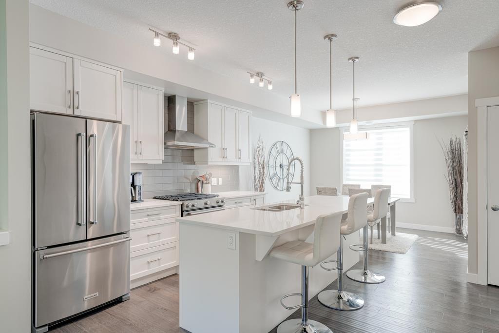 An incredible opportunity to own a main level townhome in desirable Mosaic Riverstone. Situated just steps away from the Bow River and surrounded by the beauty of Fish Creek Park, this property strikes the perfect balance of seclusion and convenience. This like-new townhouse features single-level living offering 2 bedrooms, 2 bathrooms, ample storage and an open concept design. Natural light flows through a wall of windows overlooking the picturesque escarpment, flooding the home with light. The timeless white kitchen is complete with subway tile backsplash, quartz countertops and a suite of premium stainless-steel appliances including a gas range and chimney hood fan. The kitchen overlooks the large dining area with ample seating for family dinners and living room with gas fireplace making it the perfect space for entertaining. The primary bedroom is complete with a walk-in closet, 4 piece bathroom with a full height tile shower and dual sinks. An additional bedroom allows ample space for a guest room and home office while the full laundry room provides added convenience for daily living. The lower level of the property provides endless possibilities for additional storage, a home gym or studio space. A double garage provides additional storage for bikes and provides secured parking for your vehicle all year. The homes include all the upgrades that everyone wants like upgraded lighting, flooring, custom window treatments (Hunter Douglas) and more. Enjoy the sunshine and the tranquil views of the escarpment on your private patio all summer long. With quick access to amenities and only minutes from Fish Creek Park, this home is the perfect fit for those looking to live in beautiful Riverstone surrounded by nature.