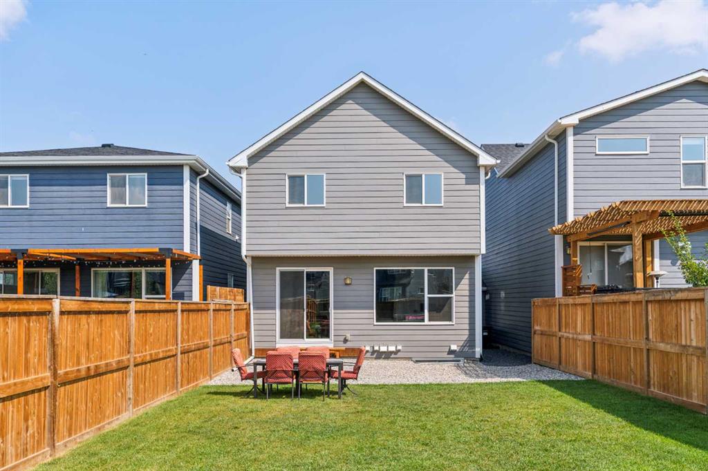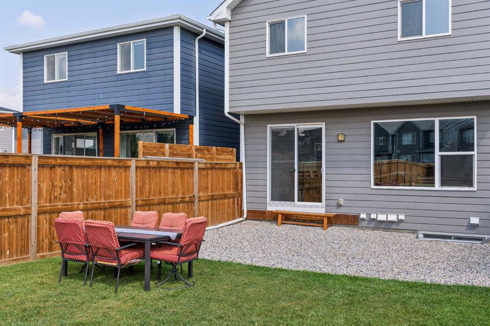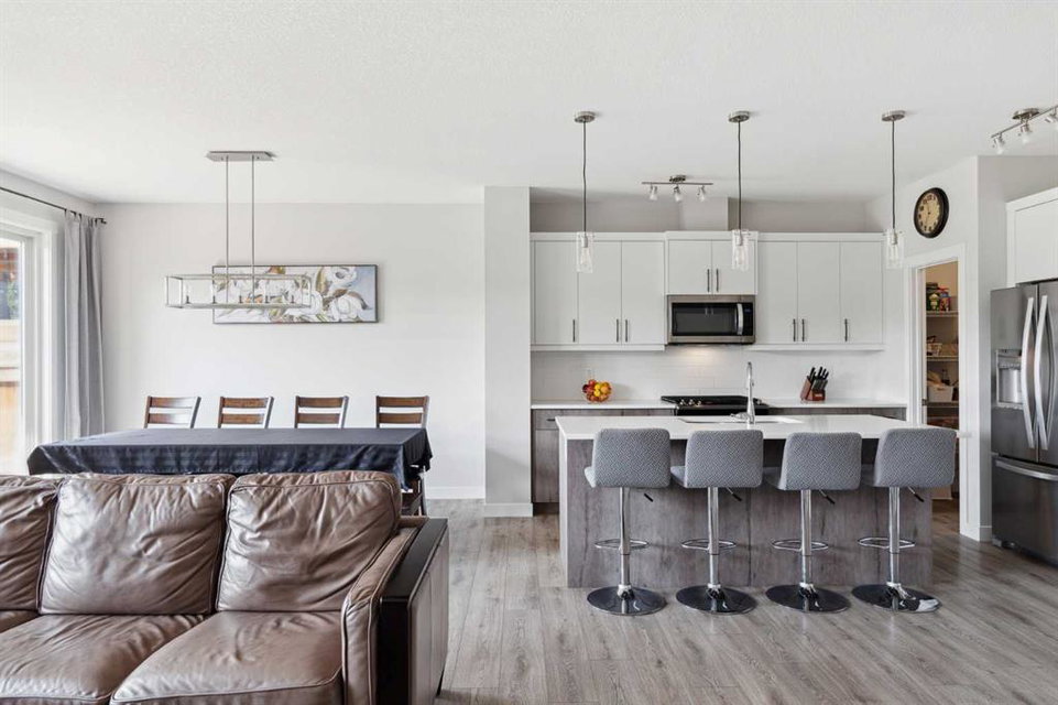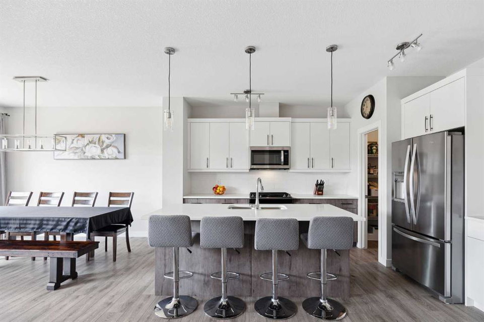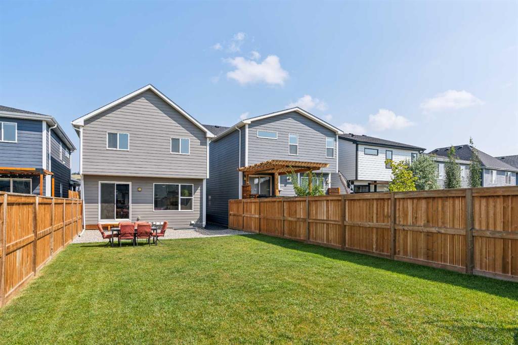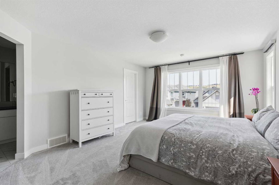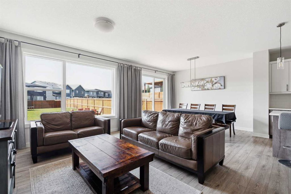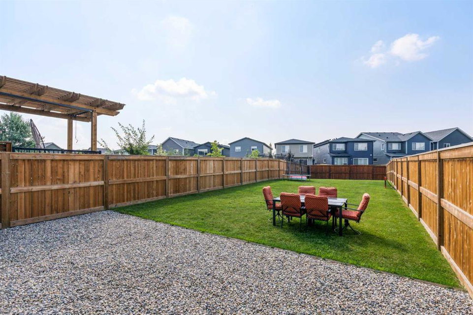 A rare opportunity to own a like-new move-up home in the heart of Riverstone with a fully legal basement suite situated on an incredibly large lot! The main level features an open concept living space with a large kitchen that overlooks both the living and dining areas – making the perfect space for entertaining guests. The kitchen is complete with two tone cabinetry, quartz countertops, a gas range and a large walk-through pantry that has direct access from the mud room off of the double attached garage. The expansive main living and dining space is completely open, providing added flexibility for furnishing and is complete with a wall of windows and patio doors that overlook the 185′ deep backyard! A 2 pc bathroom and resilient laminate flooring complete the main level – making it the perfect home for those with children and pets. The upper level has a central family room that has ample space for an office space and TV area. The primary bedroom is located at the front of the home – separated from the secondary bedrooms by the central bonus space. The primary suite is an impressive 13’1″ x 18’10” in size and that is in addition to its walk-in closet and 5 pc ensuite complete with a walk-in shower, soaker tub and two individual vanities. Two more large bedrooms, a full bathroom and conveniently located laundry room complete the second level. A private side entrance leads to the fully legal basement suite which is perfect for those looking to reduce their monthly expenses! The beautiful one bedroom suite is complete with a full kitchen (full size appliances), large dining / flex space, living area, bedroom, full bathroom and oversized laundry room with additional storage space. Beyond all the home has to offer inside is the incredible backyard that provides endless opportunities! The fully fenced, landscaped and private backyard has ample space for future sitting, dining and lounging areas with plenty of extra room for a play space and much more. This truly unique lot and property is a very rare find in the new community of Riverstone that is just wrapping up its final stages of development. Riverstone has endless pathways along the Bow River and Fish Creek Park while being just minutes from countless amenities. This private and tranquil community truly provides the suburban lifestyle combined with nature while not missing out on the convenience of amenities nearby.