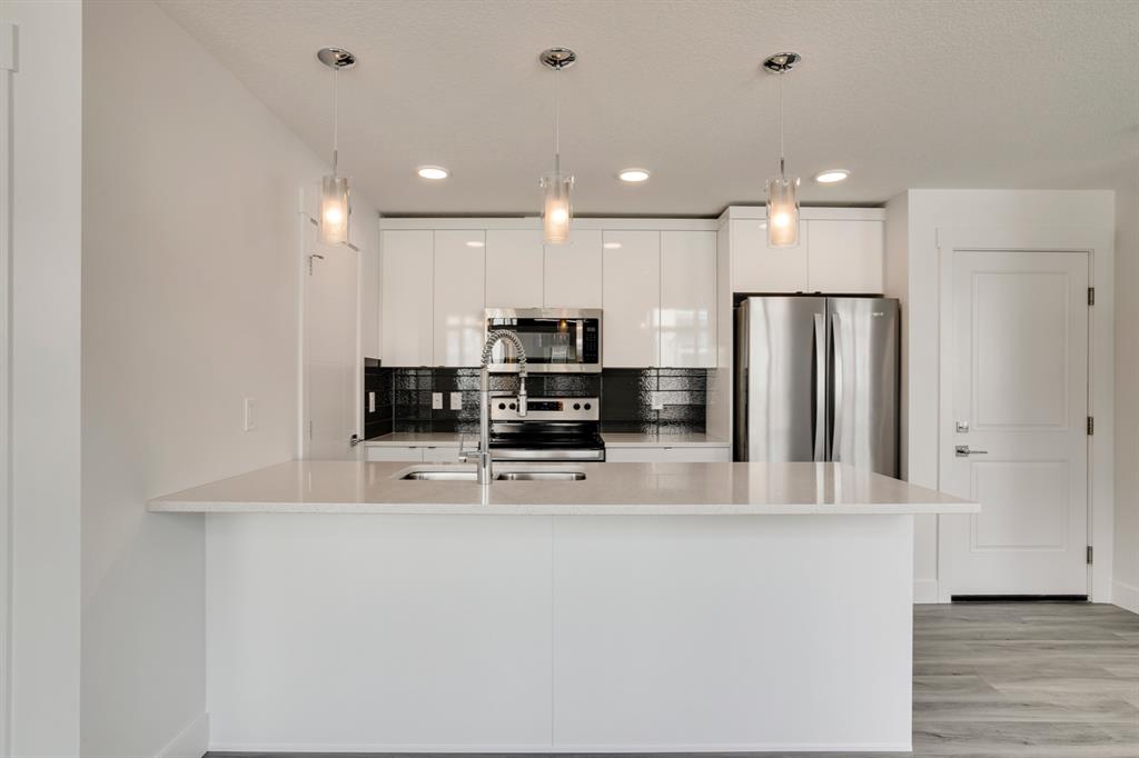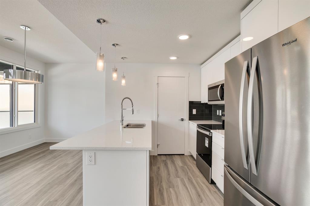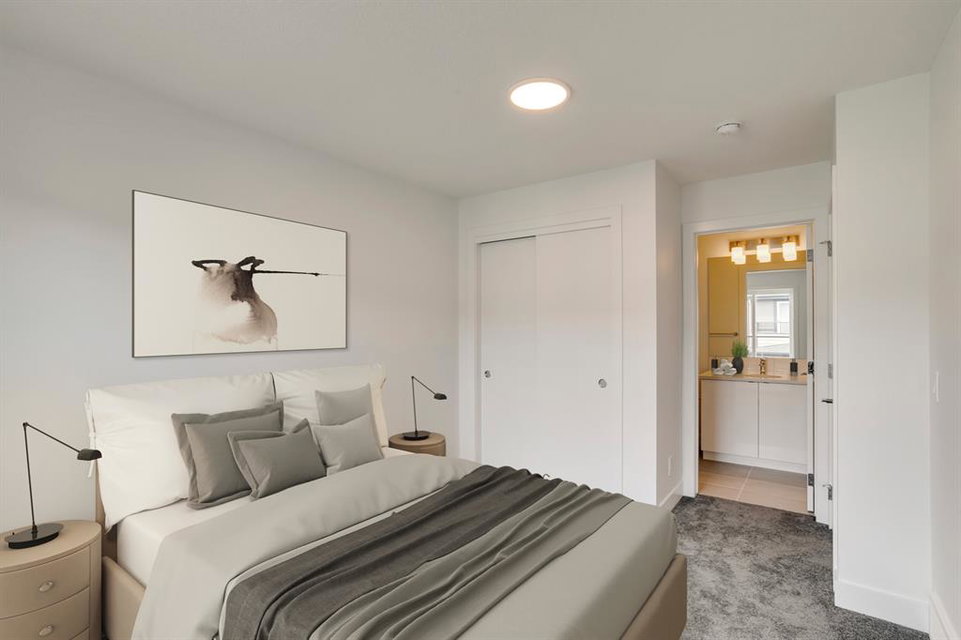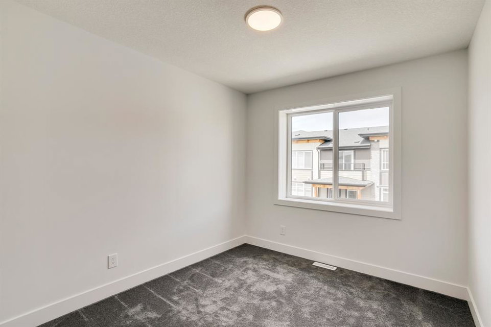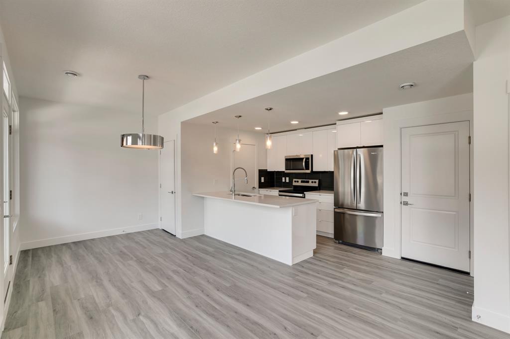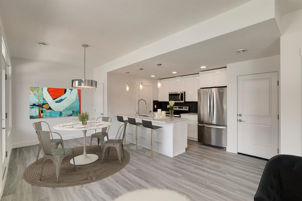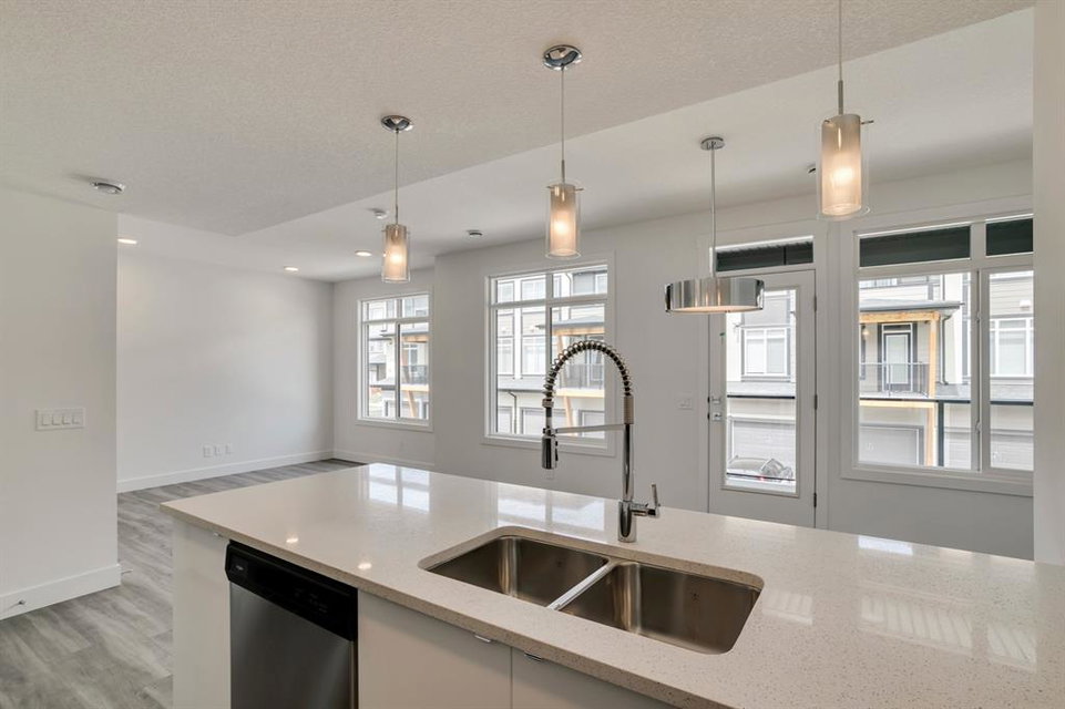 **END UNIT. The ‘Birch’ Built by Rohit Communities, one of Alberta’s largest homebuilders is a beautifully designed townhouse combining functionality and design, feeling more like a single-family home than a townhouse. Finished in the ‘Boho Chic’ interior, this intelligently designed open-concept main living area provides the perfect space for entertaining. The large kitchen is open to living and dining areas with walls of windows, providing a bright and timeless space. The kitchen features Two-tone white upper and blue base cabinets and gold hardware complimented with quartz countertops, designer fixtures, stainless-steel appliances, and laminate flooring in the living space and tiled bathroom floors. The upper level has a large master bedroom with a private ensuite & 2 comfortable bedrooms ideal for guests or as a home office area. Completing the upper level is a laundry room and a full bathroom. To top it off this home as a hard to find double attached garage with space for 2 vehicles + storage space. *Please note: property is under construction and photos are from a show suite. Actual homes finish will vary.