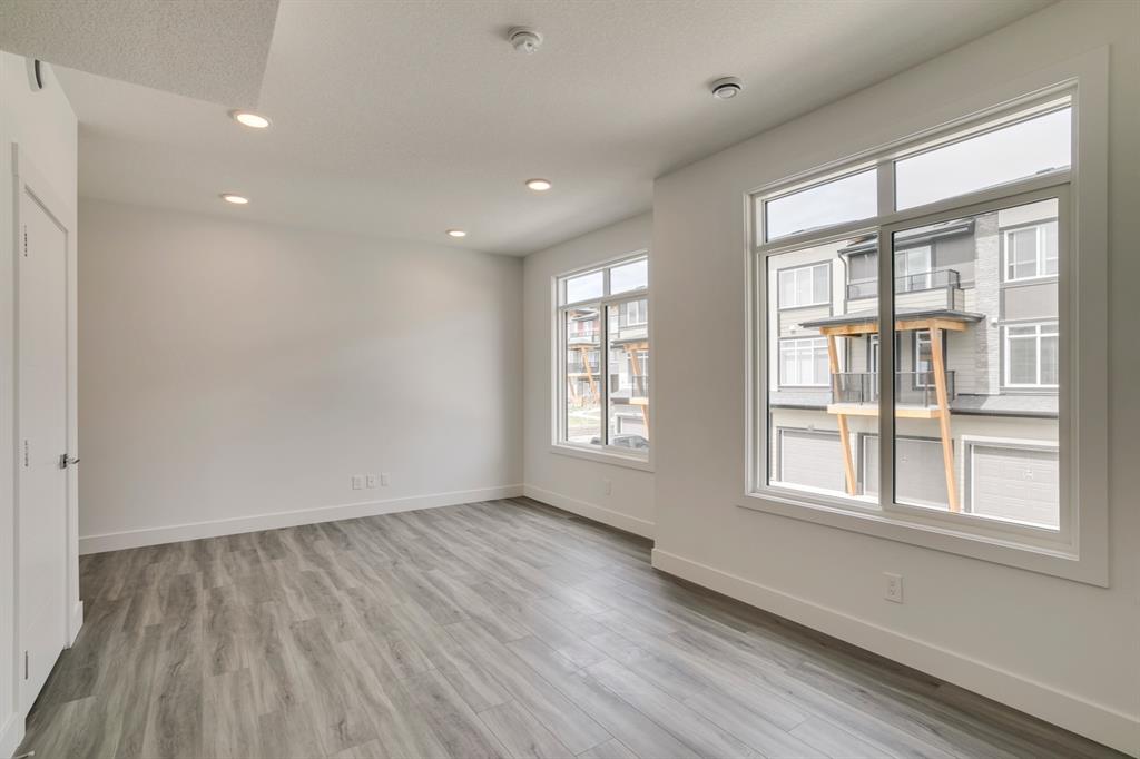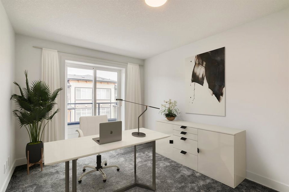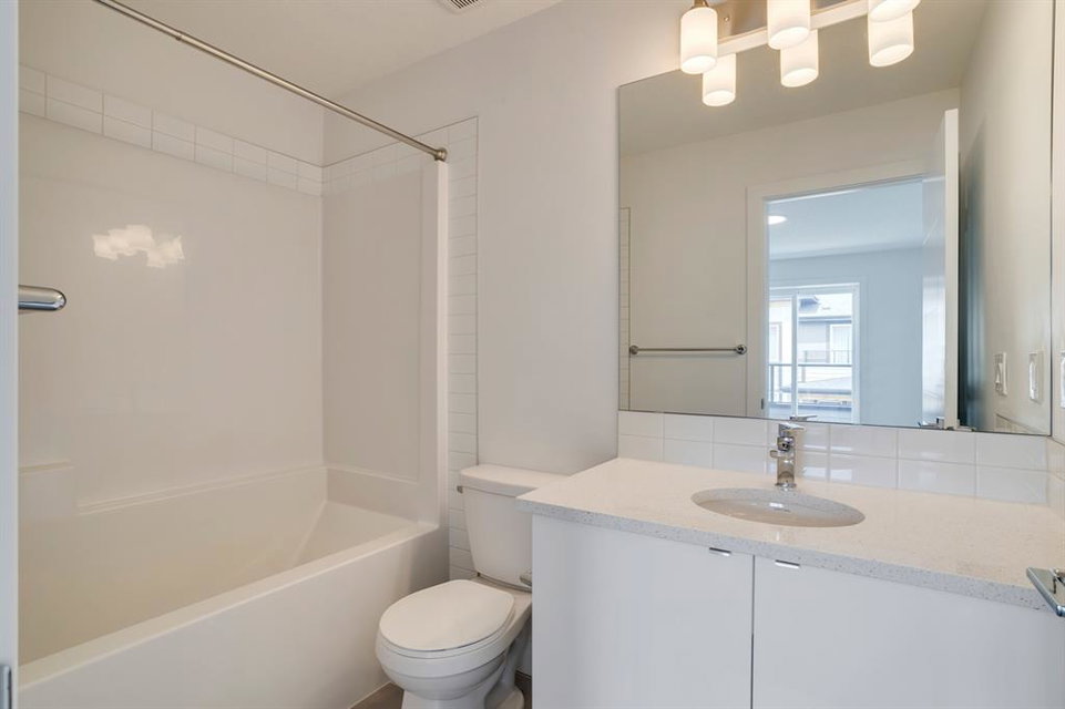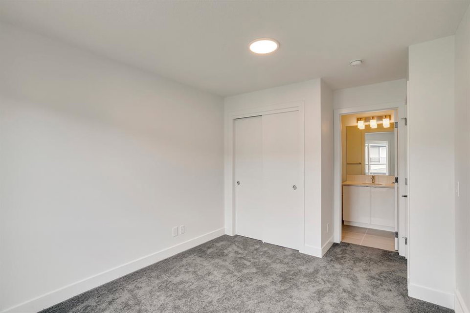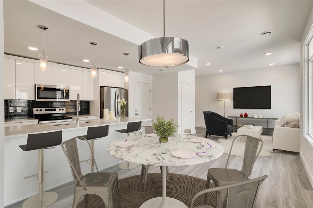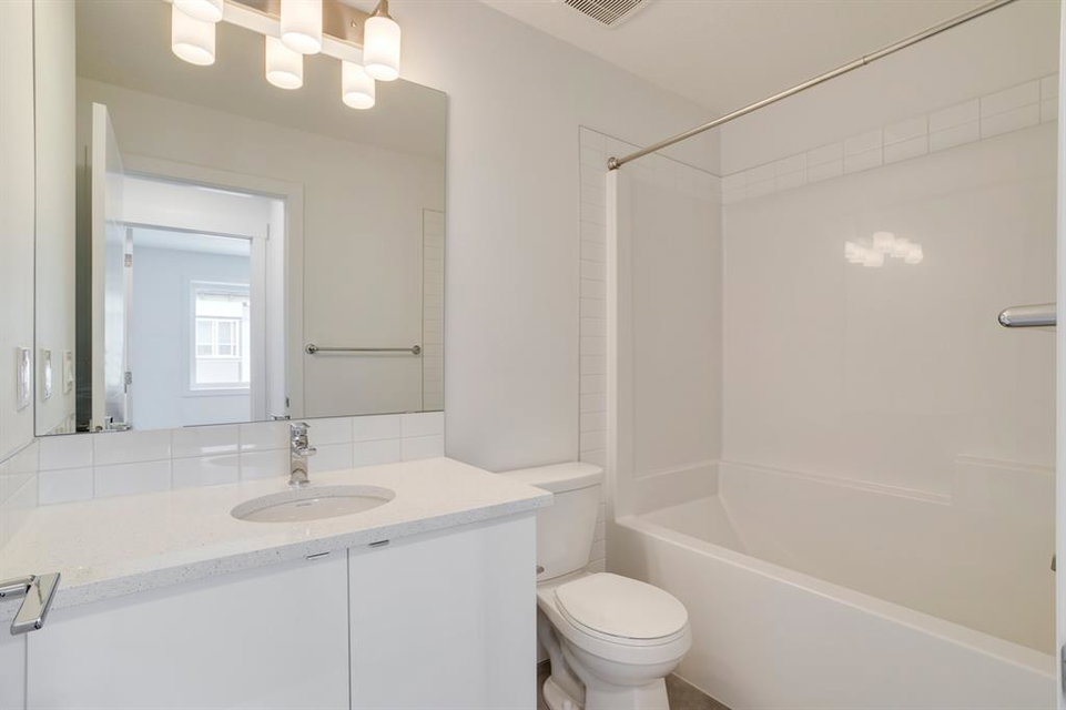 **END UNIT. The ‘Birch’ Built by Rohit Communities, one of Alberta’s largest homebuilders is a beautifully designed townhouse combining functionality and design, feeling more like a single-family home than a townhouse. Finished in the ‘Boho Chic’ interior, this intelligently designed open-concept main living area provides the perfect space for entertaining. The large kitchen is open to living and dining areas with walls of windows, providing a bright and timeless space. The kitchen features Two-tone white upper and blue base cabinets and gold hardware complimented with quartz countertops, designer fixtures, stainless-steel appliances, and laminate flooring in the living space and tiled bathroom floors. The upper level has a large master bedroom with a private ensuite & 2 comfortable bedrooms ideal for guests or as a home office area. Completing the upper level is a laundry room and a full bathroom. To top it off this home as a hard to find double attached garage with space for 2 vehicles + storage space. *Please note: property is under construction and photos are from a show suite. Actual homes finish will vary.