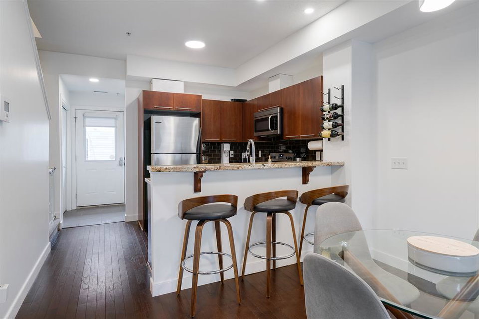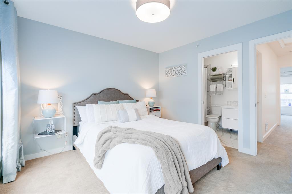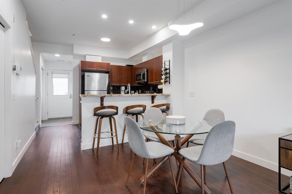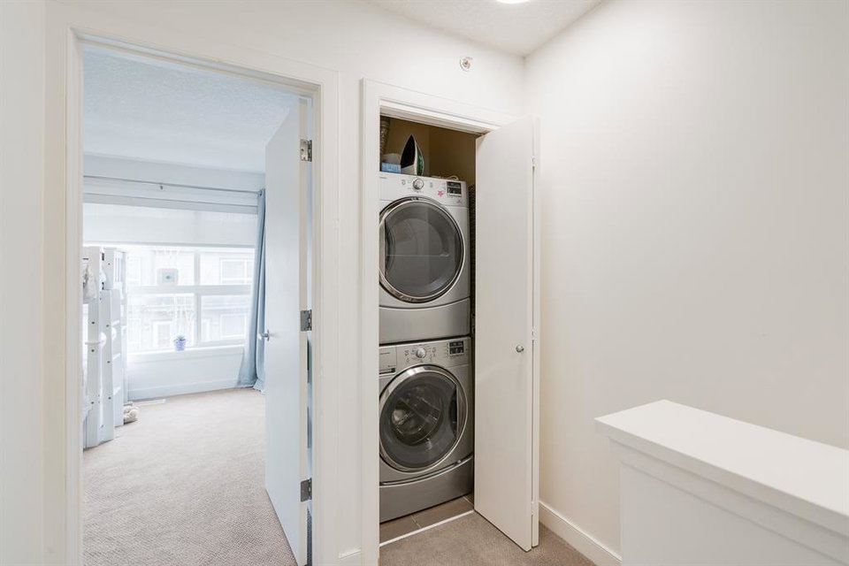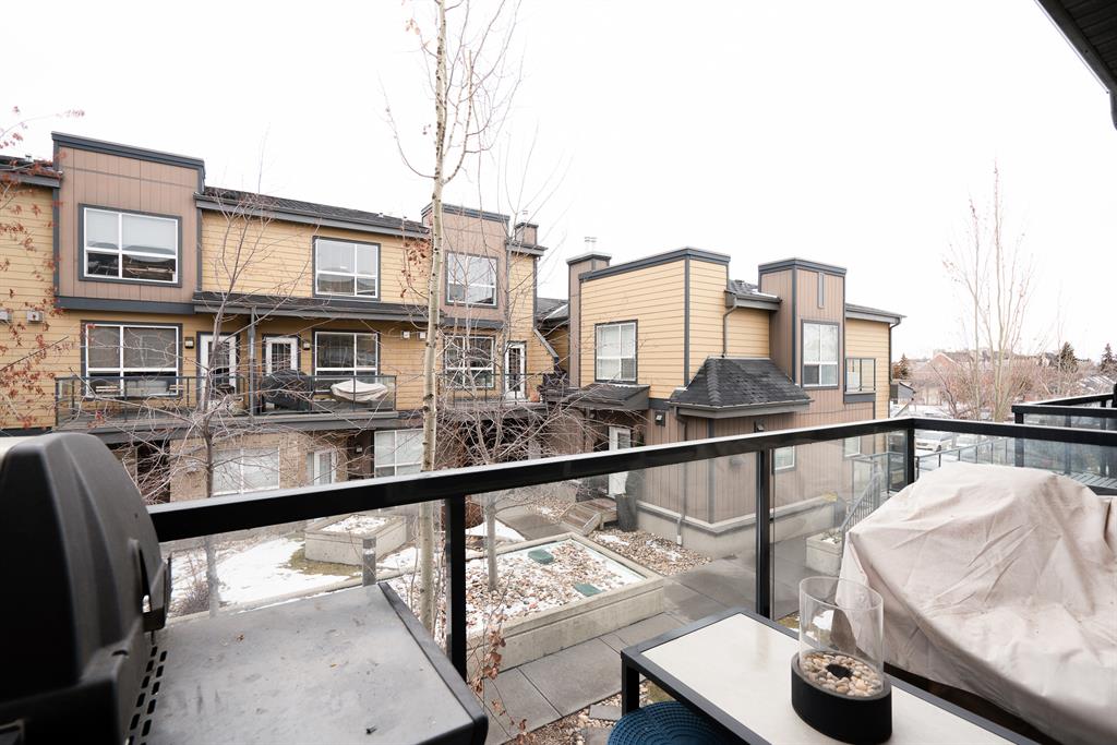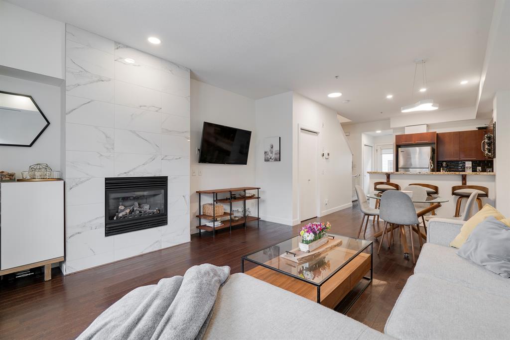 This beautiful 2 bedroom, 2.5 bathroom townhome is located in the heart of Marda Loop with convenient walking access to countless amenities. The dual-primary bedroom plan makes this property perfect for young professionals, investors, or a small family. The main level is bright and open with a kitchen complete with granite countertops that overlooks the main dining and living area. The living area includes a wall of windows providing natural light all day long. A central gas fireplace is perfect for winter nights and has been updated with new floor-to-ceiling tile. The dining area has ample space for a large table and there is additional seating at the raised eating bar. There is a powder room in the main level and a balcony off of the main living area that overlooks the central courtyard. The two primary bedrooms are located on the upper level – separate from the main living space. The large bedrooms are each complete with their own en suite and both have large windows allowing natural light to flow through all day. Laundry is conveniently located on the upper level. A titled underground parking stall and a storage locker are included with this townhouse. Recent updates include painting, carpet and tile work. This property is perfect for those looking to live the Marda Loop life with easy access to all the community has to offer. With low condo fees, maintenance-free living, your own private entrance/exit and no common hallways/elevators, this property is an ideal long term investment. Marda Loop’s development is getting better by the day – now is the time to invest in this beautiful and vibrant inner city community.