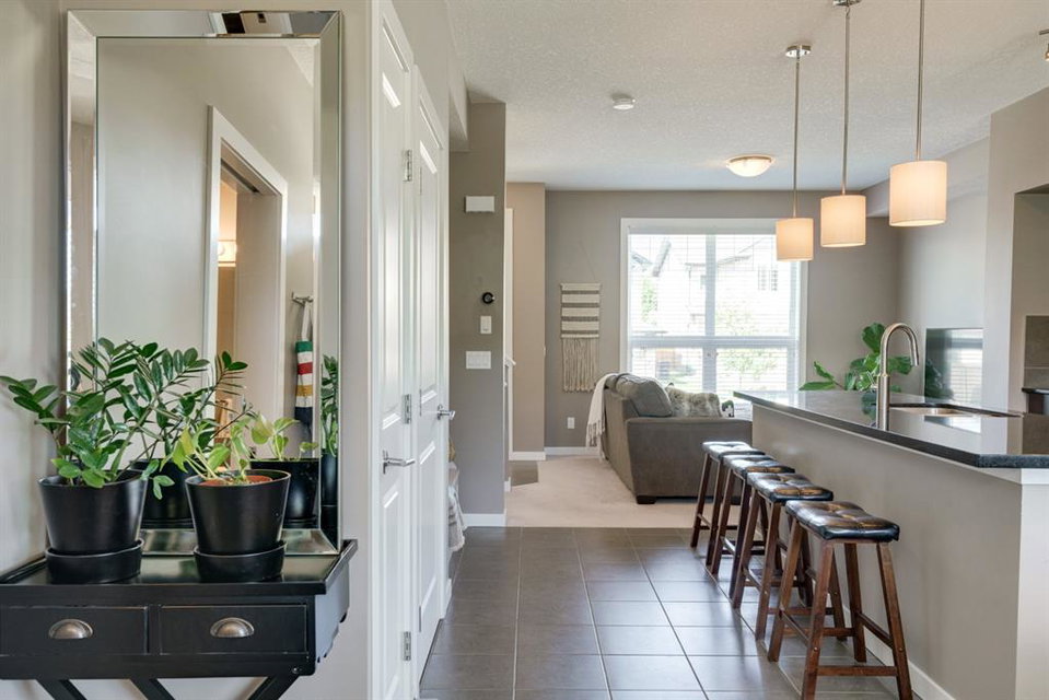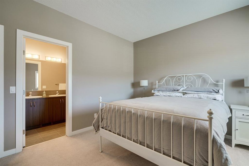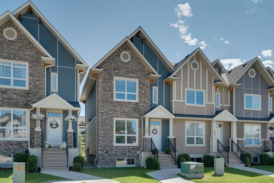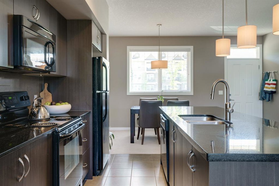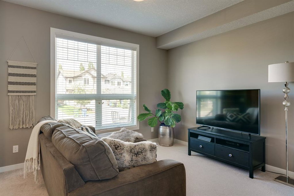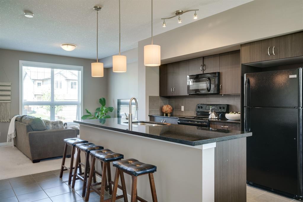 A beautiful 2 bedroom, 2.5 bathroom end-unit townhouse located in the heart of Cranston with easy walking access to nearby amenities including the grocery store and restaurants! This well-cared for townhouse has an open concept main level with 9′ ceilings that make the perfect bright and open space. The centre kitchen creates the perfect entertainment space and is open to both living and dining areas. The upper level (which also has 9′ ceilings) has a hallway nook that would be the perfect spot for a desk / office area and two master bedrooms. Master bedroom 1 is equipped with a walk-in closet and full 5 pc ensuite with dual sinks. The second master bedroom and full bathroom complete the upper level. The full basement is unfinished and awaits its new owner’s imagination with ample space for a bedroom, bathroom and rec area! A playground just steps away out the back door is perfect for those with children or visiting children. This beautiful townhouse provides maintenance-free living in an incredible location and is fully move-in ready!
