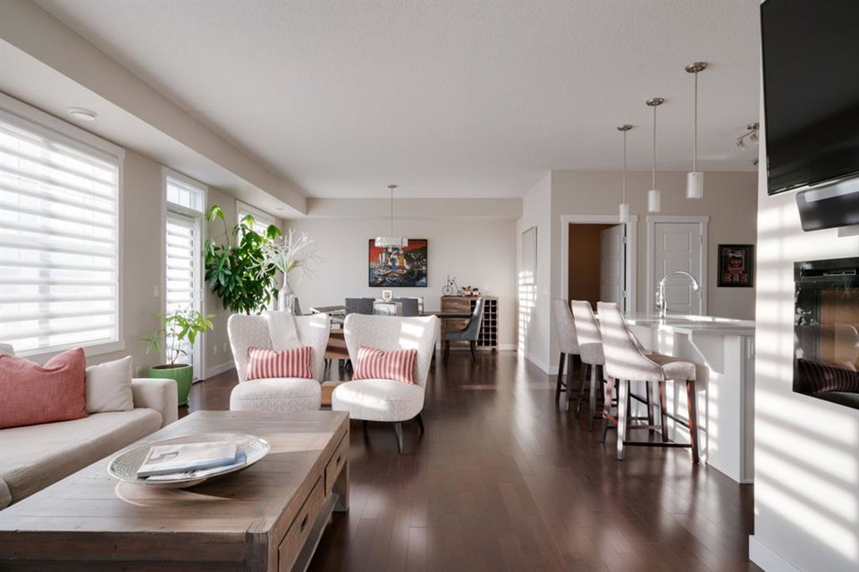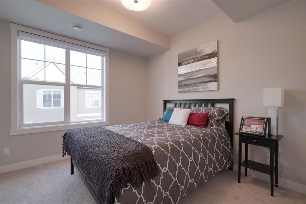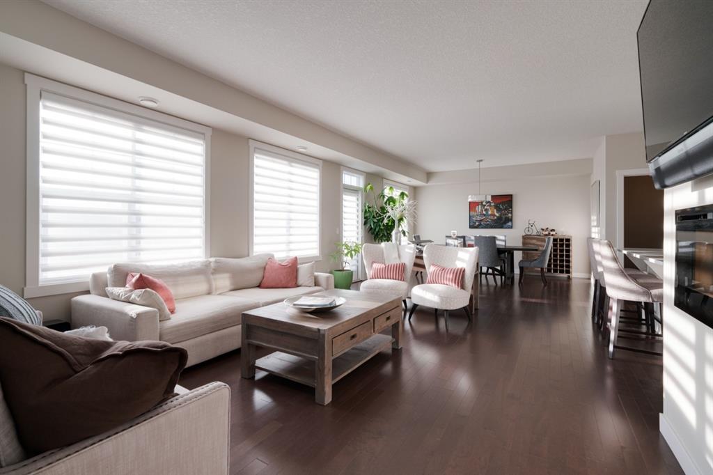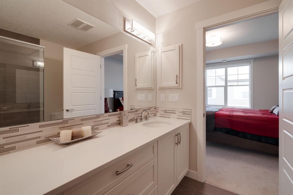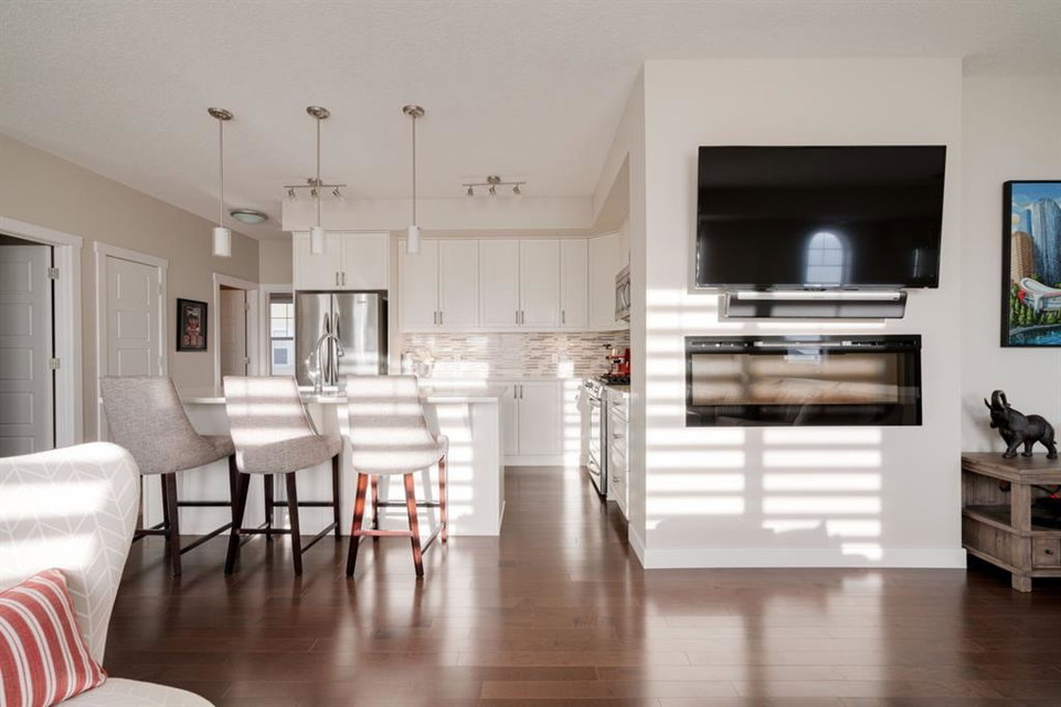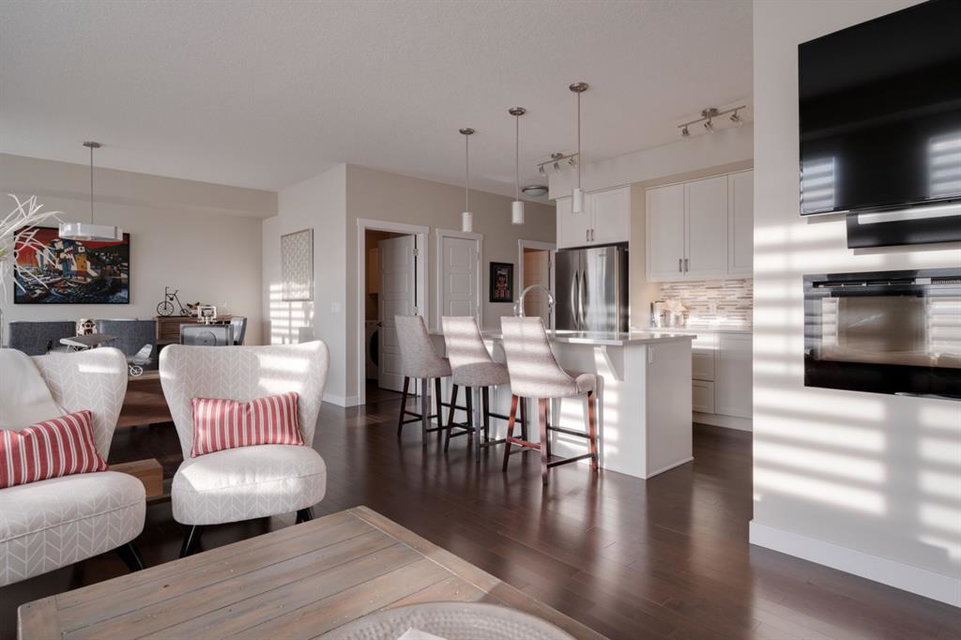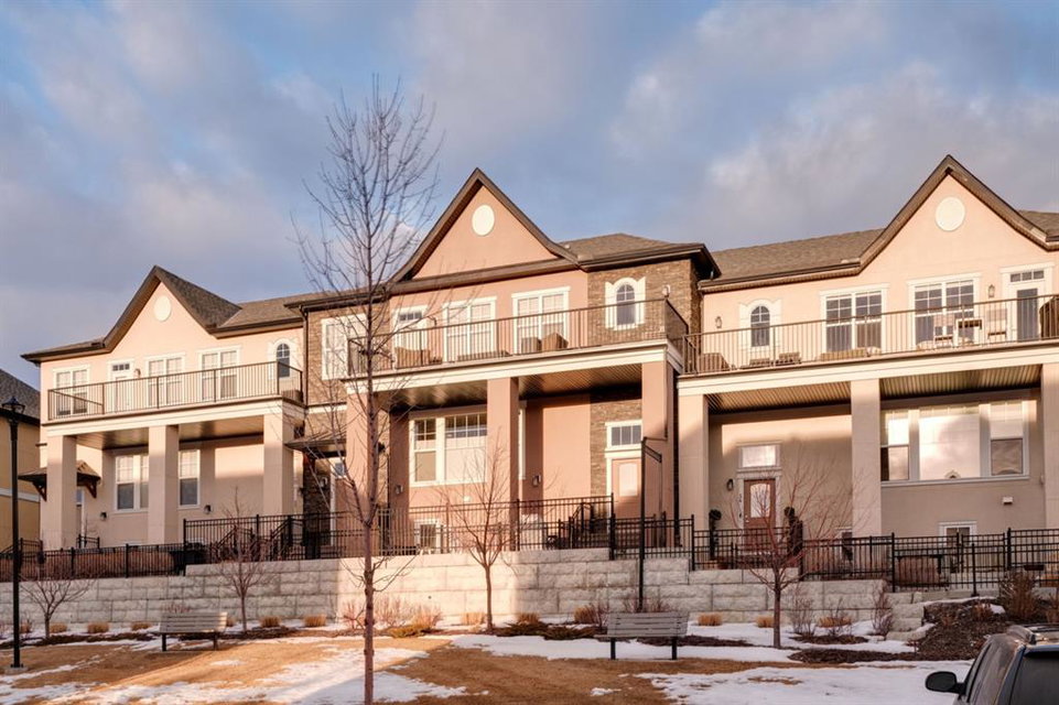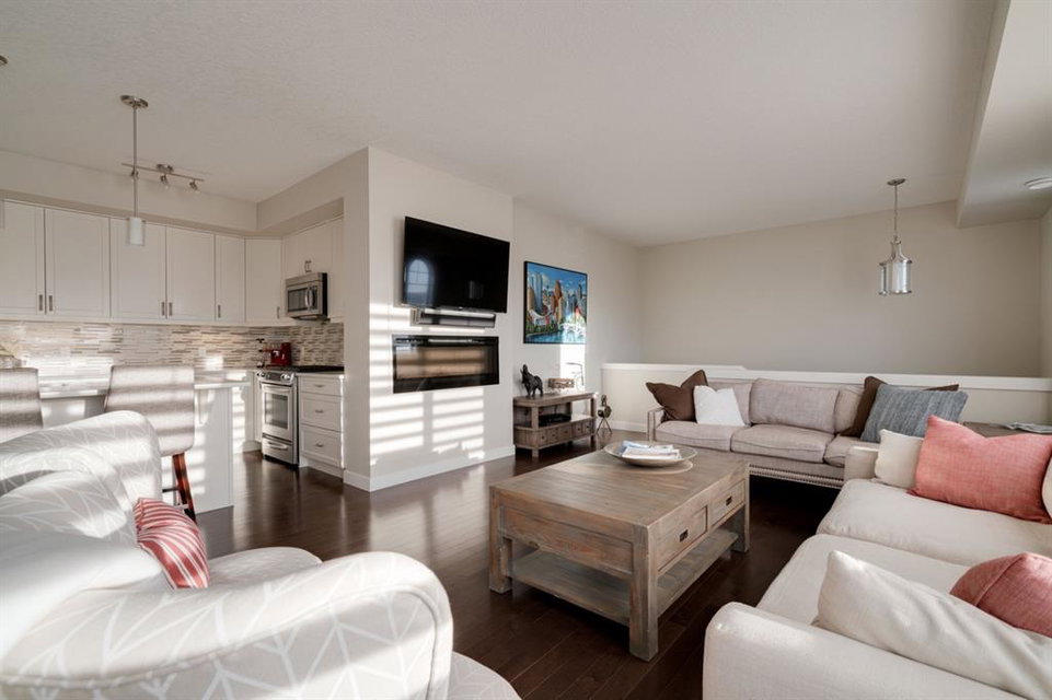 An incredible opportunity to own a former show home in desirable Mosaic Riverstone. Situated just steps away from the Bow River and surrounded by the beauty of Fish Creek Park, this property strikes the perfect balance of seclusion and convenience. This well maintained townhouse features single-level living offering 3 bedrooms, 2 bathrooms, ample storage and an open concept design. Natural light flows through a wall of south west facing windows and floods the home with sunshine. The timeless white kitchen is complete with under-mount lighting, mosaic tile backsplash, quartz countertops and a suite of stainless steel appliances including a gas range. The kitchen overlooks the large dining area with ample seating for family dinners and living room with electric fire place making it the perfect space for entertaining. The large primary bedroom is complete with a walk-in closet, 4 piece bathroom with a full height tile shower and dual sinks. Two additional bedrooms allow ample space for a guest room and home office while the full laundry room provides added convenience for daily living. The lower level of the property provides endless possibilities for additional storage, a home gym or studio space. A double garage with epoxy flooring provides additional storage for bikes and provides secured parking for your vehicle all year. The show homes always include the upgrades that everyone wants like upgraded lighting, flooring, custom window treatments (Hunter Douglas) and more. Enjoy the sunshine and the views on your private WEST facing 29’x8′ balcony all summer long. If it gets too warm, step inside and enjoy the central air-conditioning (an absolute MUST in these units). With quick access to amenities and only minutes from Fish Creek Park, this home is the perfect fit for those looking to live in beautiful Riverstone surrounded by nature.