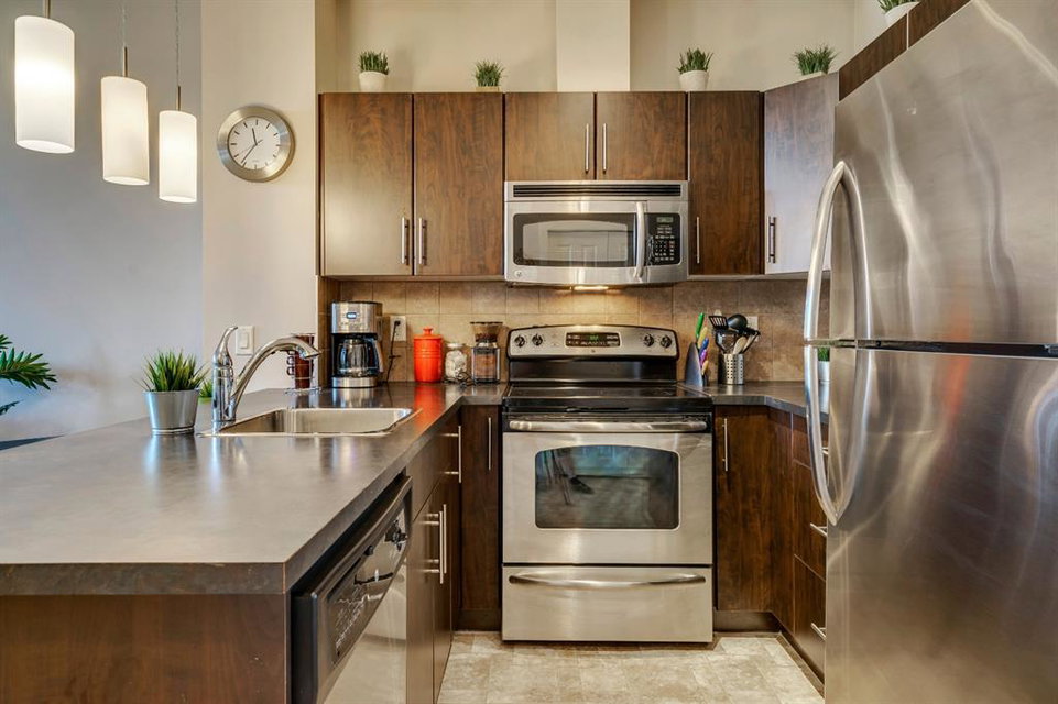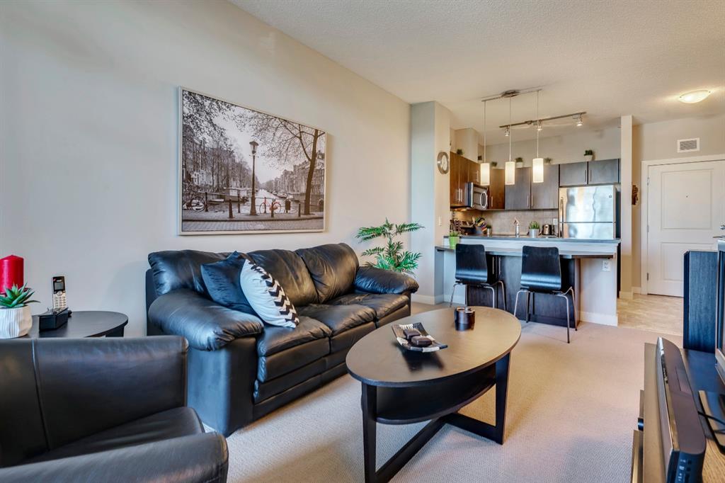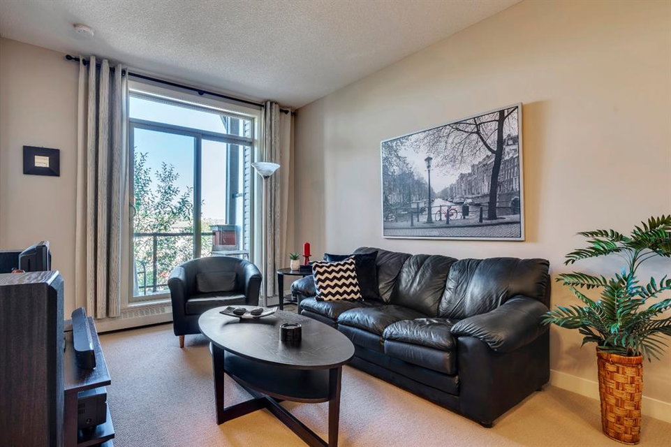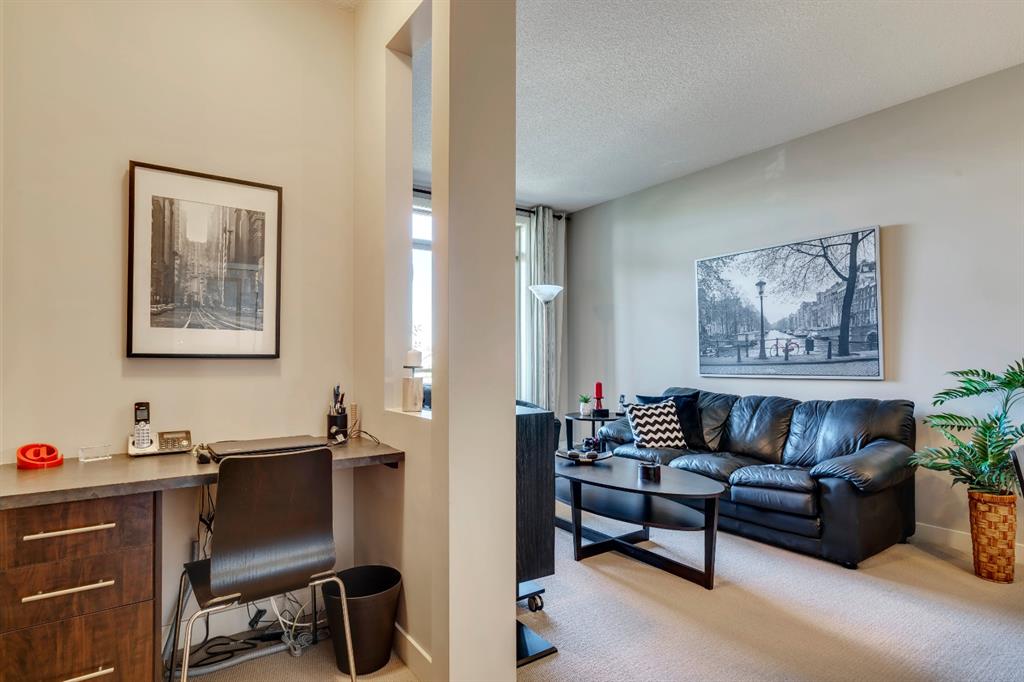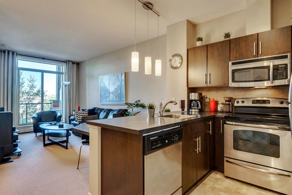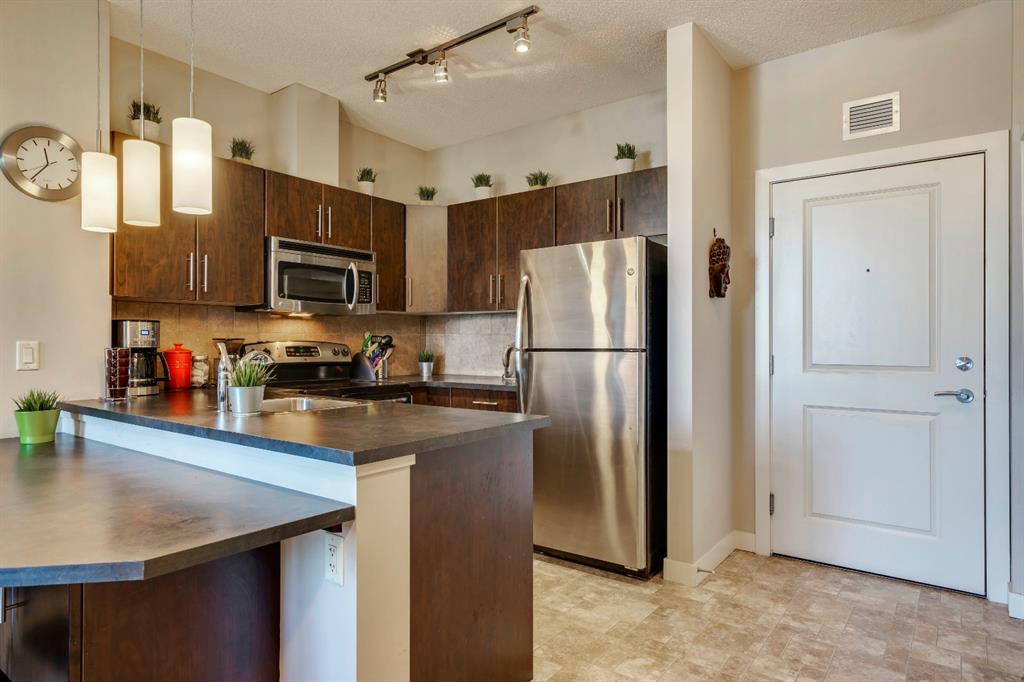 This impeccably maintained Corner Unit is the ideal condo for a first time homebuyer or investor looking to build equity. Located on the Top Floor of The Ascent Condos, built by award-winning Jayman, has only one adjoining neighbour attached in this quiet suite that is just steps away from Valleyview Park and an effortless commute to the downtown core. The home includes an open concept with a kitchen that overlooks both living and dining areas. It’s complete with resilient linoleum flooring, and built-in stainless steel appliances in the kitchen with an extended eat-in bar. The open concept layout is perfect for entertaining and allows ample natural light into the unit from morning to night. The unit has a large master bedroom complete with a walk-in closet, a full bathroom and in-suite laundry with additional storage. Working or studying from home is a breeze with a built-in office station situated conveniently between the kitchen and living room. Enjoy the outdoors on your large private covered balcony complete with natural gas hook up or explore the countless pathways surrounding the building. A Titled underground heated parking stall is included with this unit. This condo is perfectly laid out and meticulously maintained with low monthly fees that cover common area maintenance, heat, water/sewer, and building insurance with a flexible possession date!