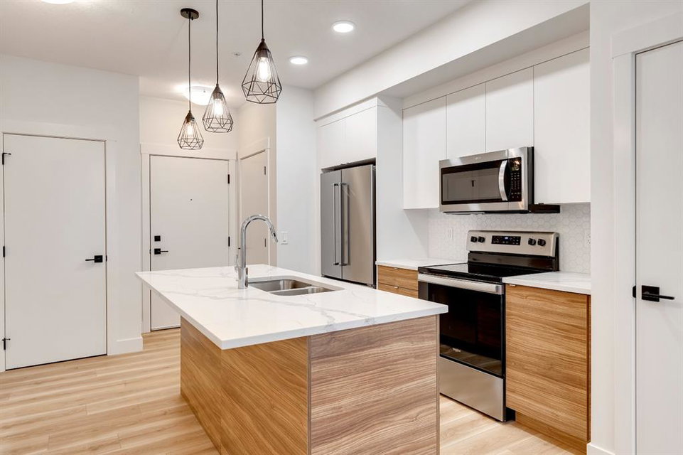Turn your design dreams into reality with the ‘Rubino’ in Mira at Seton Circle. This 1-bedroom + den condo in the heart of Seton offers an exceptional first home with ample space for a home office while providing plenty of space for daily living and an excellent entertaining area. At Rohit Communities, it’s not just about a functional floorplan, but having a home that you’re proud to show off. Designed for connection and livability, Mira at Seton Circle will help you reach your designer apartment goals. Choose from one of the beautiful designer interiors featuring quartz countertops with waterfall edge, designer kitchen cabinets with LED lighting, rain shower head in bathroom and luxury vinyl plank and tile flooring. Beautifully landscaped throughout with an enclosed dog park the amenities at Mira are unparalleled. App controlled video security and lockers for your deliveries, electric car chargers and bike storage. Completing the home is a private balcony and titled underground parking stall. Alberta New Home Warranty included with the purchase of this new condo that provides maintenance-free living all year long. *Please note, photos are from a show home model and are not an exact representation of the property for sale