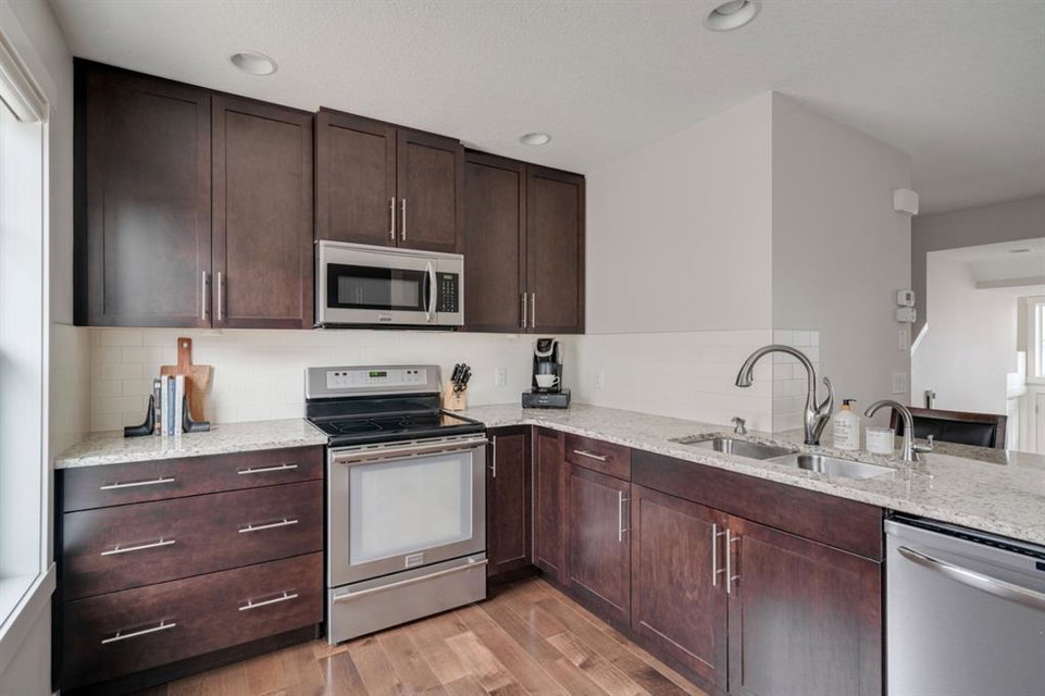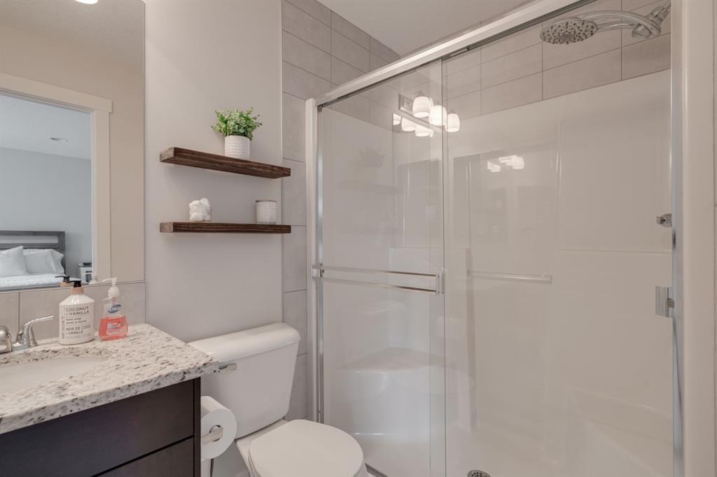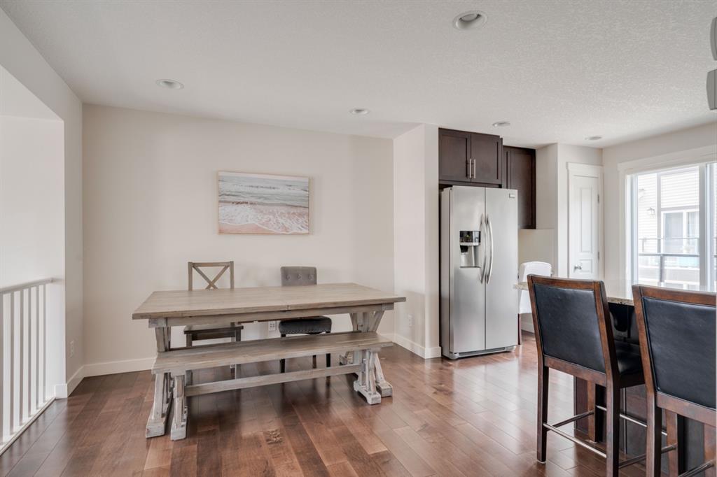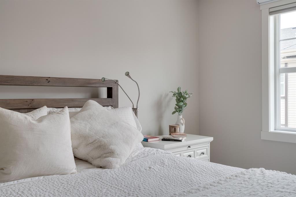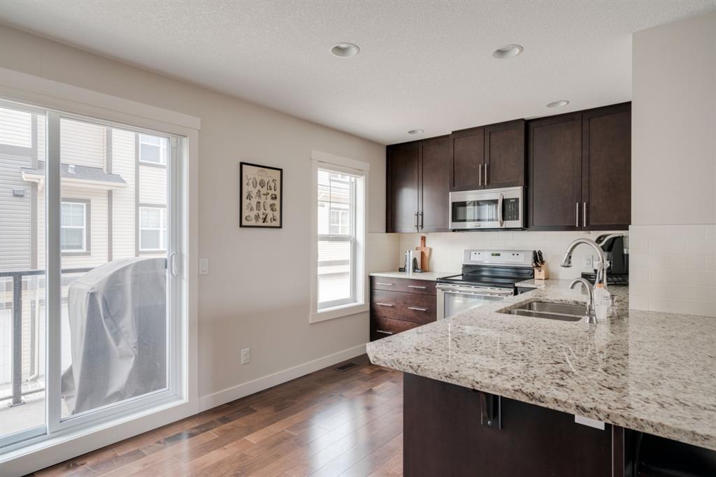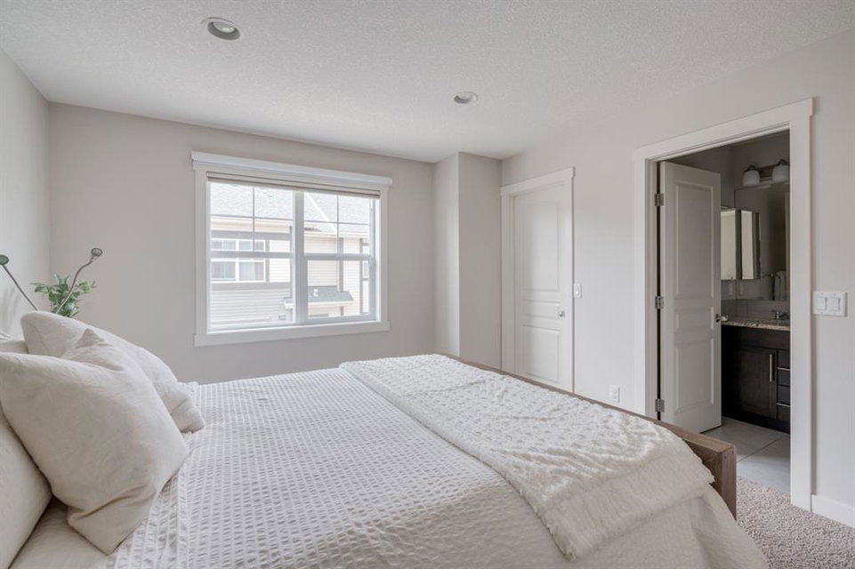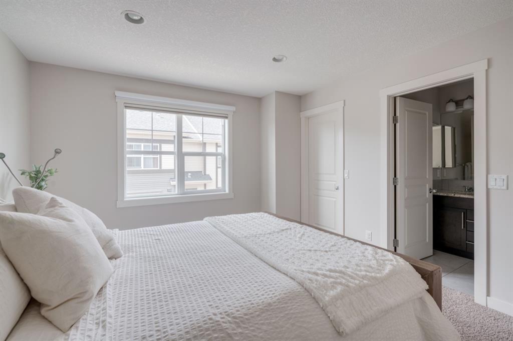 This immaculate and like-new townhome is ideally located on the perimeter of Mosaic Mirage – giving it easy access to the street, additional parking and a more natural light. Featuring 2 bedrooms, 2.5 bathrooms and a double attached garage, this townhome is perfectly located within desirable McKenzie Towne, just steps from the countless amenities of High Street. The bright and open main living area includes a front double volume living room with oversized windows. The full dining area overlooks the living room providing a bright and open space. The home features beautiful hardwood flooring throughout the main level, custom Hunter Douglas window treatments and a timeless kitchen with shaker cabinets, granite countertops and a wraparound flush eating bar. The main level is complete with a half bathroom and a private rear balcony. The second level features two primary bedrooms, each complete with their own walk-in closets and full en suites. Completing the upper level is stacked laundry for added convenience to daily living. The lower level of the home offers a mud room and additional storage space. The double attached garage will keep your vehicles and valuables safe all year long and the front patio space is perfect for lounging in the summer. If the summer heat is too much for you, the central air conditioning in the home will keep you cool. This home is perfect for down-sizers, first time buyers, young professionals and investors! Incredibly well cared for and perfectly located, this bright and private townhome is fully move-in ready!