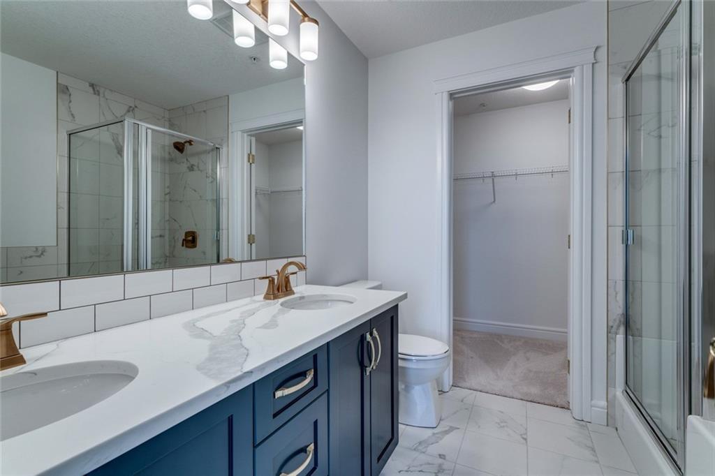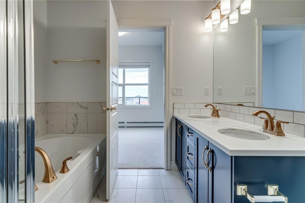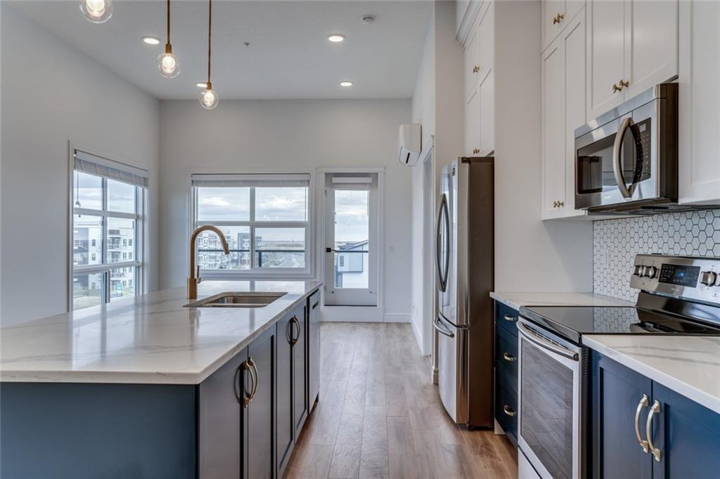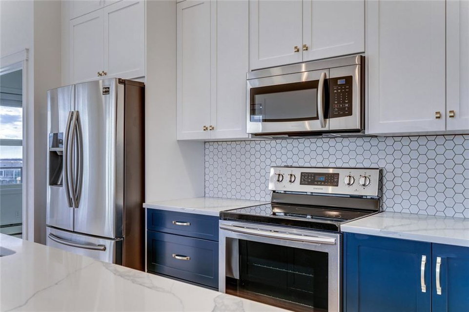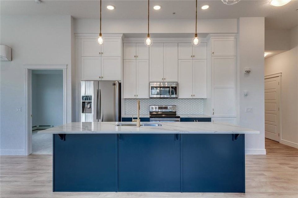 Built by Rohit Communities, one of Alberta’s largest homebuilders with over 35 years of experience, this TOP FLOOR Corner suite features incredible 11 ft ceilings, an underground parking stall and storage, A/C and upgraded appliances. This home is finished in our Boho Chic designer interior with beautiful lower blue cabinets accented with brass hardware, marble style quartz countertops throughout, laminate flooring in the living space and tiled bathroom floors. The dream like ensuite features a hard to find separate soaker tub and tiled shower, along with double sinks and a large walk in closet. The Argento is thoughtfully planned to be a spacious, easy to live in space with lots of necessary storage components for a clean and tidy appearance. The kitchen and living space is centrally located, separating the bedrooms for privacy. The second bedroom has a cheater ensuite for ultimate privacy and convenience.
