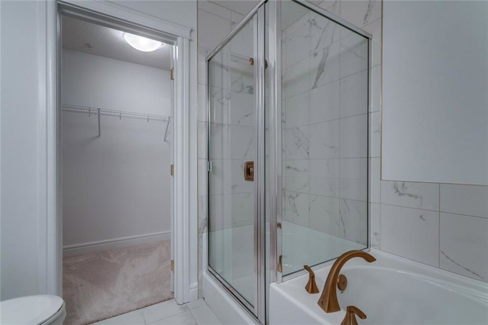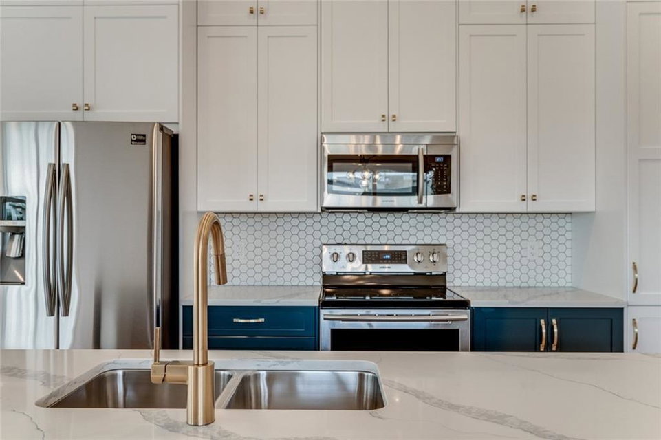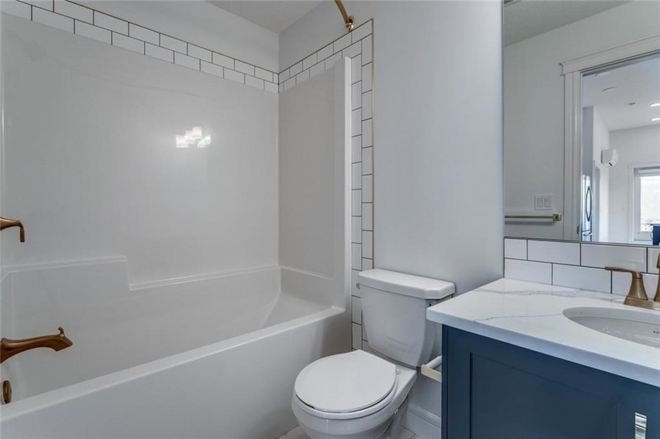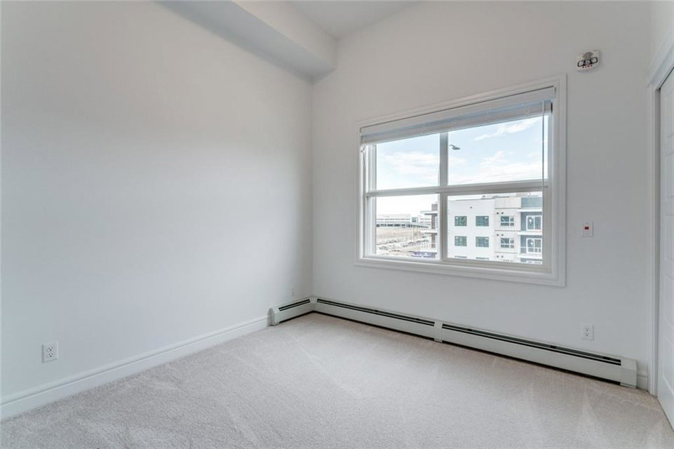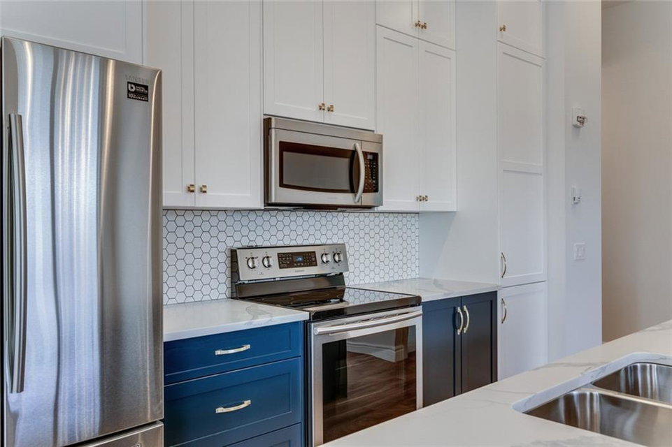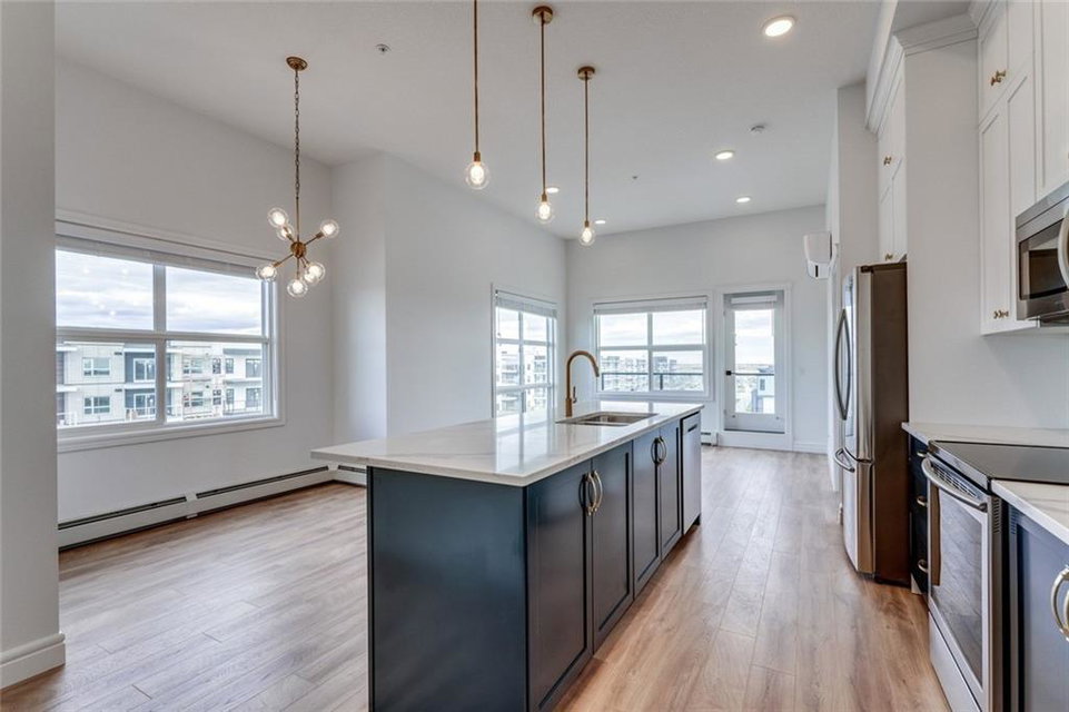 Built by Rohit Communities, one of Alberta’s largest homebuilders with over 35 years of experience, this TOP FLOOR Corner suite features incredible 11 ft ceilings, an underground parking stall and storage, A/C and upgraded appliances. This home is finished in our Boho Chic designer interior with beautiful lower blue cabinets accented with brass hardware, marble style quartz countertops throughout, laminate flooring in the living space and tiled bathroom floors. The dream like ensuite features a hard to find separate soaker tub and tiled shower, along with double sinks and a large walk in closet. The Argento is thoughtfully planned to be a spacious, easy to live in space with lots of necessary storage components for a clean and tidy appearance. The kitchen and living space is centrally located, separating the bedrooms for privacy. The second bedroom has a cheater ensuite for ultimate privacy and convenience.