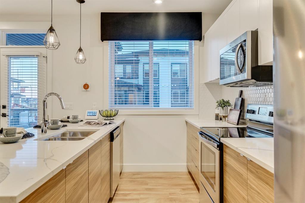 The ‘Ferrera’ built by award-winning Rohit offers 3 bedrooms, 2.5 bathrooms and a private attached garage all situated in the heart of Seton, Calgary’s New Urban District. Conveniently located within walking distance to South Health Campus and Seton’s ever-growing shopping district, this location doesn’t get better! The intelligently designed townhouse has an open-concept main living area that provides the perfect space for entertaining. This home is finished in the ‘Contemporary Classic’ Designer Interior featuring white quartz countertops paired with Two-tone white upper and grey base cabinets. The large kitchen is complete with designer fixtures and stainless steel appliances while overlooking the living and dining area. The upper level is complete with a master bedroom with full ensuite and walk-in closet in addition to another full bathroom and 2 bedrooms, making the perfect space for a small family. Enjoy the lifestyle this brand new Seton townhome has to offer – walking distance to virtually all daily amenities combined with a beautiful new home with attached garage. *Note: Photos from show home and are not an exact representation of the property for sale.