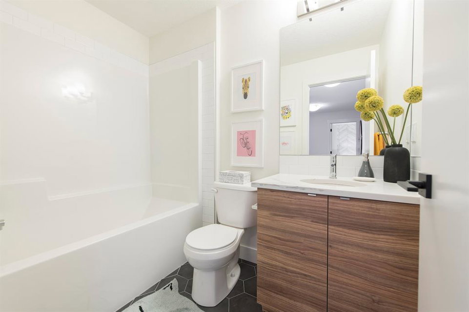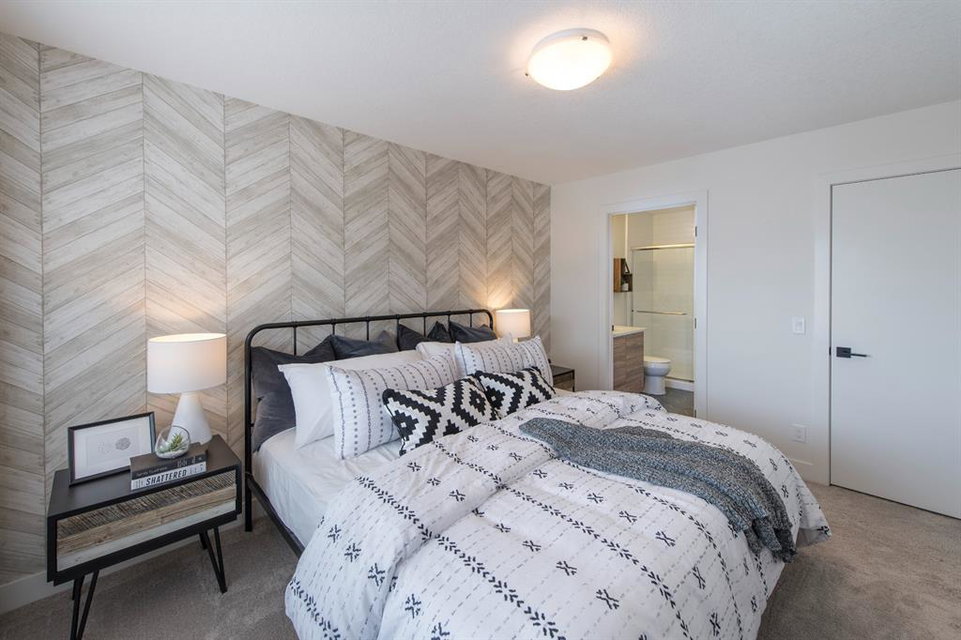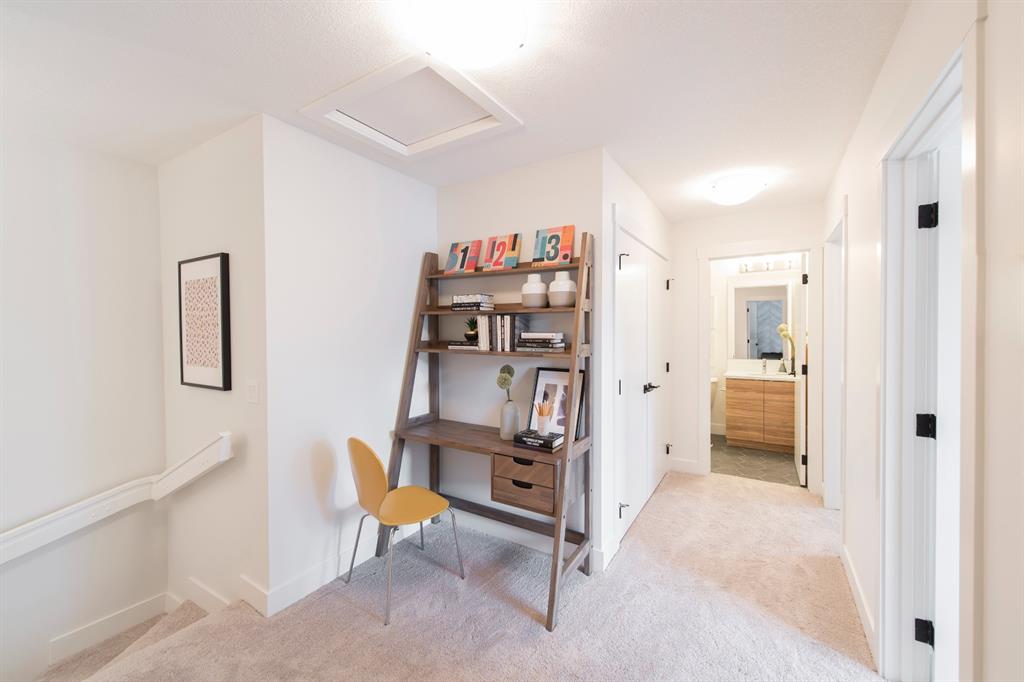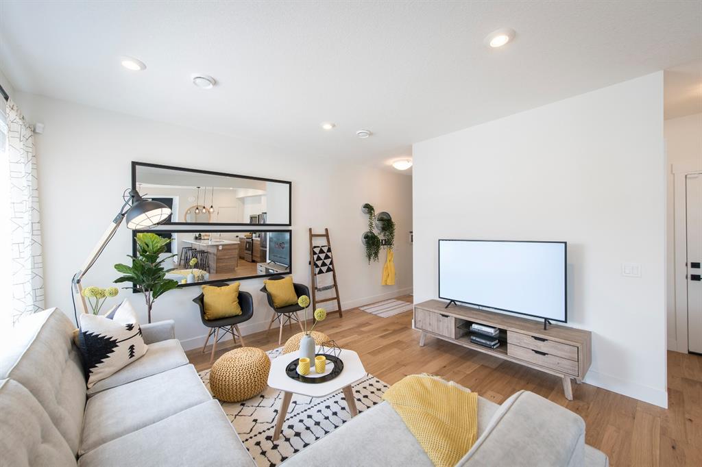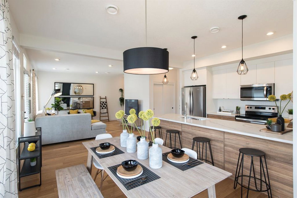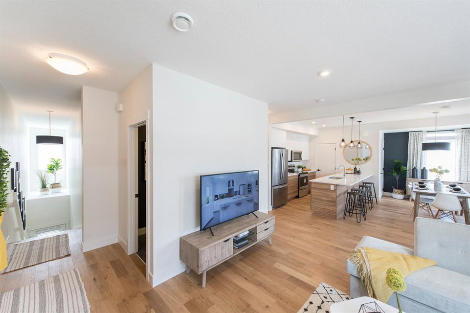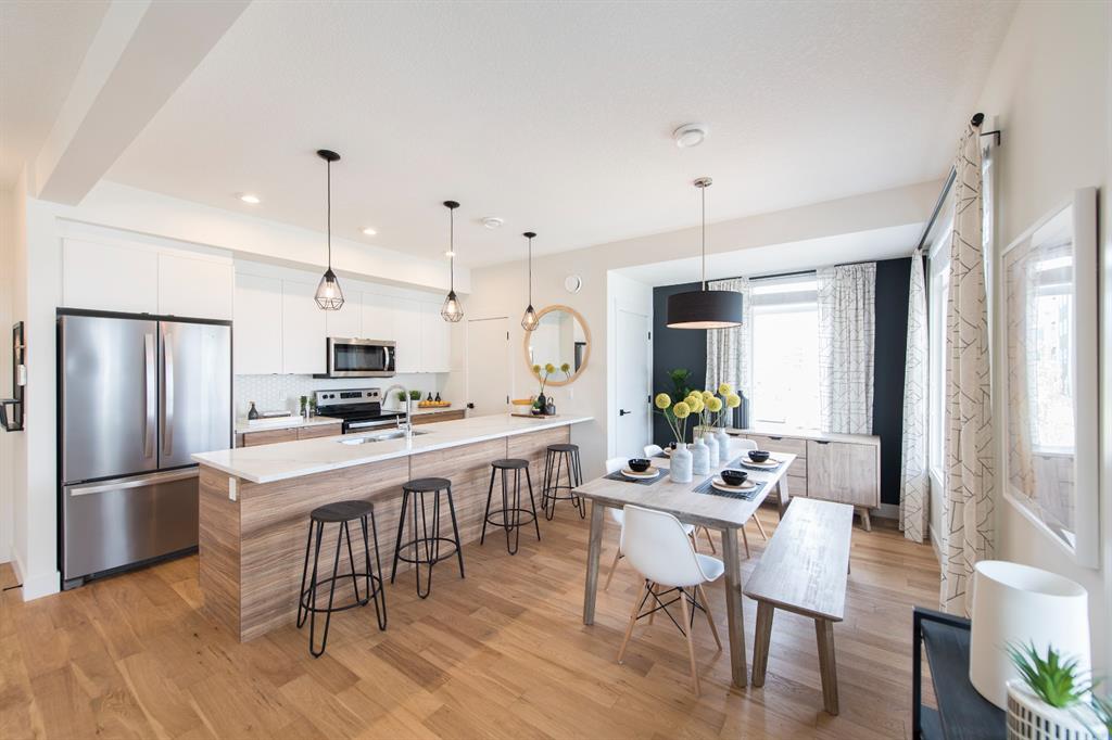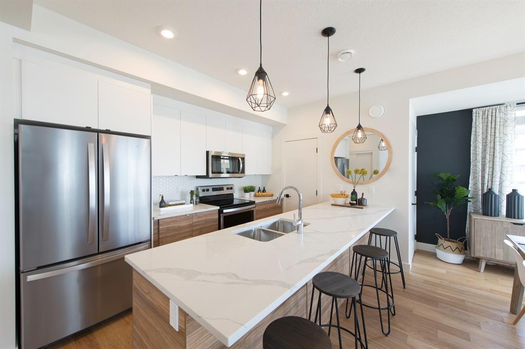 The ‘Bergen’ Built by Rohit Communities, one of Alberta’s largest homebuilders is a beautifully designed townhouse that combines functionality and design, feeling more like a single-family home than a townhouse. The large kitchen is open to living and dining areas with walls of windows, providing a bright and timeless space. This home is finished in the ‘Boho Chic’ designer interior featuring sparkling white quartz paired with white upper cabinets and lower blue cabinetry finished with antique gold and brass hardware, stainless-steel appliances and luxury flooring. The upper level has a large master bedroom with a private ensuite & 2 comfortable bedrooms, a full bathroom & ample space for an office on the upper level. This home includes a private attached double garage with a full-width double driveway and a full warranty! Located within walking distance to the South Calgary Health Campus and the countless amenities of Seton including the new YMCA