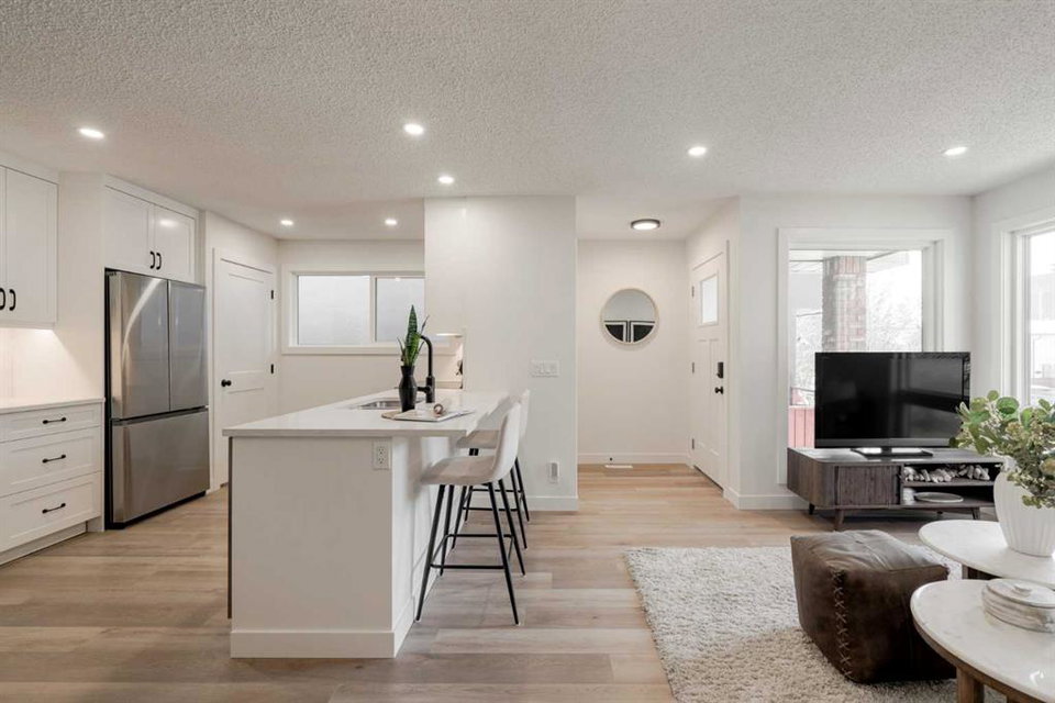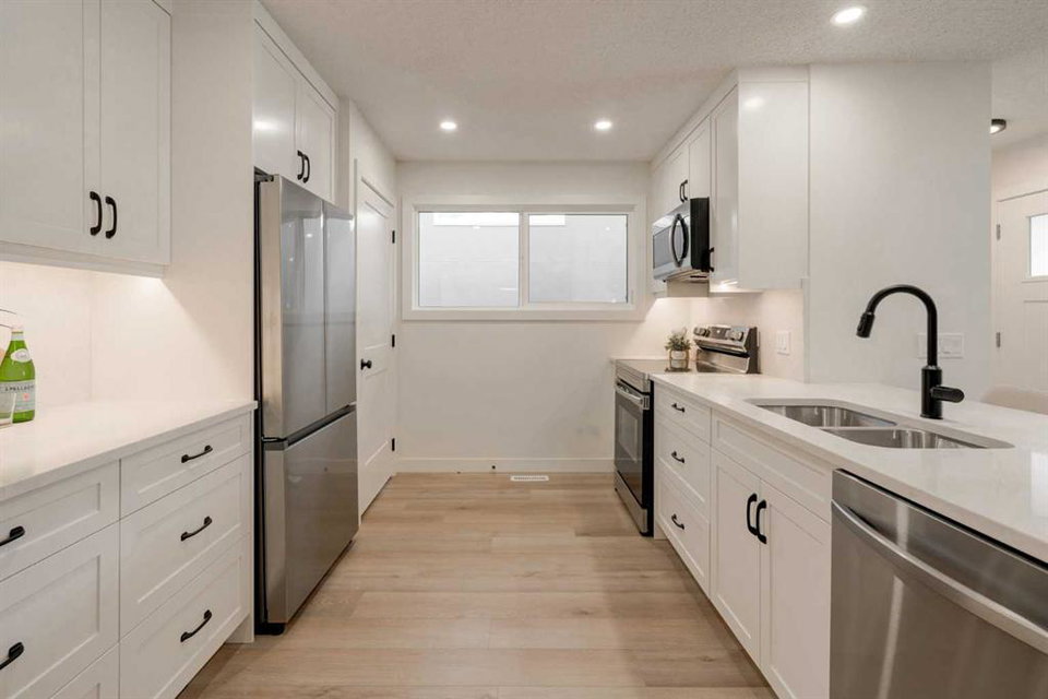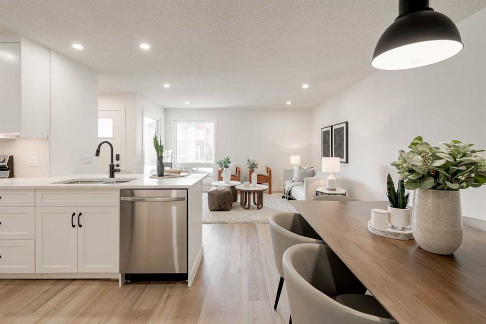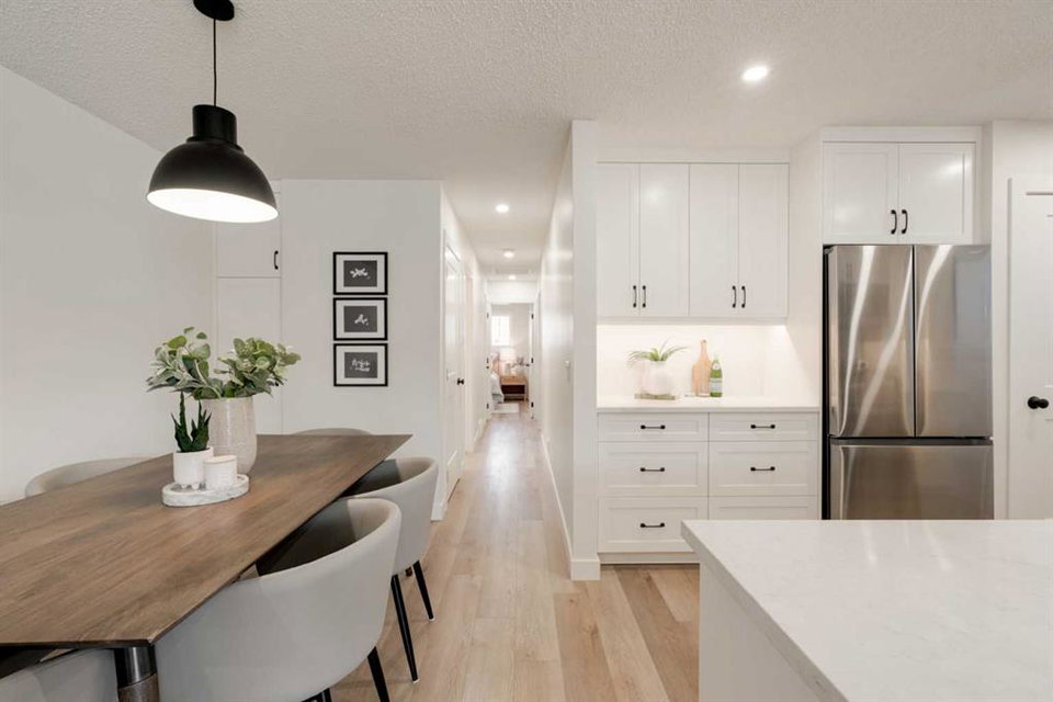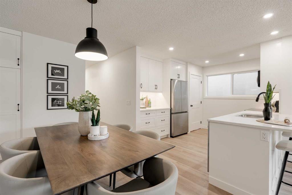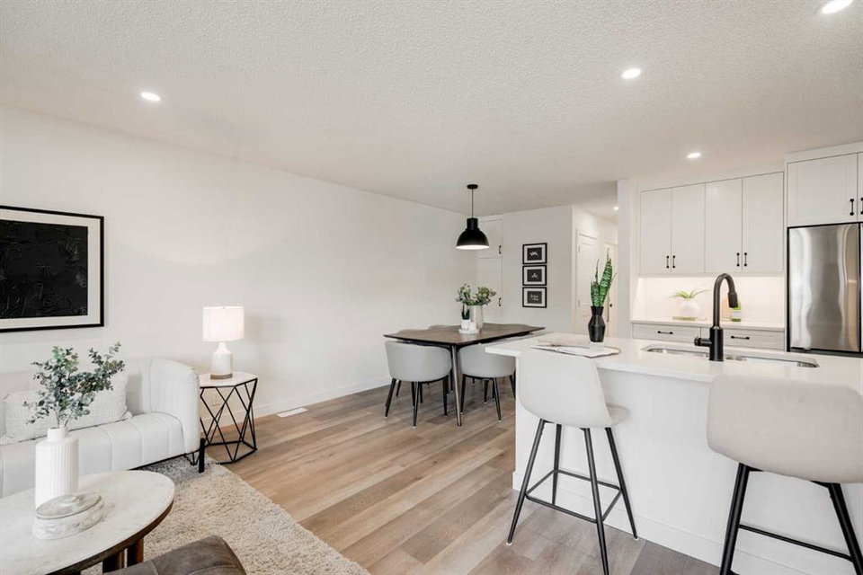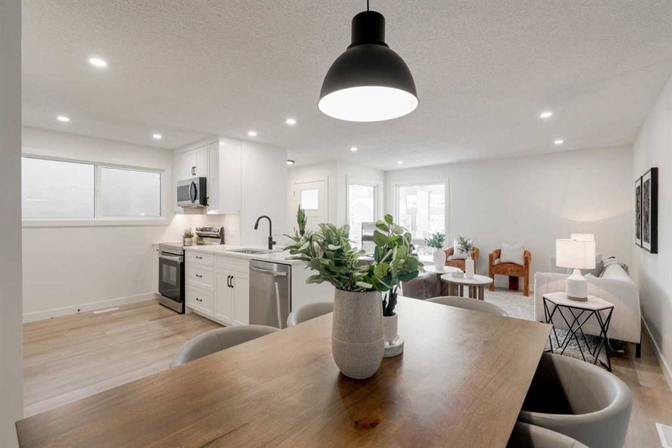 This beautifully renovated property features 3 bedrooms, 2 bathrooms and main floor laundry with over 1,000 square feet of living space on the main level alone, offering bungalow-living in this professionally renovated home! The property is perfectly located with easy access to downtown, the mountains and just a 1 minute walk to nearby amenities and restaurants. The side entrance with direct access to the basement and M-CG zoning mean this property is perfect for a LEGAL BASEMENT SUITE to assist with monthly costs if desired (adding a legal suite for rental purposes would be subject to approval and permitting by the city/municipality). *Suited basement plans available upon request. Renovations include new windows, furnace, hot water tank, new vinyl and tile flooring, new cabinets (kitchen and bathrooms), fresh paint throughout, new appliances, plumbing fixtures, lighting and electrical updates. The timeless white kitchen is complete with quartz countertops and backsplash, pot and pan drawers, under cabinet lighting and a new Samsung appliance package. The kitchen has a peninsula with additional seating and overlooks both the living and dining areas. The expansive living area has two large SW-facing windows that allow natural light to pour through the home all day long. The large dining area has ample space for a dining table for six and a pantry space for added storage. Resilient vinyl flooring flows throughout the entire home (perfect for pets and children) with tile in the bathrooms – meaning no carpet at all! The primary bedroom has space for a king bed and a private ensuite with dual sinks and a tiled walk-in shower. Two more generous-sized bedrooms, a main bathroom, linen closet and stacked laundry complete the main level. The large backyard is partially fenced and includes a patio space and parking for 3 vehicles. This beautiful new home has endless potential and is incredibly well located in the highly desirable community of Montgomery. Book your private viewing today!