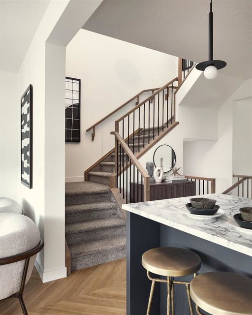 The ‘Rundle’ is a brand new home built by award winning Brookfield Residential and located in one of Calgary’s newest growing communities – Livingston! Featuring nearly 1,900 square feet of living space over the top two levels, this 3 bedroom, 2.5 bathroom home is complete with two living areas, an open concept main level, a double attached garage and an expansive basement with ample space for a fourth bedroom, living area, full bathroom and storage! The bright and open main level features a corner kitchen with an island that opens to both the living and dining areas. The kitchen is complete with warm two-tone cabinetry with timeless white perimeter cabinets and a wood-tone accent island. Quartz countertops, black fixtures and hardware, including a silgranite sink and a suite of stainless steel appliances complete the kitchen. The main living room has a central electric fireplace and a wall of windows overlooking the backyard. Sliding patio doors lead from the dining area to the yard – making the perfect space for entertaining and cooking. A 2 pc powder room and expansive mudroom with walk-through pantry complete the main level. The upper level is equipped with a central bonus room that separates the primary suite from the secondary bedrooms. The primary bedroom is a true oasis complete with a 5 pc ensuite with soaker tub, walk-in shower, private water closet and large walk-in closet with direct access to laundry! Two more bedrooms, a full 4 pc bathroom and laundry room complete the upper level. Open spindle railing and an open-to-below design allows for natural light to flow through this beautiful home all day long. This home is fully move-in ready and includes full builder warranty as well as Alberta New Home Warranty! *Please note: photos are from a show home model and are not an exact representation of the property for sale.