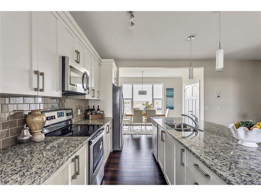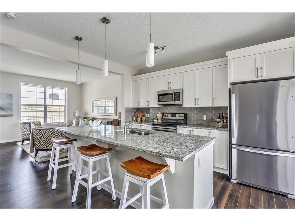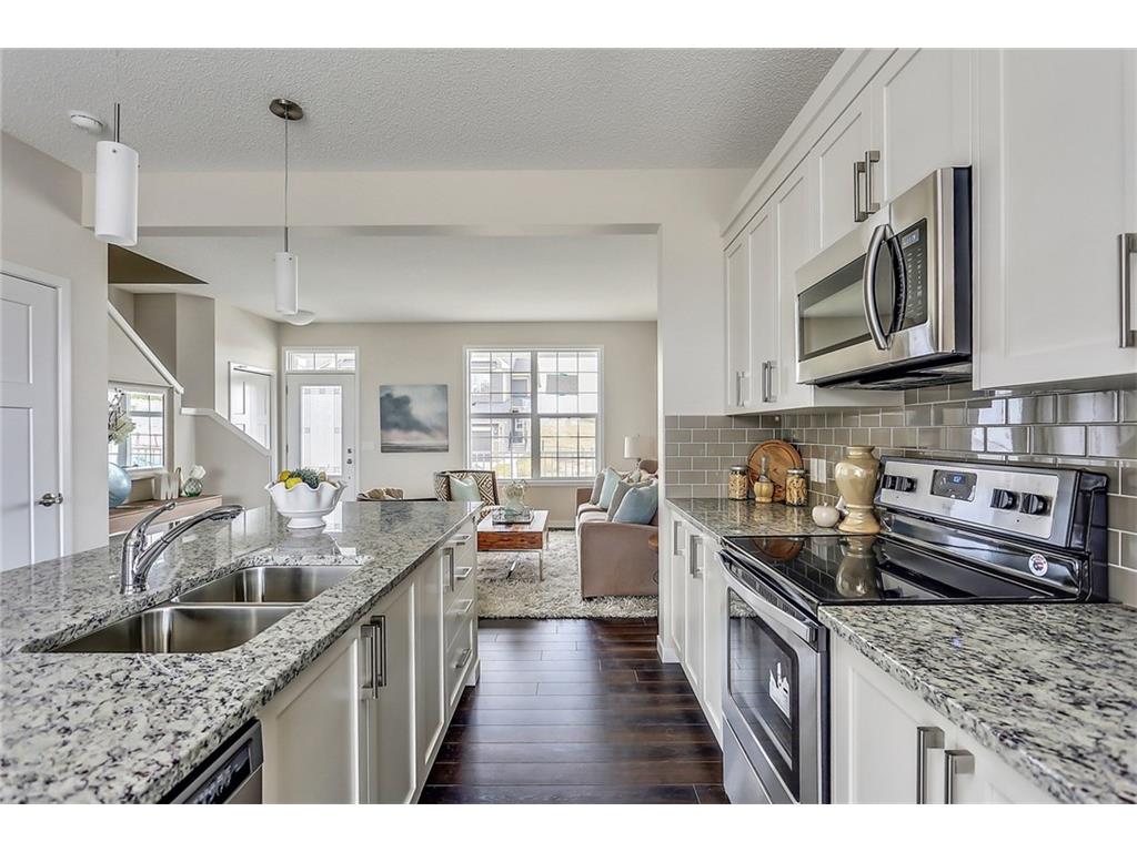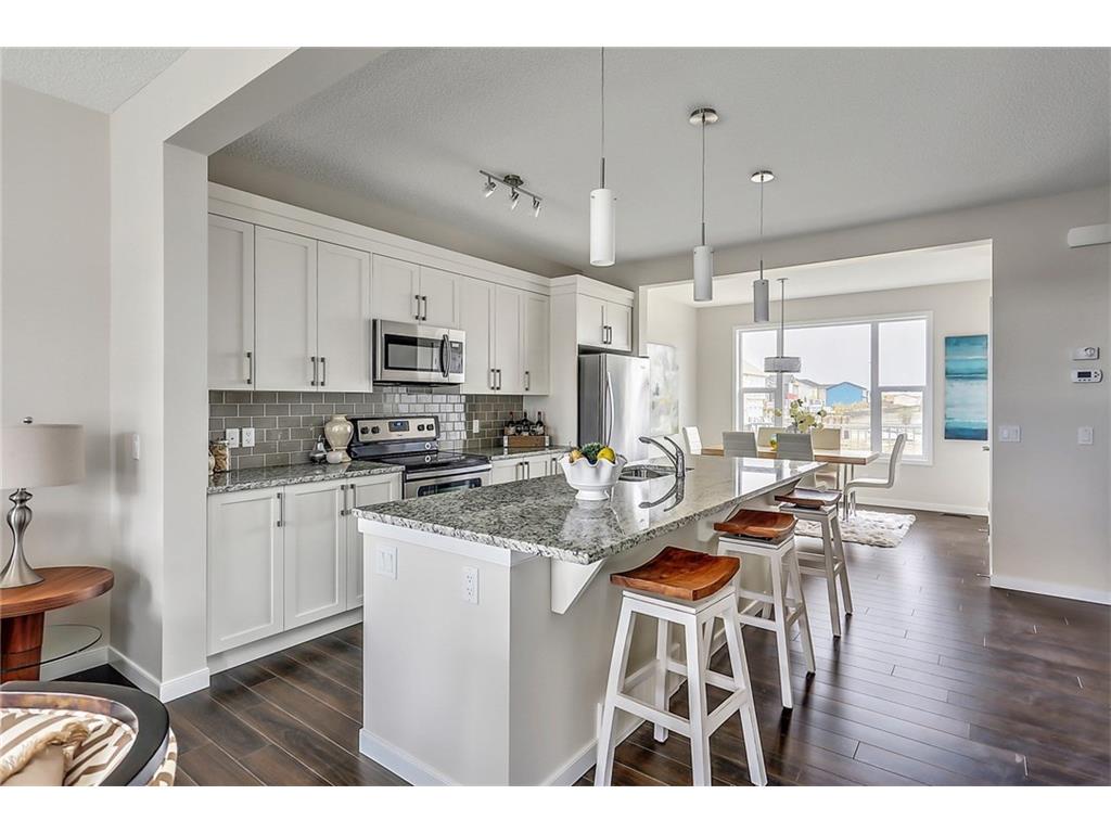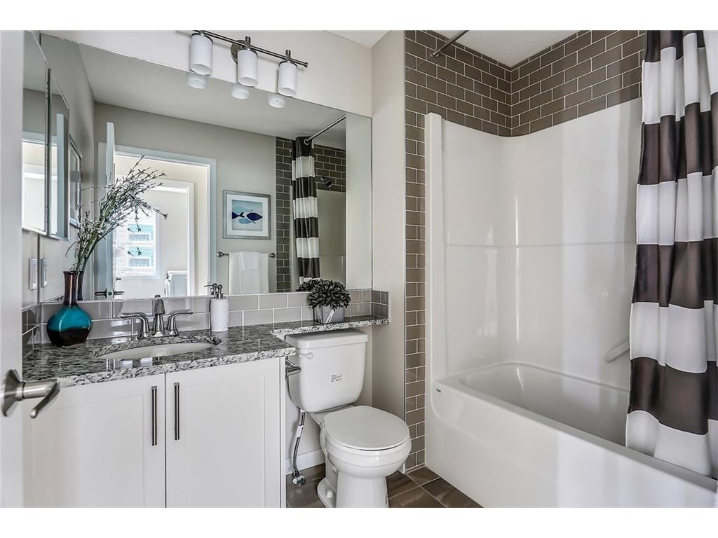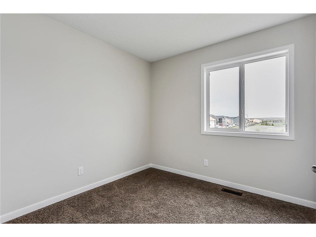 with white cabinets and granite countertops. The upper level includes a master retreat, two additional great-sized bedrooms and upper floor laundry! The large master bedroom can accommodate a bedroom suite of virtually any size and includes a full 5 piece private en suite in addition to its walk-in closet. Many upgrades throughout the home include: laminate and tile flooring, granite countertops, stainless steel appliances, front-load washer and dryer, and a rear deck. This brand new home includes a full Alberta New Home Warranty in addition to it’s builder warranty. Legal fees are included in the purchase. Don’t wait – buy a brand new single family home for under $400,000 today!
