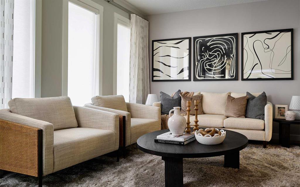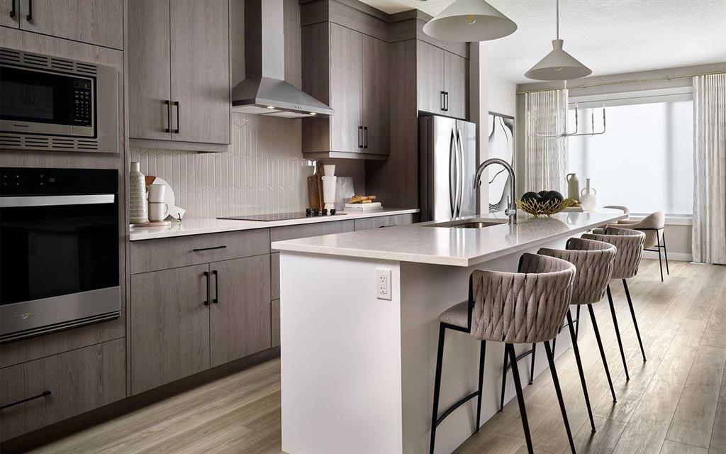 The Sequoia is one of Brookfield Residential’s most popular semi-detached homes that features 2 living spaces, 3 bedrooms, 2.5 bathrooms and nearly 1,500 square feet space over two levels + a full basement – and this is the last one available! This beautifully designed home has an open concept main level that has a central kitchen including a full wall pantry with endless storage. The gourmet kitchen package includes a suite of built-in appliances including a chimney hood fan, built-in gas cooktop, and a built-in microwave and wall-oven. The large great room at the front of the home has a wall of windows allowing natural light to pour through the main level all day long. The back of the home has a large dining area with a window overlooking the backyard and a 2pc bathroom completes the main level. Open railing leads to the second level where there is a central bonus room / flex space that separates the primary suite from secondary rooms. The expansive primary bedroom spans 11’x13′ and is complete with its own private ensuite with a tiled walk-in shower and a walk-in closet. Two more bedrooms, a full bathroom and a laundry room complete the second level. The basement is undeveloped and awaits your finishing touches but already includes 9′ ceilings and 200 amp power! The south-facing backyard is perfect for capturing optimal sunshine all year long. The exterior of the home is complete with fibre cement siding and there is a private backyard in addition to the double parking pad. This property is nearly complete and will be move-in ready this spring – don’t wait! Builder warranty + Alberta New Home Warranty is included with this brand new home. **Please note: Photos are from a show home model and are not an exact representation of the property for sale.