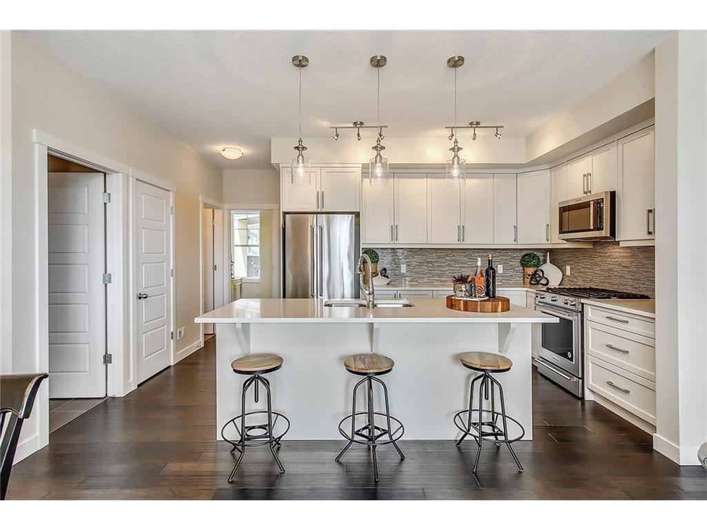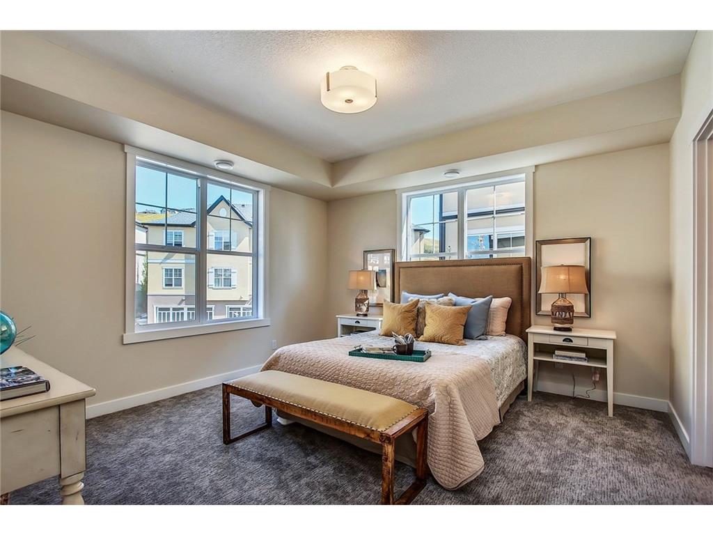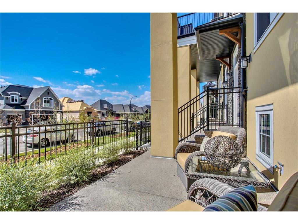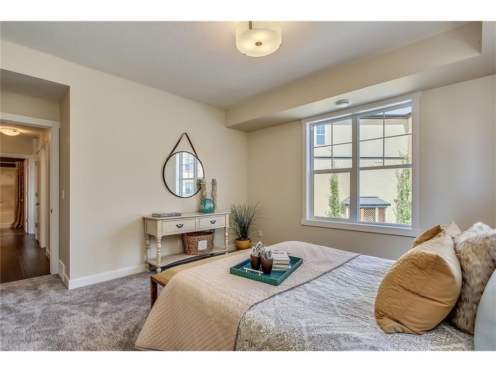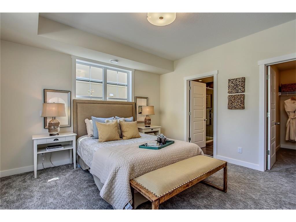 This stunning bungalow townhouse includes comfort, luxury and maintenance-free living in the heart of Riverstone. The open-concept living area features a chef’s kitchen complete with full height cabinetry, mosaic backsplash, Kitchen Aid appliances, quartz countertops and a large island with extended eating bar that overlooks the main living area. Hardwood flooring flows throughout the home offering a seamless design throughout. Living and dining areas are surrounded by windows with West exposure, ensuring natural light flows throughout the property all day long. The large master retreat offers ample room for a king-sized bed in addition to bedroom furniture, a full walk-in closet and ensuite complete with a walk-in shower. Two additional bedrooms create the perfect space for guests or a second bedroom plus den. Ideal for those who are ready to ‘right-size’ without forgoing the luxuries they deserve, Mosaic Riverstone’s ‘Hunter’ combines maintenance-free living with nature.