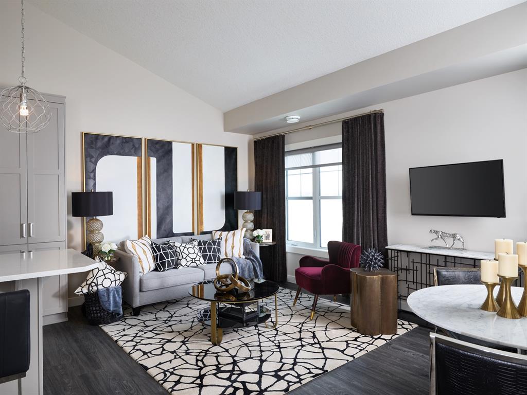 Move in this year and SAVE! Private Balcony & Attached Garage! The Ruby by Brookfield offers apartment pricing with townhome lifestyle, WITH 36″ Cabinets, Rough in A/C, Washer/Dryer, Quartz Countertops, Laminate & Tile Flooring AND Stainless Steel Appliances. With a VAULTED Ceiling in the living room, 9ft ceilings, your own front door , gives this home all the perks of living in a townhome with apartment pricing. Located in the desirable estate community of Riverstone in Cranston, enjoy maintenance-free living while having the luxury of Fish Creek Park outside of your front door. Included is builder warranty, legal fees , 5 & 10 year warranties & 1 year Free Telus. *Photos are from a showhome model and are not an exact representation of the property for sale but is available for viewing.