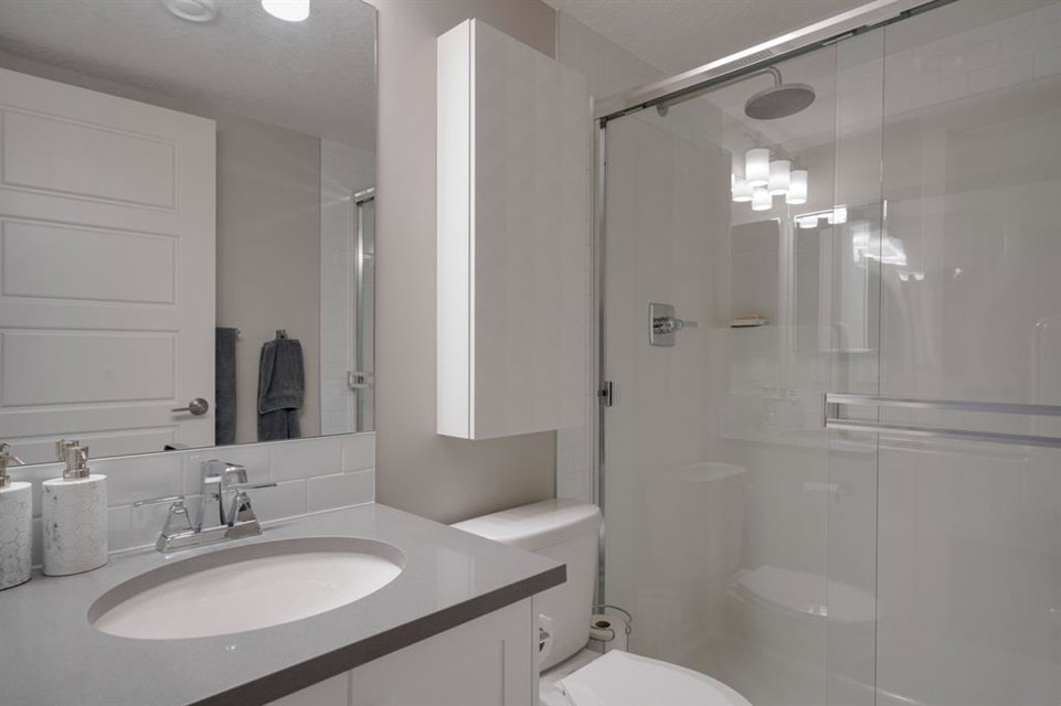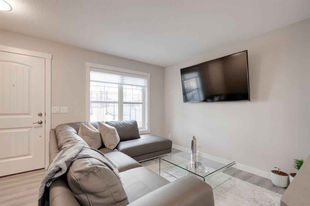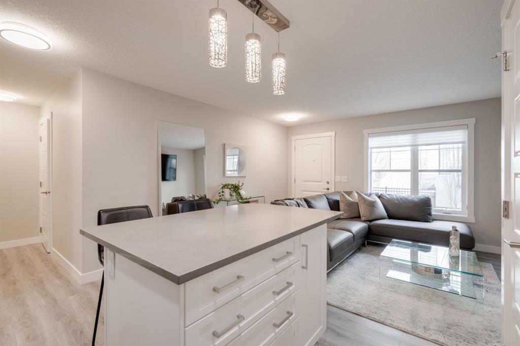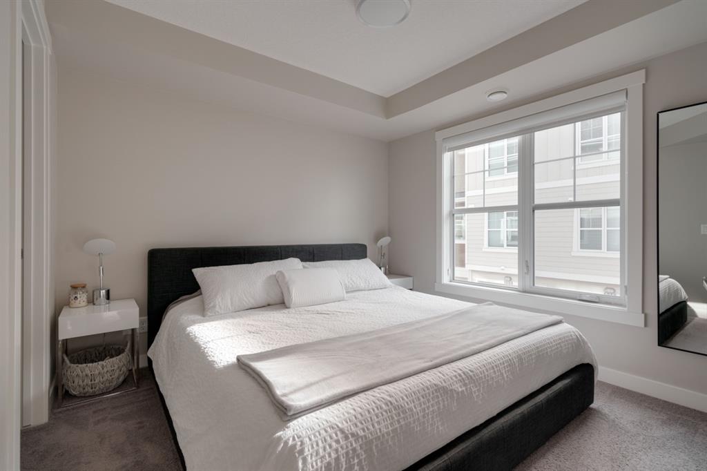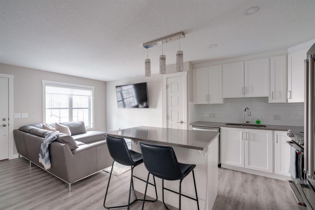 OPEN HOUSE SUNDAY MARCH 27th 1:00-3:00! This beautiful like-new townhouse is absolutely immaculate and features 2 bedrooms, 1 bathroom and an open concept living space with a private double attached (tandem) garage! Located in desirable Riverstone of Cranston, this townhome features resilient vinyl flooring throughout the main living area, tile in the bathroom and warm carpet in the bedrooms. The timeless white kitchen is complete with quartz countertops, subway tile backsplash and upgraded Kitchen Aid appliances. The primary bedroom includes a walk-in closet and the second bedroom is the perfect work-from-home space if desired. The lower level includes additional storage and a double tandem garage to keep your vehicle and valuables safe all year long. Many people who only require space for one vehicle have converted the other half into a home gym space! This like-new townhouse is fully move-in ready and perfect for first-time buyers, downsizers, or investors looking for a great rental property. Low condo fees provide maintenance-free living in this beautiful townhouse just steps from countless parks, paths and the Bow River!