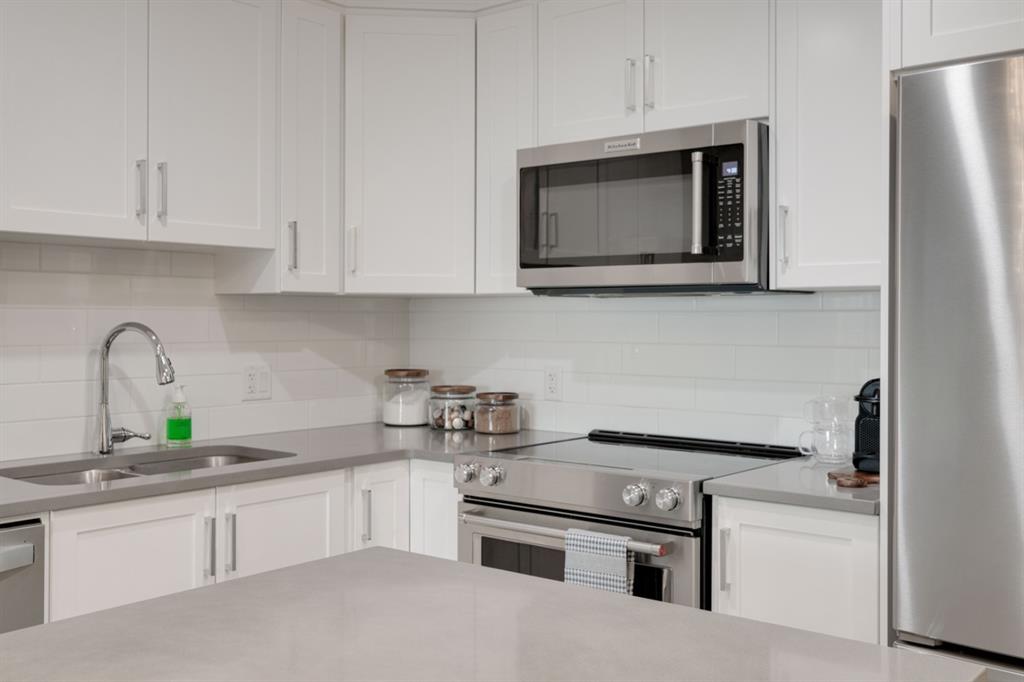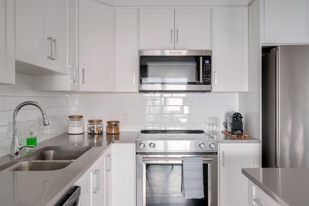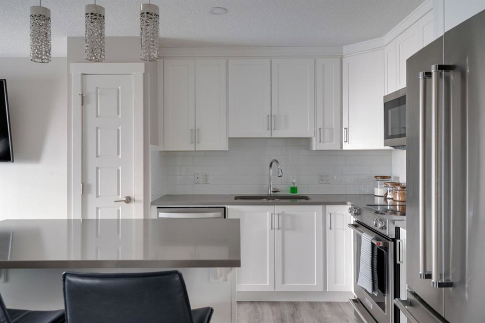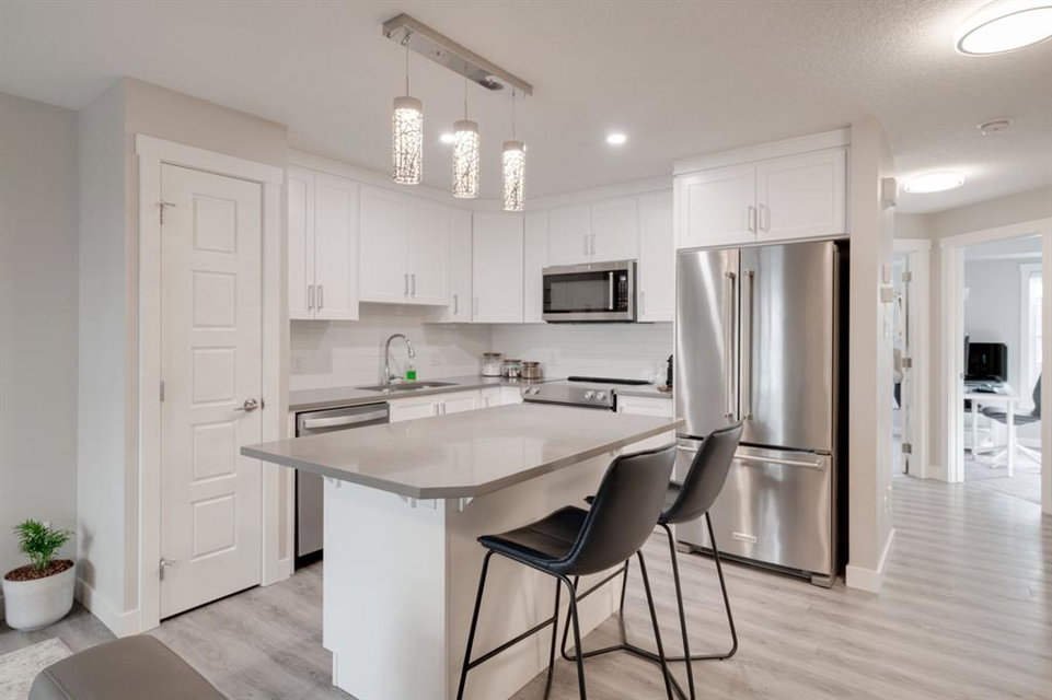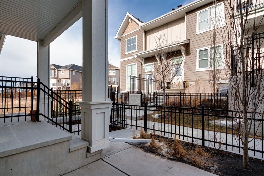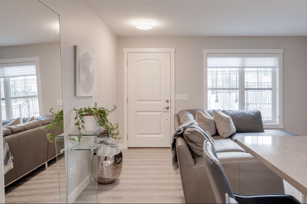 OPEN HOUSE SUNDAY MARCH 27th 1:00-3:00! This beautiful like-new townhouse is absolutely immaculate and features 2 bedrooms, 1 bathroom and an open concept living space with a private double attached (tandem) garage! Located in desirable Riverstone of Cranston, this townhome features resilient vinyl flooring throughout the main living area, tile in the bathroom and warm carpet in the bedrooms. The timeless white kitchen is complete with quartz countertops, subway tile backsplash and upgraded Kitchen Aid appliances. The primary bedroom includes a walk-in closet and the second bedroom is the perfect work-from-home space if desired. The lower level includes additional storage and a double tandem garage to keep your vehicle and valuables safe all year long. Many people who only require space for one vehicle have converted the other half into a home gym space! This like-new townhouse is fully move-in ready and perfect for first-time buyers, downsizers, or investors looking for a great rental property. Low condo fees provide maintenance-free living in this beautiful townhouse just steps from countless parks, paths and the Bow River!