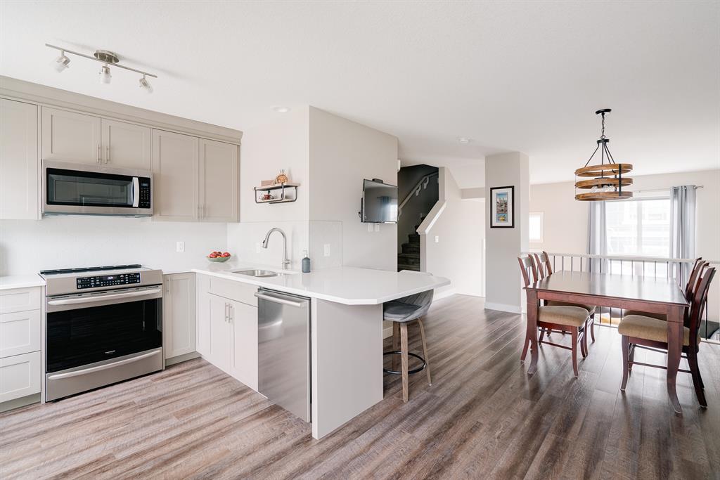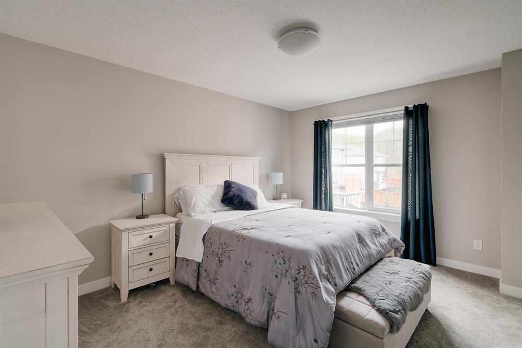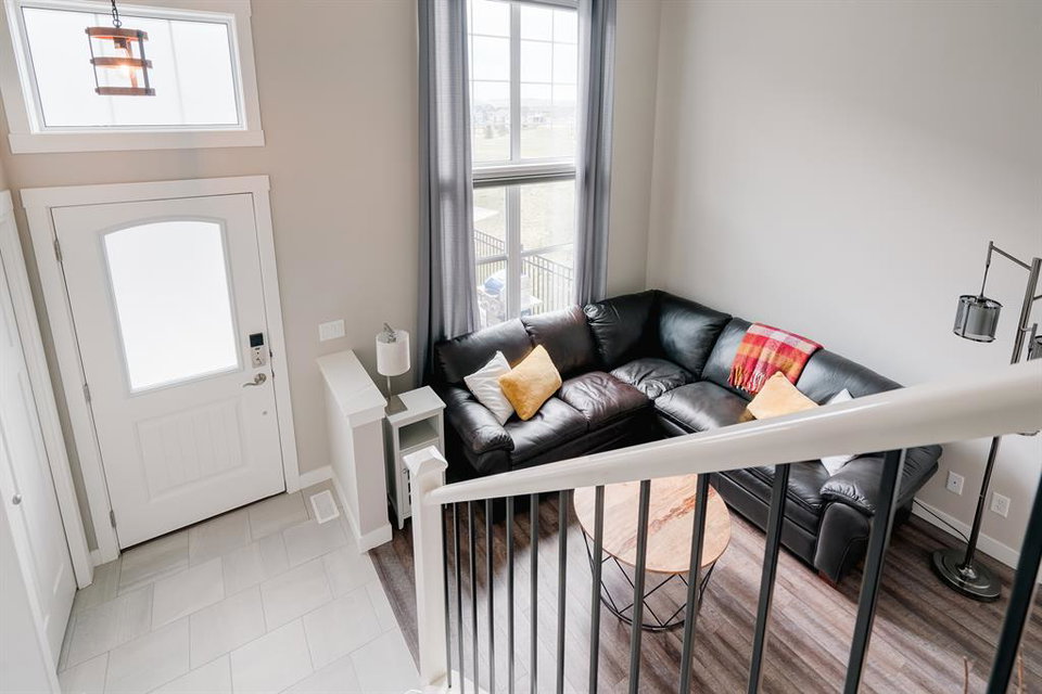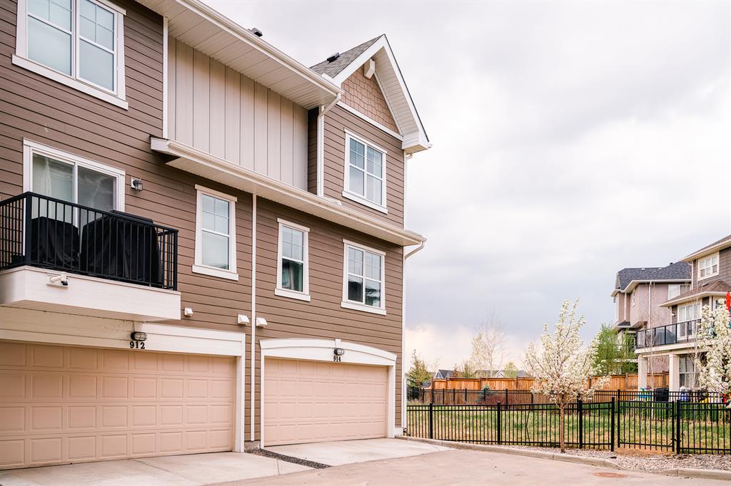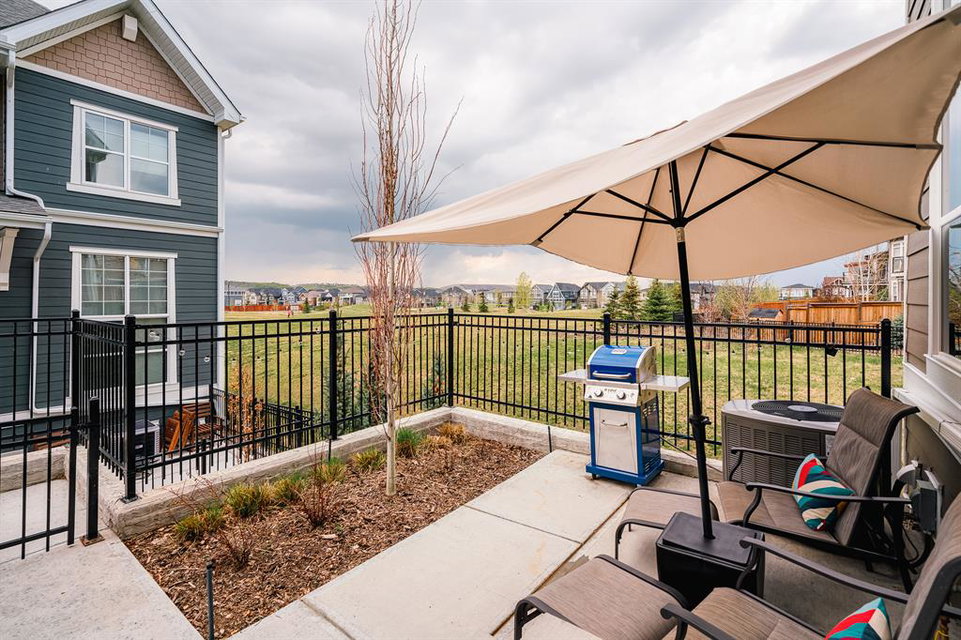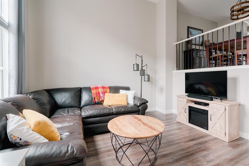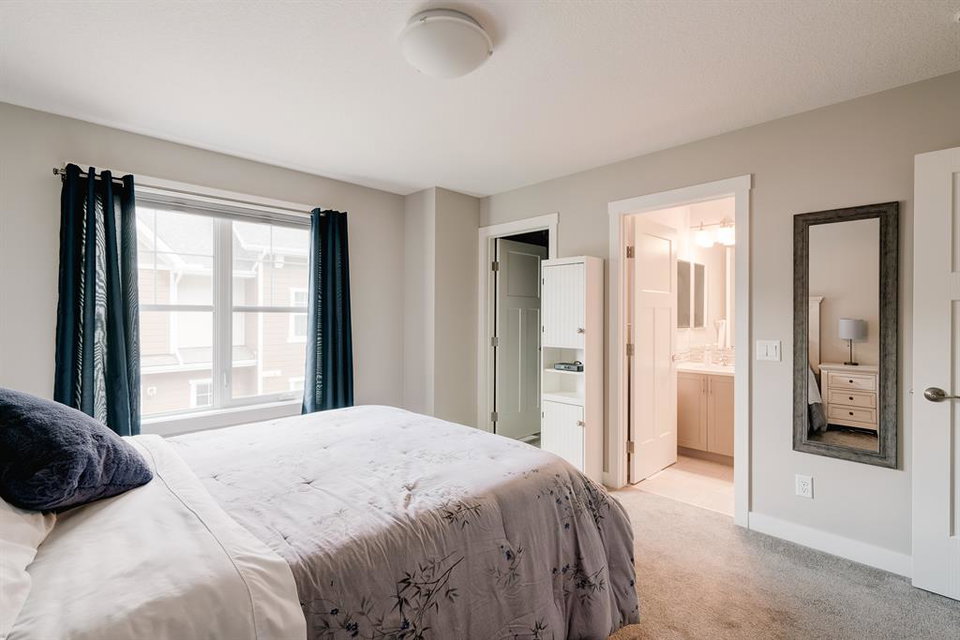 A stunning like-new townhouse located in the heart of Riverstone and siding onto a park! This beautiful end-unit townhouse is located at The Retreat, Riverstone’s newest townhouse development. Featuring over 1,100 square feet of living space on two levels, this home offers 2 primary bedrooms, both complete with their own ensuites, and a spacious living area with a sunken living room including 10′ windows and SW sunshine! The bright and sunny living room is located at the front entrance and has windows overlooking the park / green space. The timeless kitchen has cabinets to the ceiling, upgraded appliances, quartz countertops and extended countertop for additional seating. The kitchen overlooks the spacious dining area and the lower living room. Primary bedroom one is complete with a 3 pc ensuite with walk-in shower and primary bedroom two has a 4 pc ensuite. Walk-in closets with custom cabinetry completes both bedrooms! Murphy bed and shelving in bedroom two are included. The laundry space is conveniently located on the upper level. The basement level has plenty of additional storage space and could also be used as a workout space. The private double attached garage keeps your vehicles and valuables safe all year long! The sunny SW facing front patio is the perfect spot to relax while overlooking the park from an elevated and private setting. If the sunshine becomes too much, the central A/C will keep you cool and comfortable all summer long! This immaculate home has one of the best locations at the entire site and is fully move-in ready.