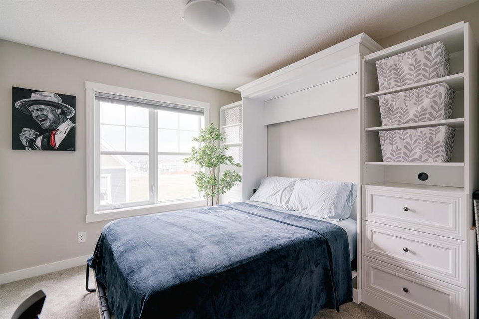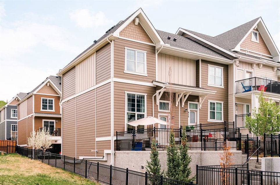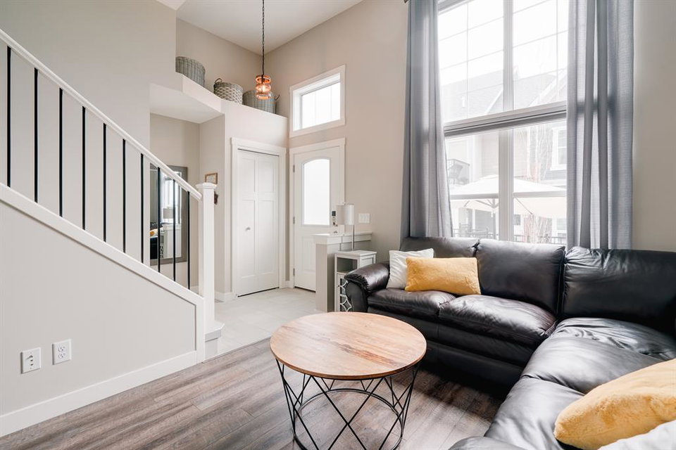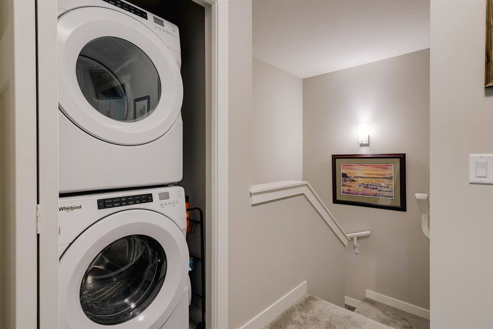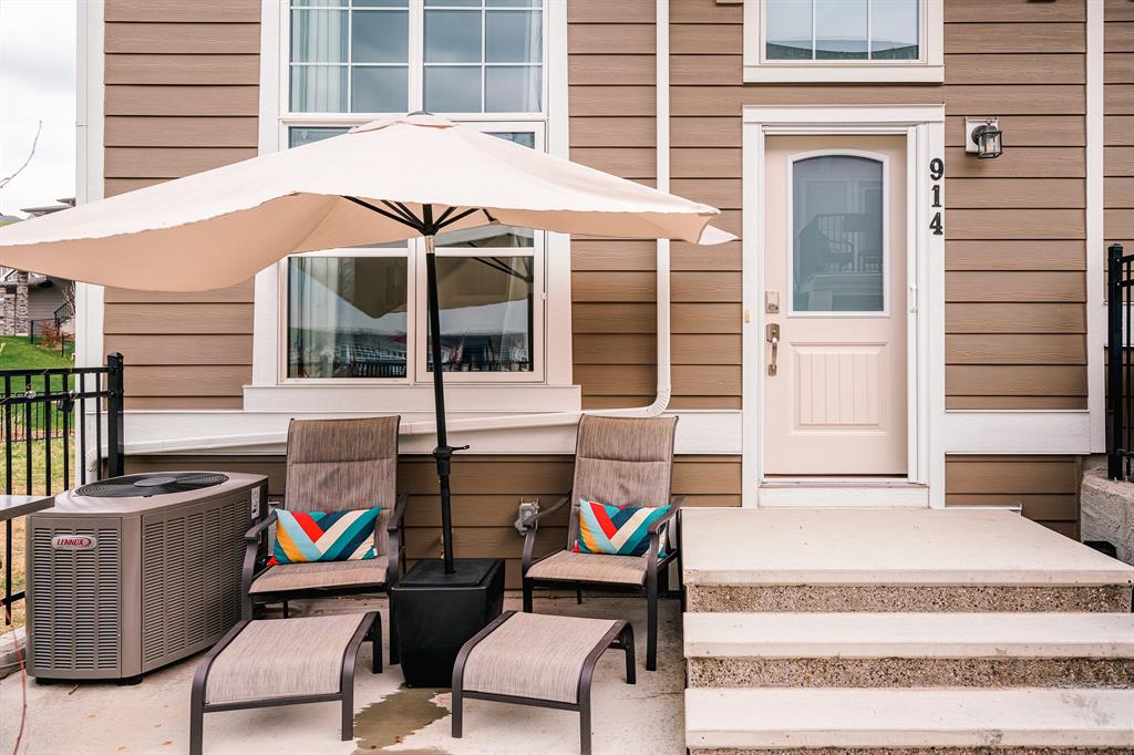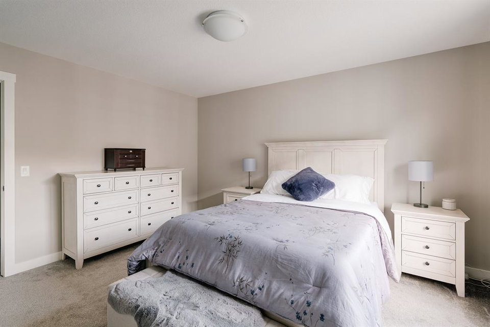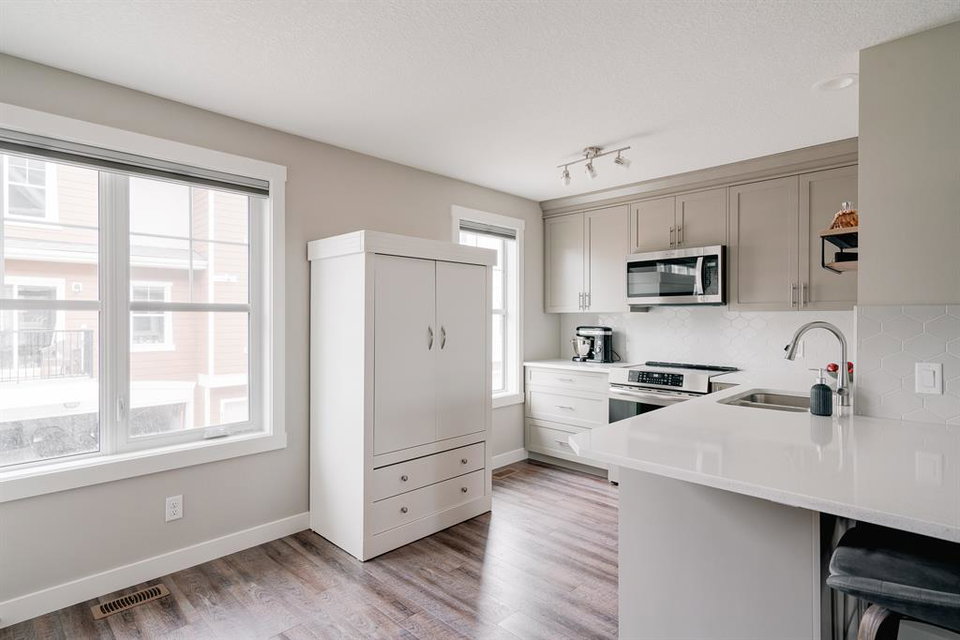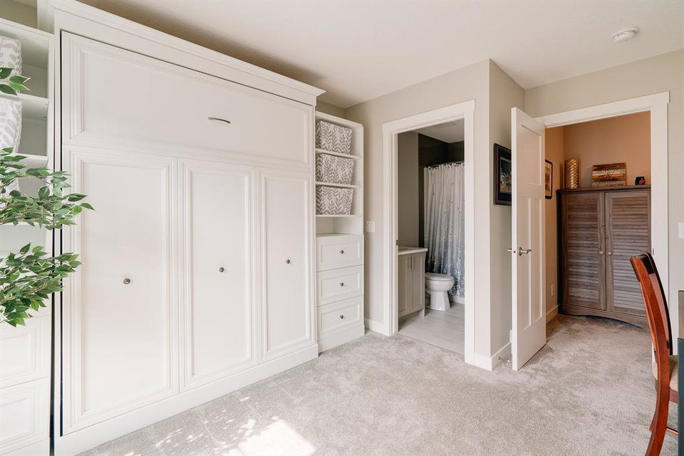A stunning like-new townhouse located in the heart of Riverstone and siding onto a park! This beautiful end-unit townhouse is located at The Retreat, Riverstone’s newest townhouse development. Featuring over 1,100 square feet of living space on two levels, this home offers 2 primary bedrooms, both complete with their own ensuites, and a spacious living area with a sunken living room including 10′ windows and SW sunshine! The bright and sunny living room is located at the front entrance and has windows overlooking the park / green space. The timeless kitchen has cabinets to the ceiling, upgraded appliances, quartz countertops and extended countertop for additional seating. The kitchen overlooks the spacious dining area and the lower living room. Primary bedroom one is complete with a 3 pc ensuite with walk-in shower and primary bedroom two has a 4 pc ensuite. Walk-in closets with custom cabinetry completes both bedrooms! Murphy bed and shelving in bedroom two are included. The laundry space is conveniently located on the upper level. The basement level has plenty of additional storage space and could also be used as a workout space. The private double attached garage keeps your vehicles and valuables safe all year long! The sunny SW facing front patio is the perfect spot to relax while overlooking the park from an elevated and private setting. If the sunshine becomes too much, the central A/C will keep you cool and comfortable all summer long! This immaculate home has one of the best locations at the entire site and is fully move-in ready.